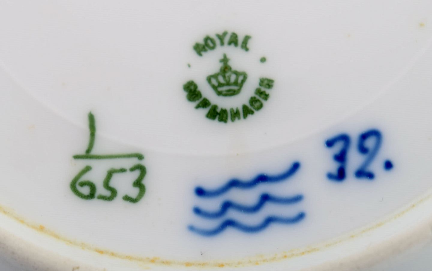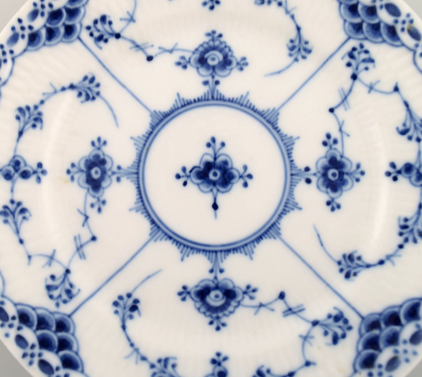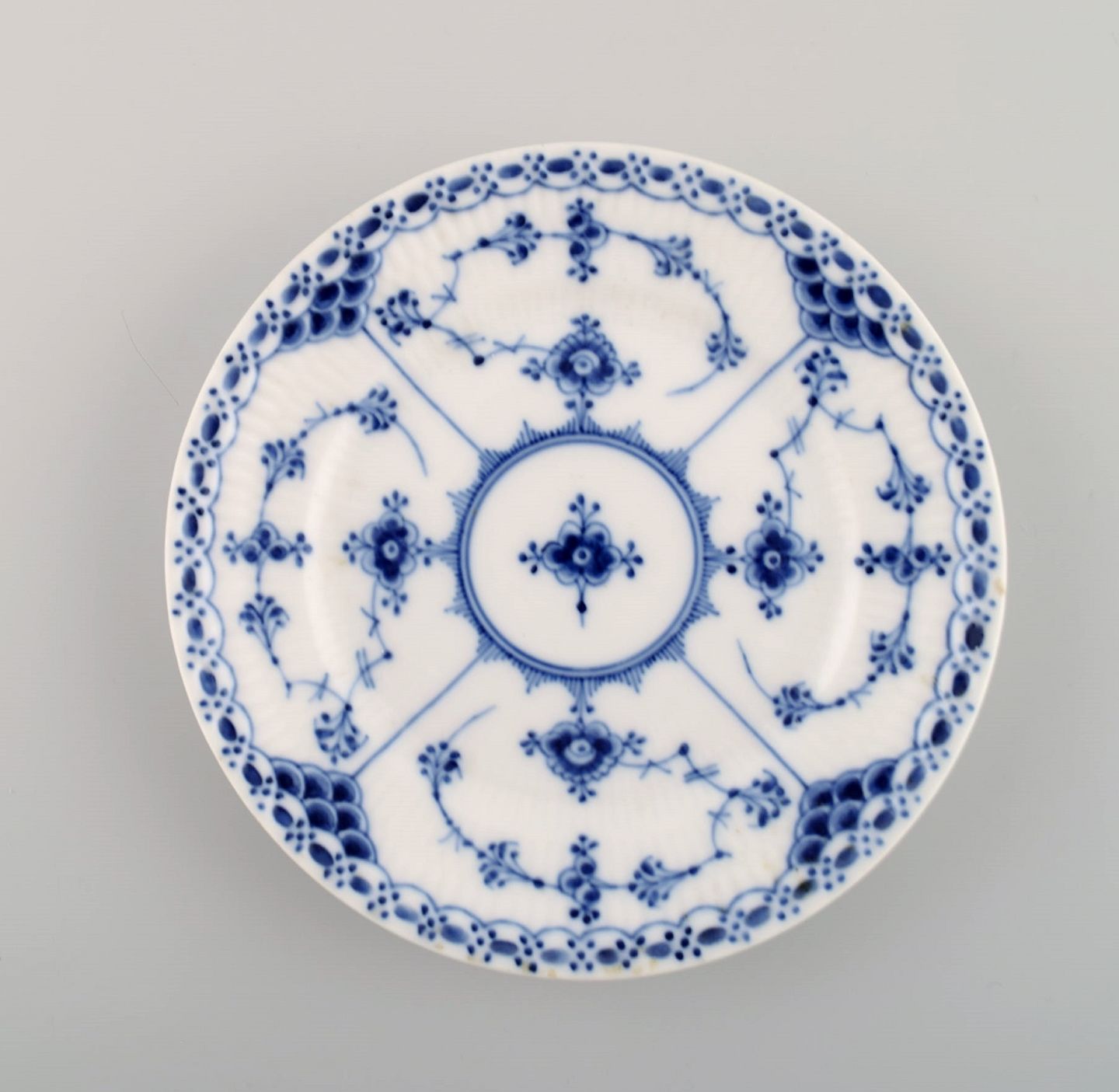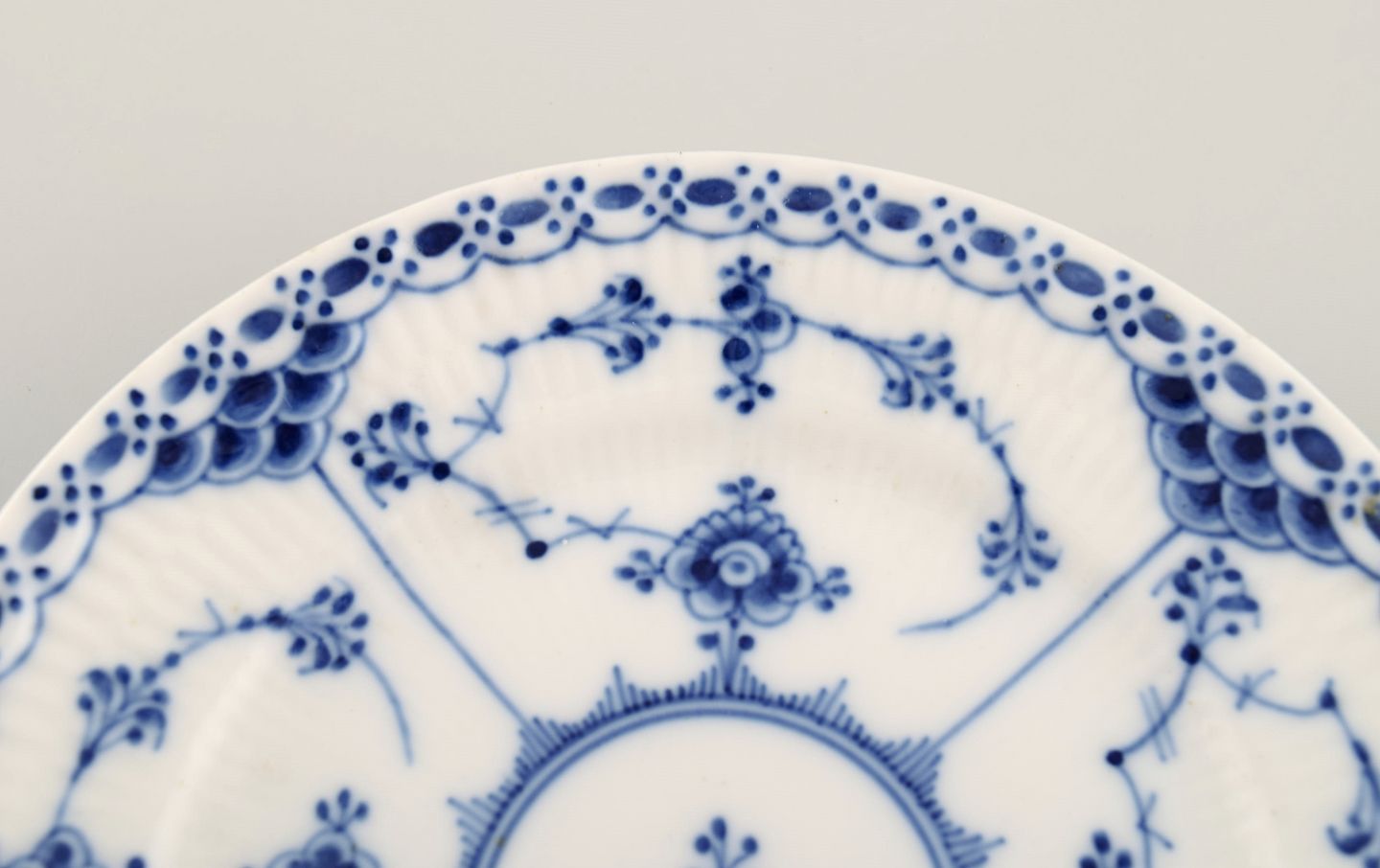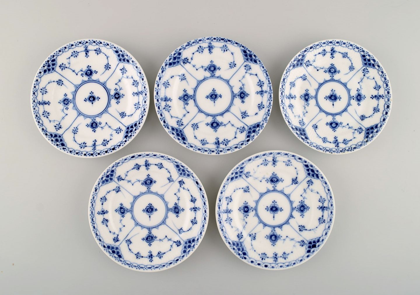 Five antique Royal Copenhagen Blue Fluted Half Lace cake Plates. Model number 1/653. Dated 1889 - 1922. Diameter: 14.6 cm. In excellent condition. 1st factory quality. Stamped.