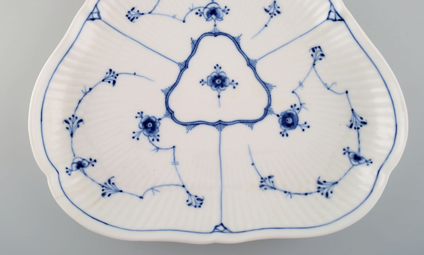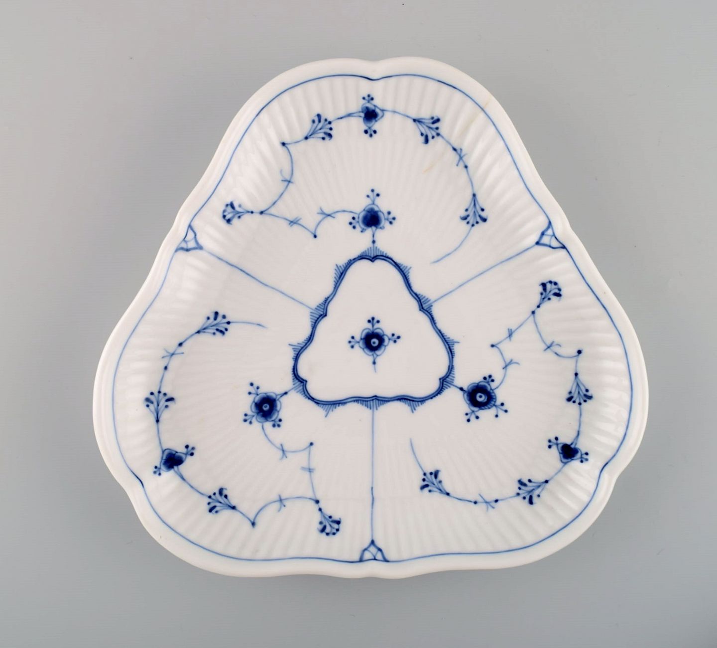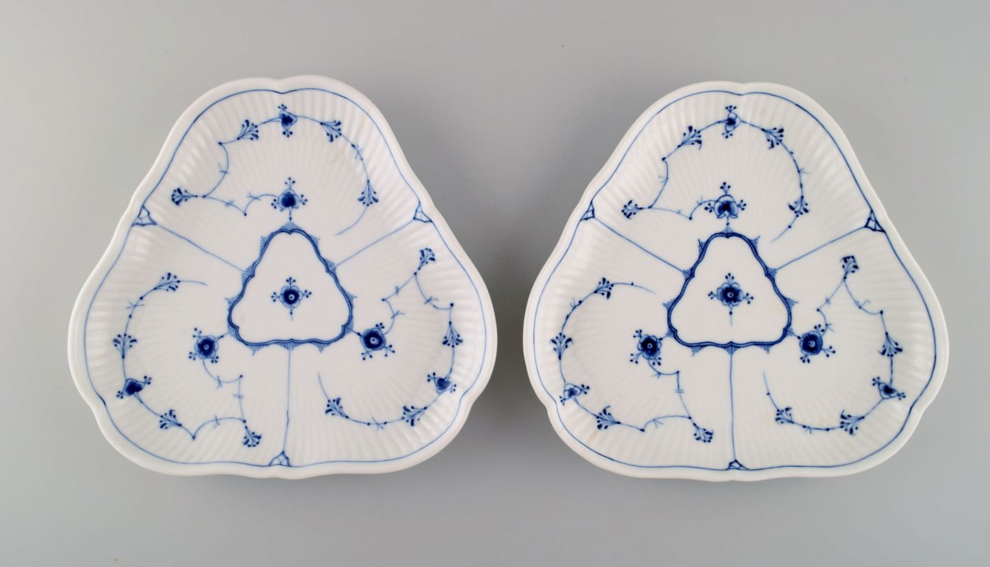 Two antique triangular Royal Copenhagen Blue Fluted Plain dishes. Mid-19th century. Measures: 23 x 3.3 cm. In good condition. Both dishes with hairline cracks. 1st factory quality. Stamped.