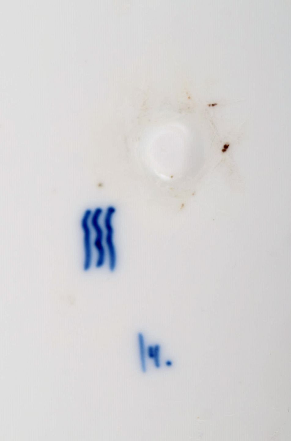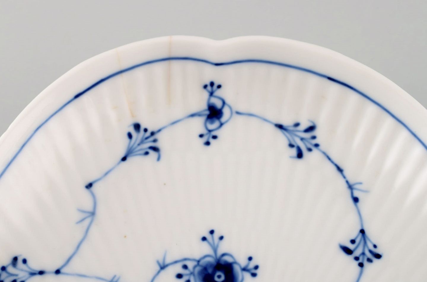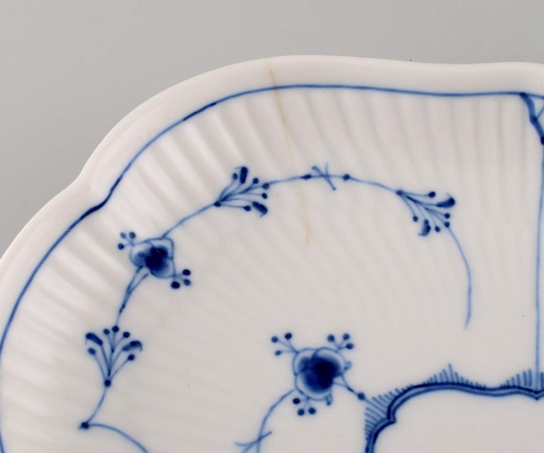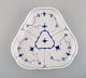 Two antique triangular Royal Copenhagen Blue Fluted Plain dishes. Mid-19th century. Measures: 23 x 3.3 cm. In good condition. Both dishes with hairline cracks. 1st factory quality. Stamped.
