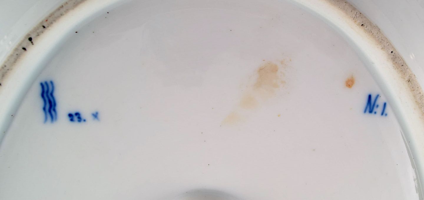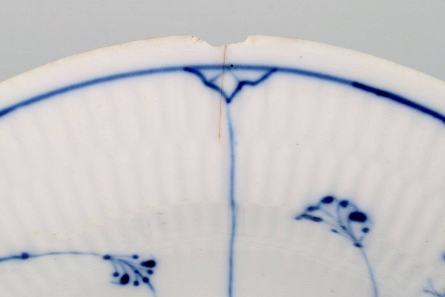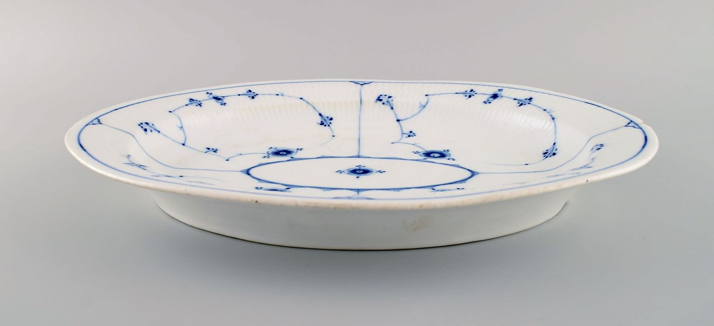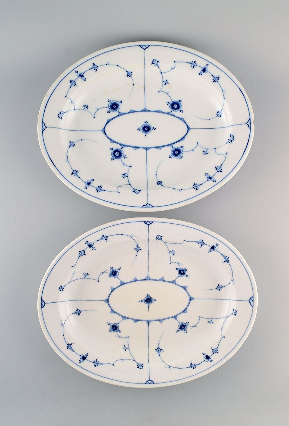 To antikke Royal Copenhagen Musselmalet Riflet serveringsfade. Tidligt 1800-tallet. Måler: 37 x 29 x 4,8 cm. I god stand. Begge fade med små skår. 1. sortering. Stemplet.