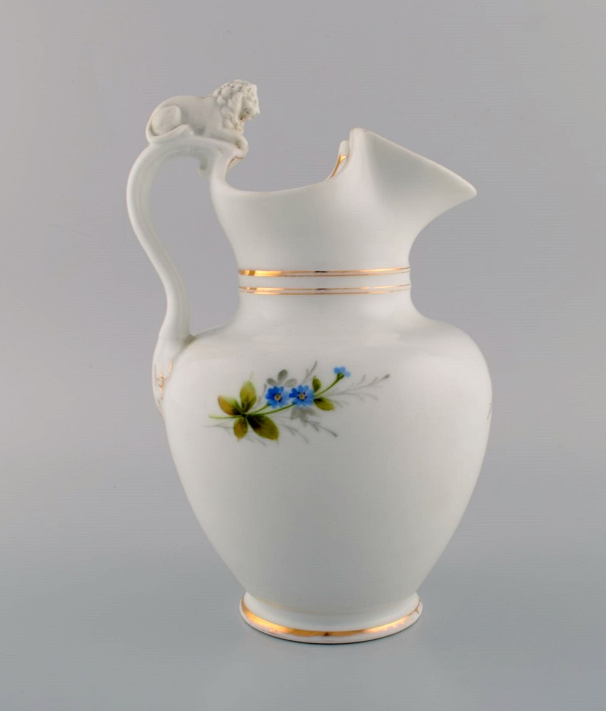 Antik Bing & Grøndahl chokoladekande i porcelæn modeleret med løve på hanken. Håndmalede blomster og gulddekoration. 1870'erne.