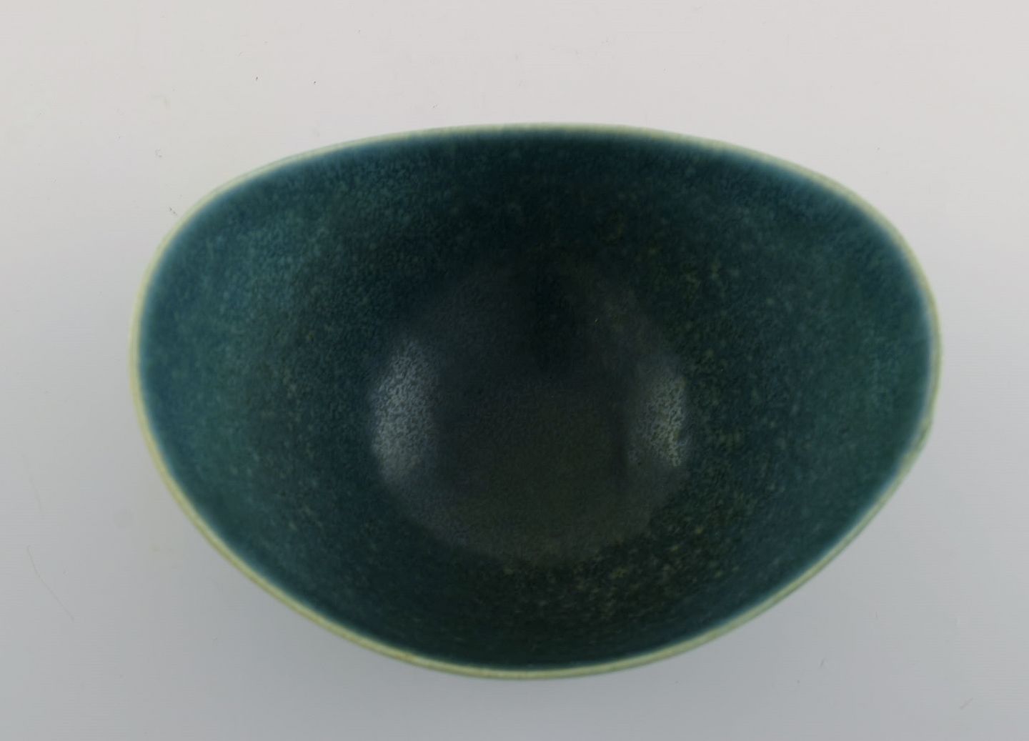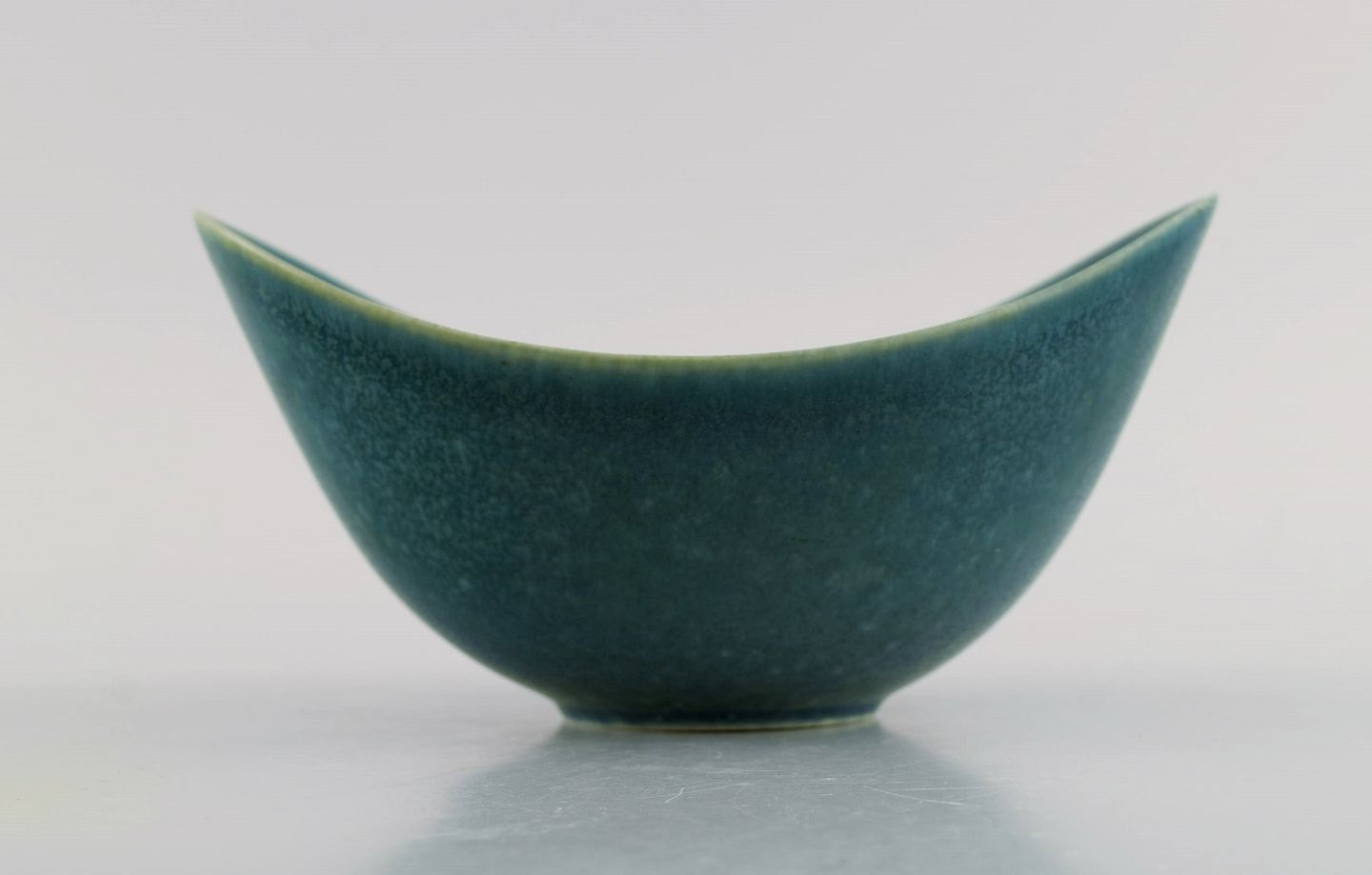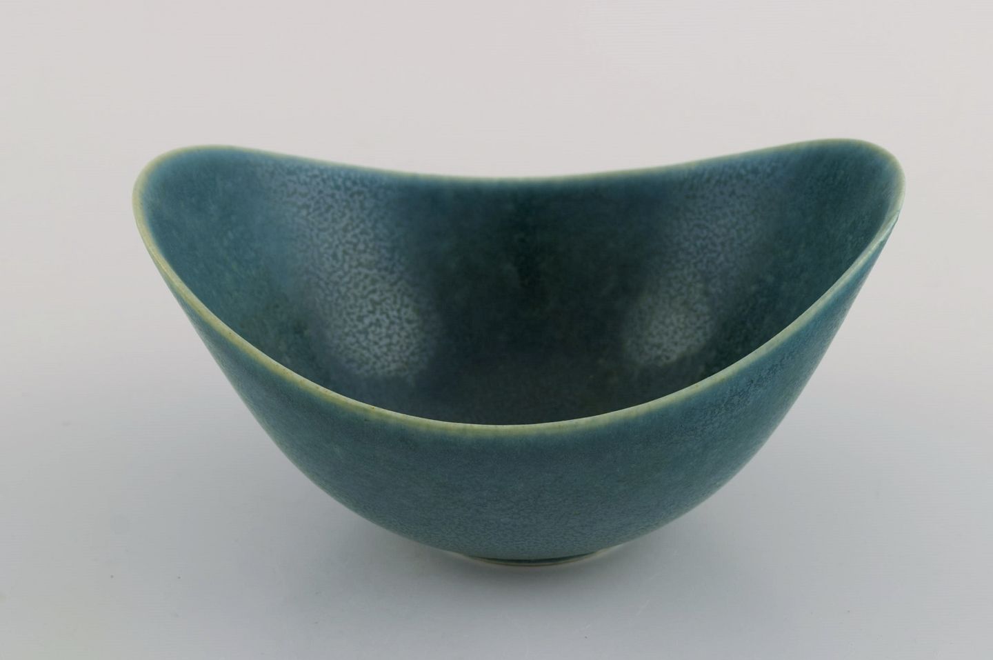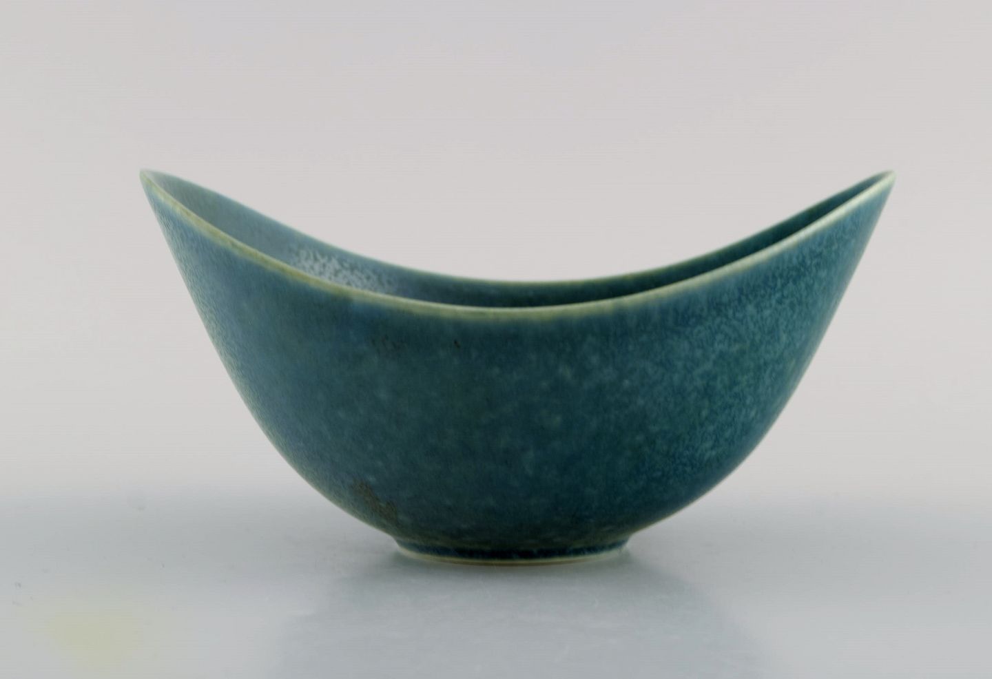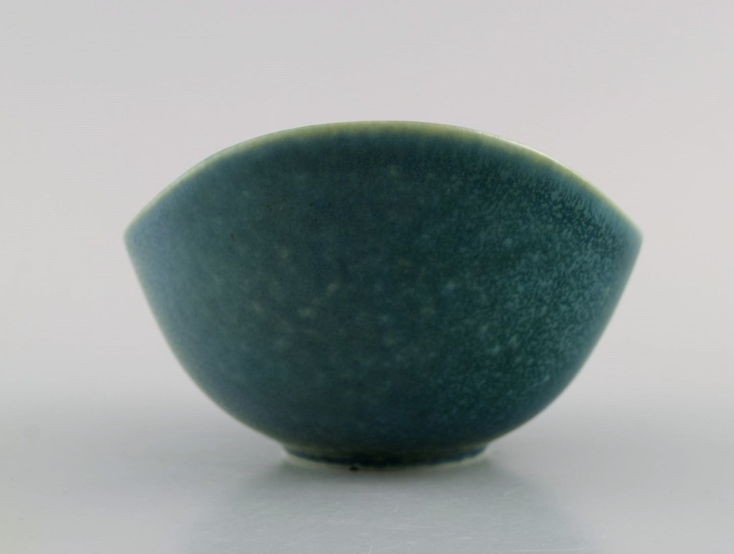 Gunnar Nylund for Rörstrand. Skål i glaseret keramik. Smuk spættet glasur i blågrønne nuancer. 1960'erne. Måler: 16 x 8,3 cm. I flot stand. Stemplet. 2. Sortering