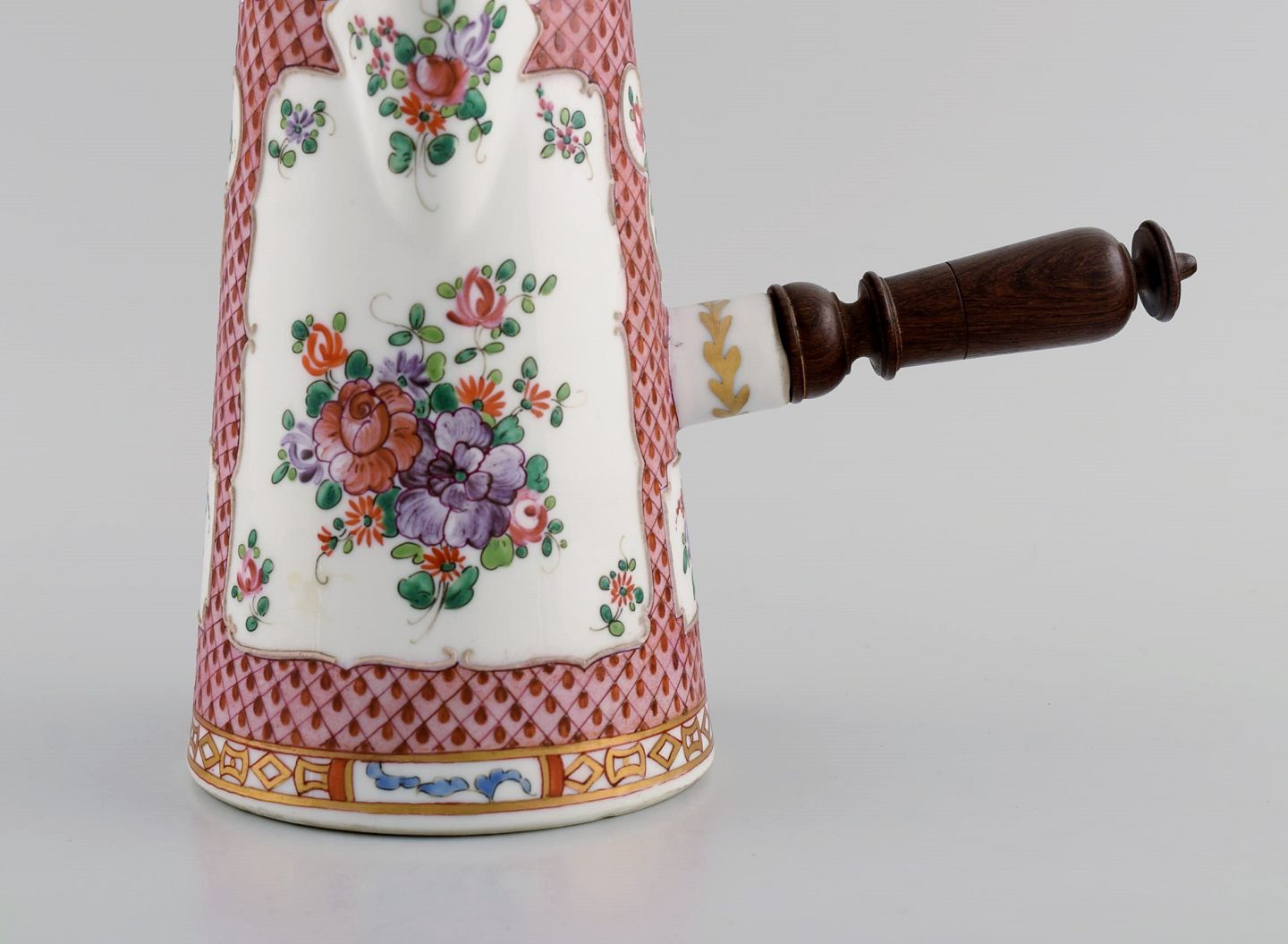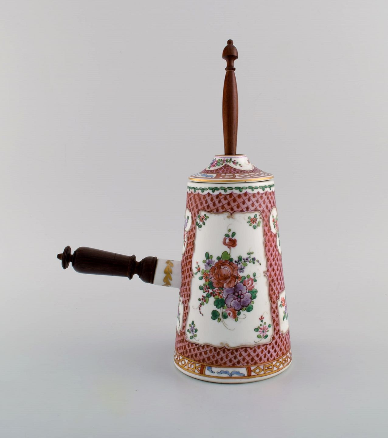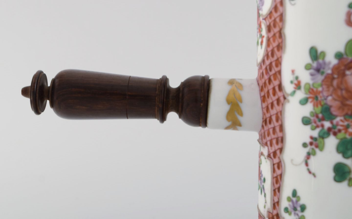 Antik kinesisk chokoladekande i håndmalet porcelæn med blomster og gulddekoration. Hank og rørepind i drejet træ. 17/1800-tallet.