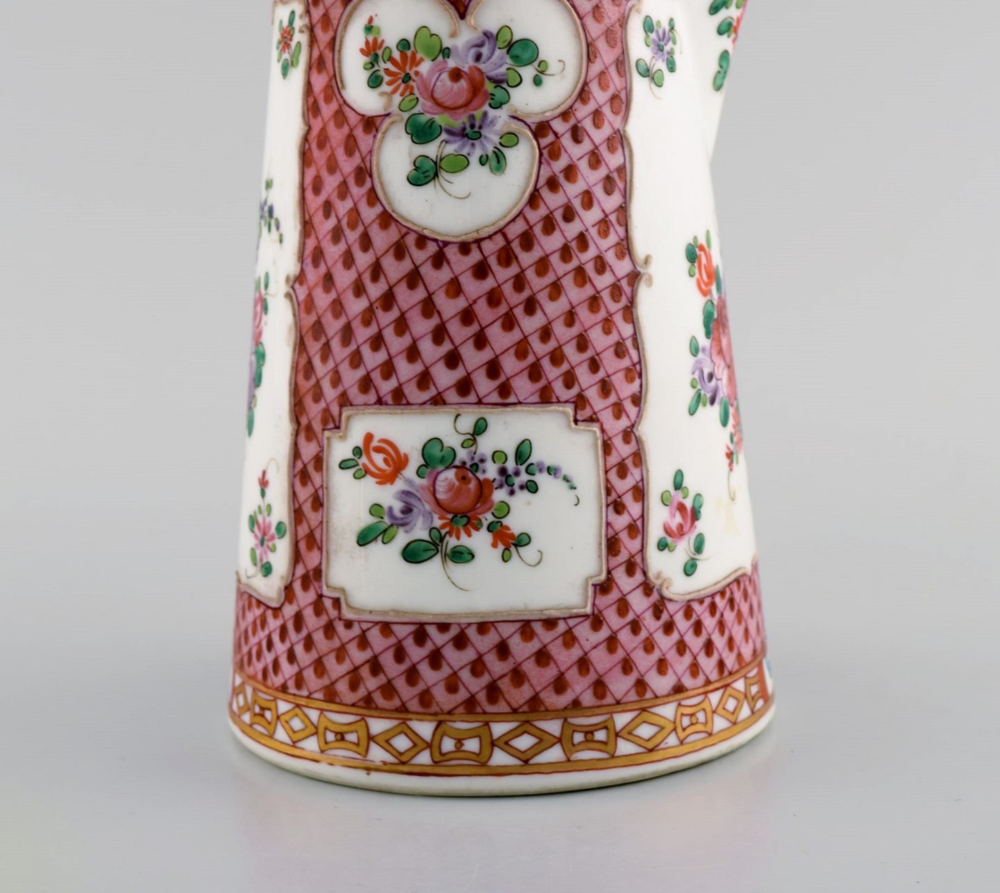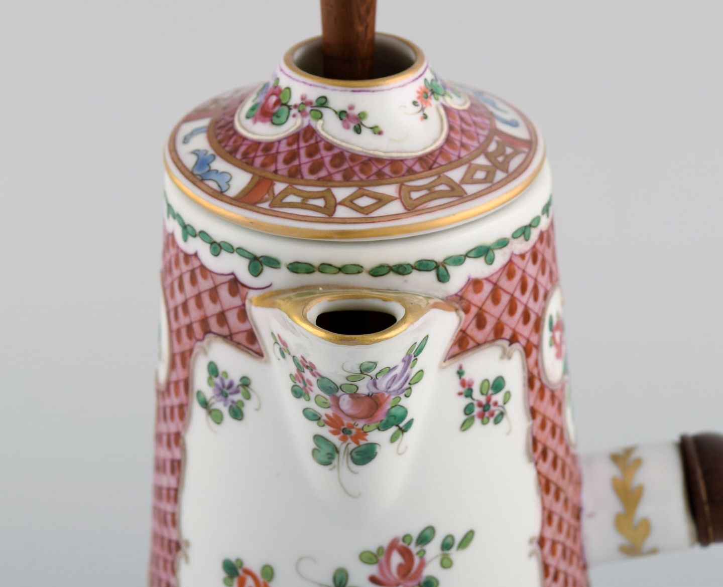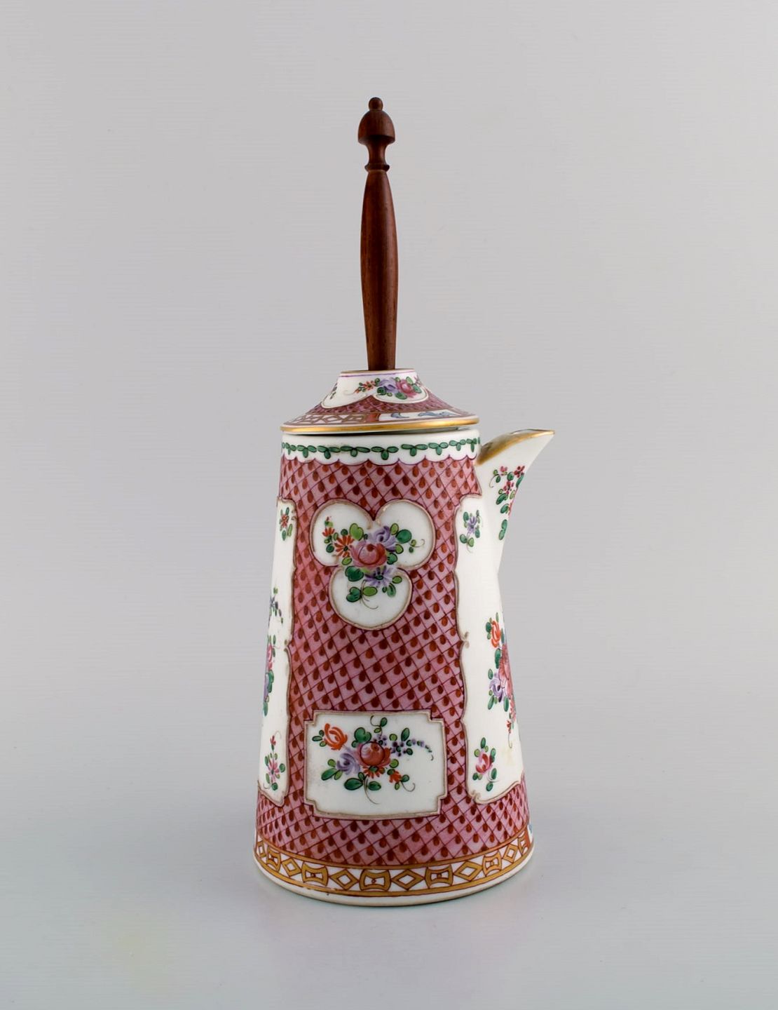 Antik kinesisk chokoladekande i håndmalet porcelæn med blomster og gulddekoration. Hank og rørepind i drejet træ. 17/1800-tallet.