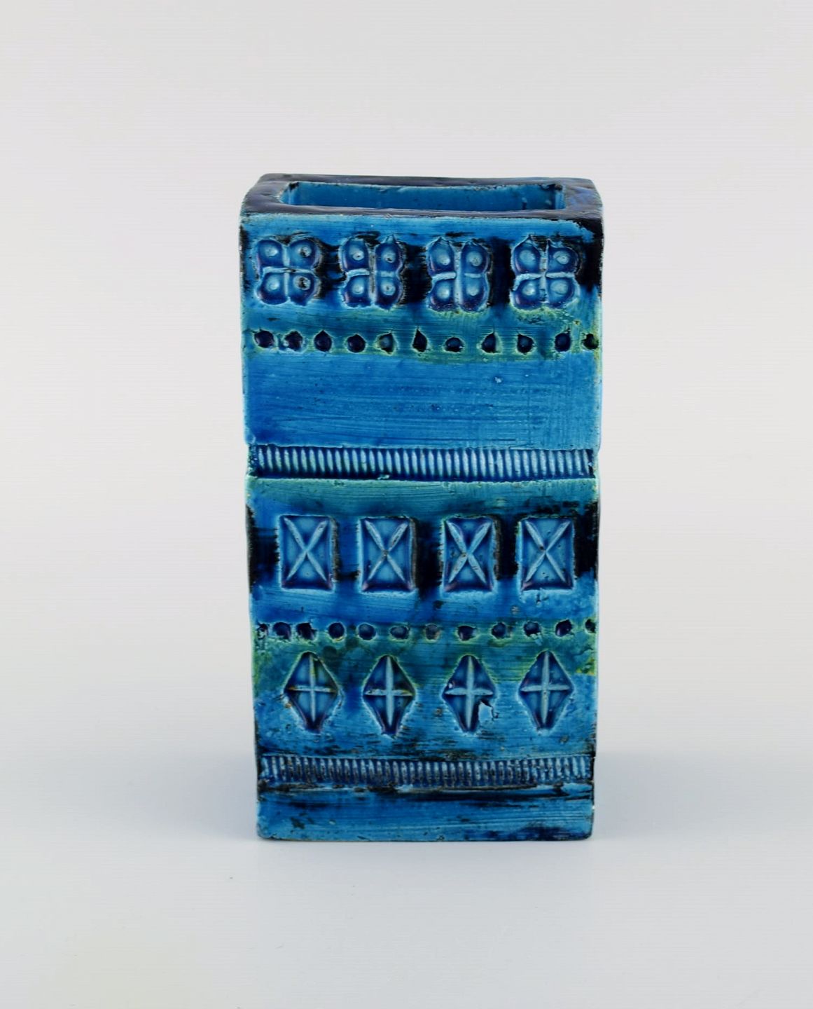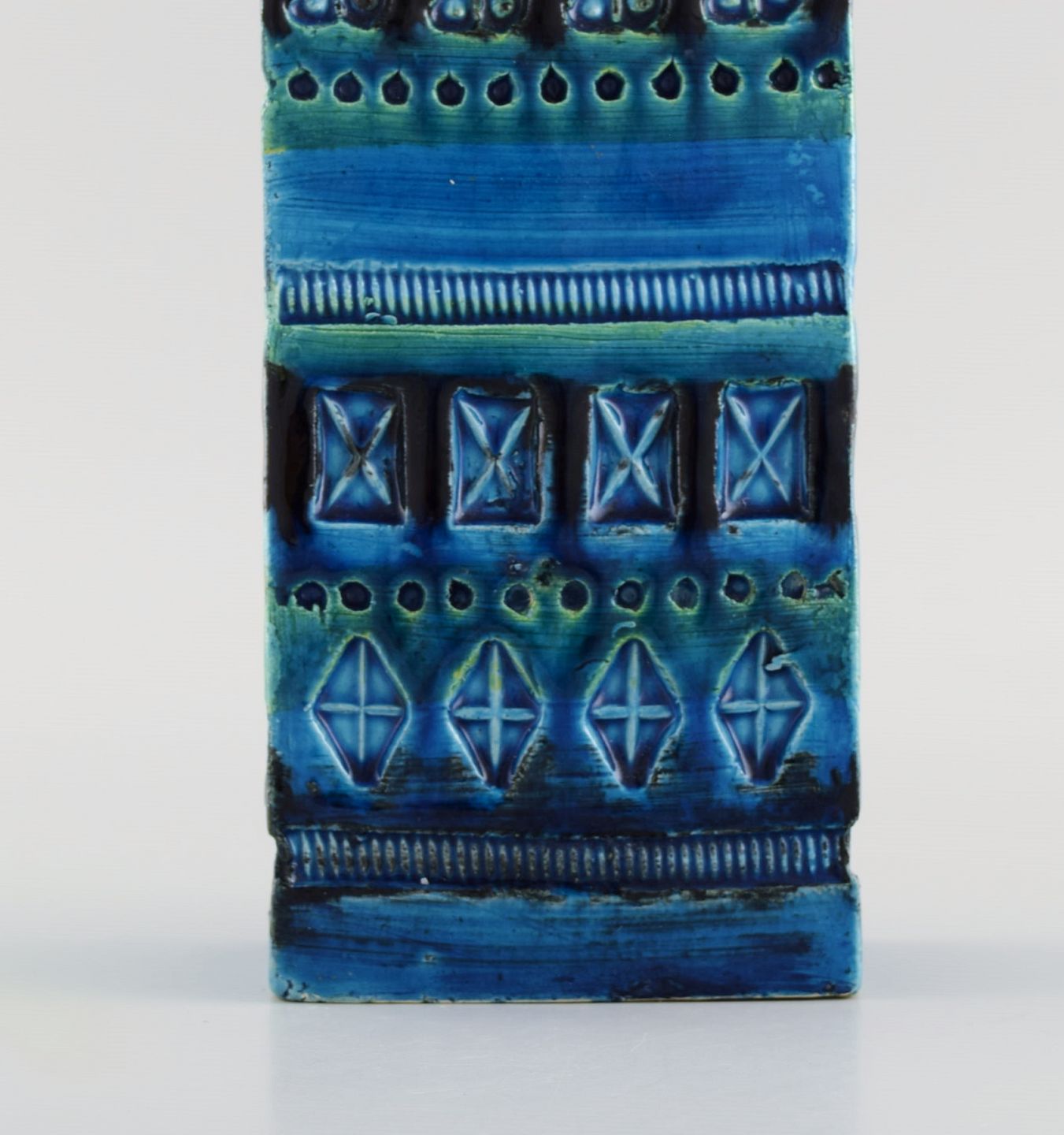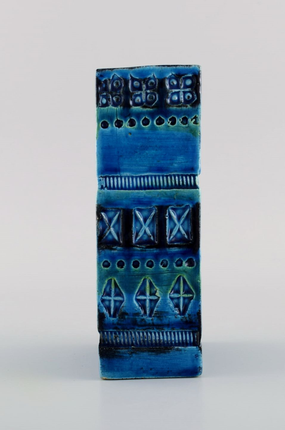 Aldo Londi for Bitossi. Vase i Rimini-blå glaseret keramik med geometriske mønstre. 1960'erne. Måler: 16 x 8,5 x 5,5 cm. I flot stand. Stemplet.