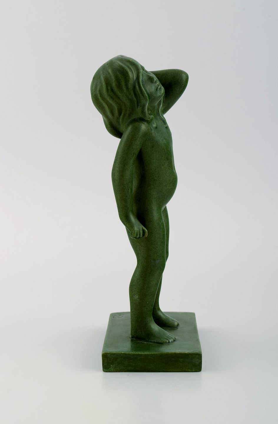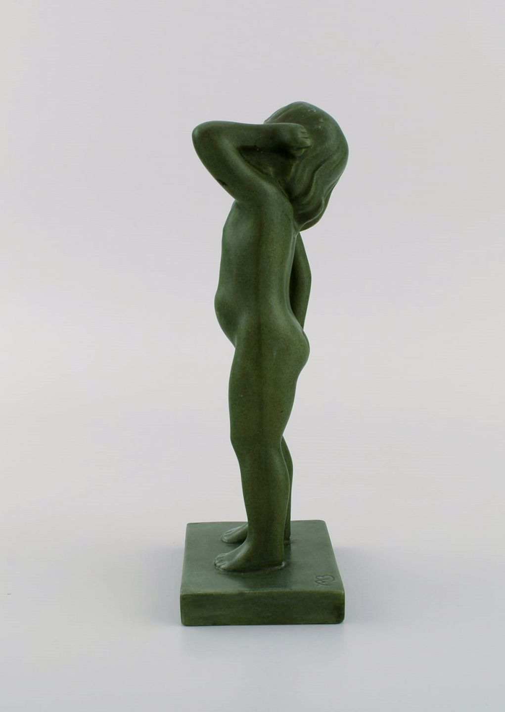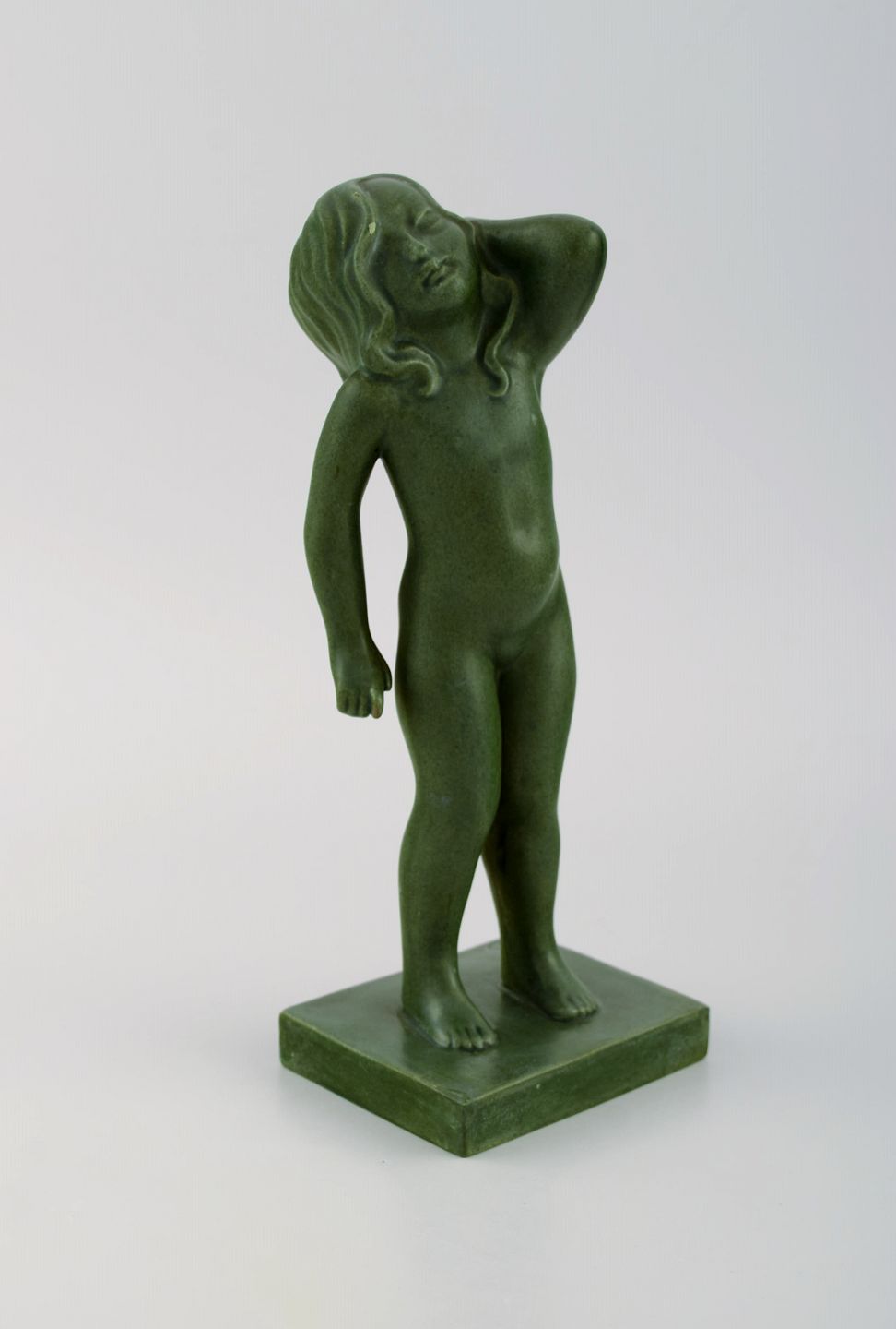Arne Bang for Ipsen's, Denmark. Rare figure in jade green glazed ceramics. Naked girl. Model 916. 1920s / 30s. Measures: 21.5 x 8.5 cm. In excellent condition. Stamped.