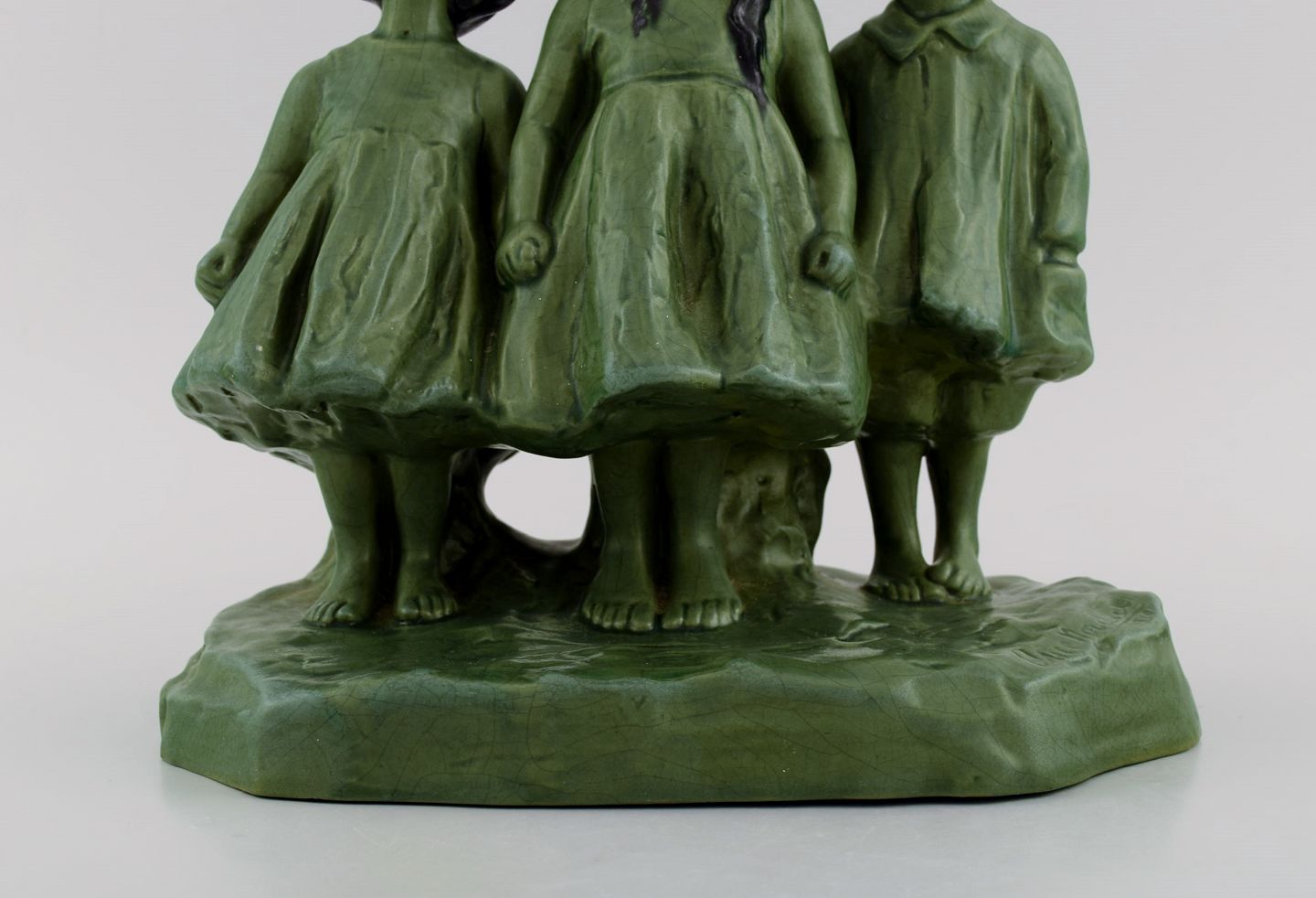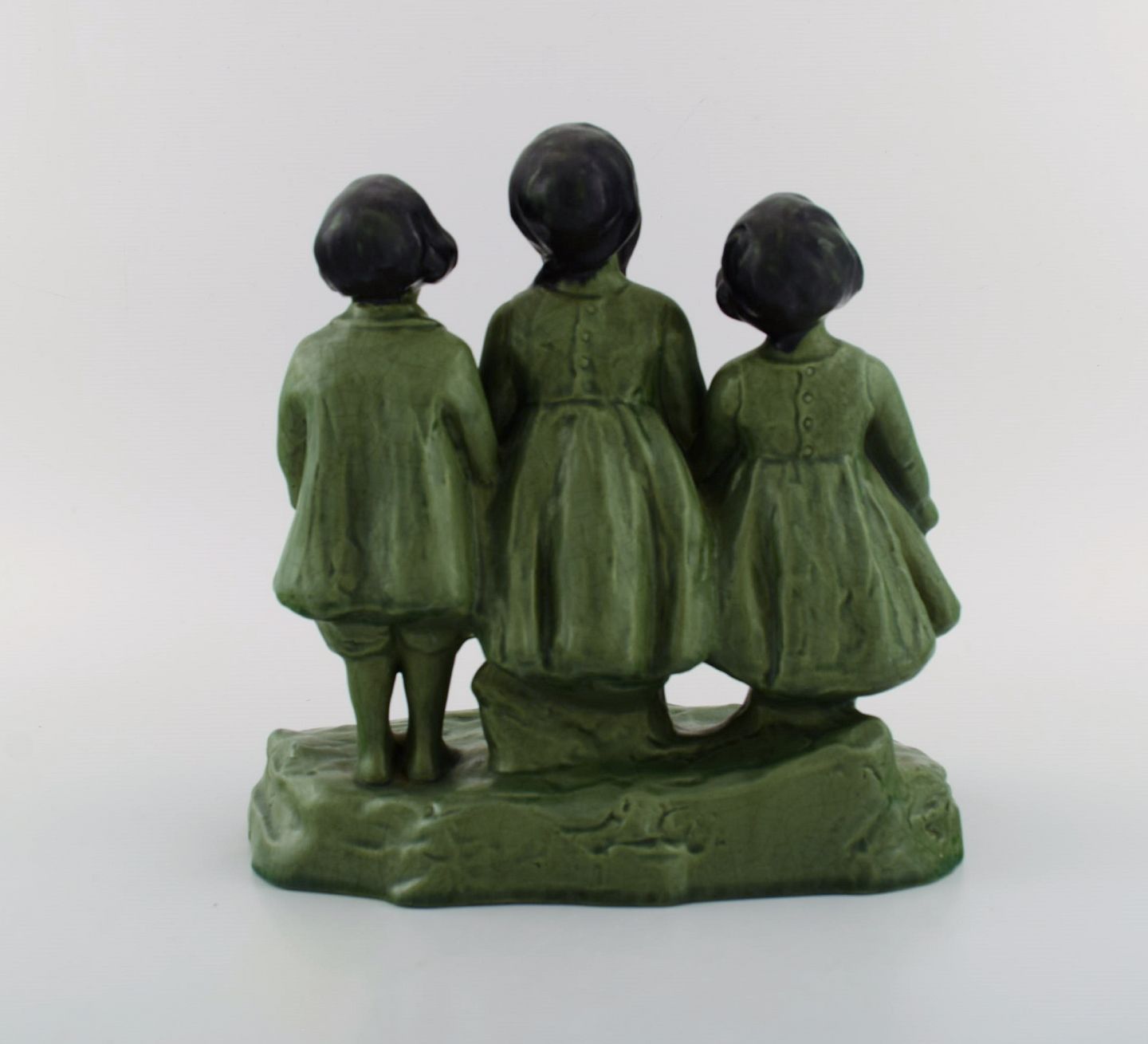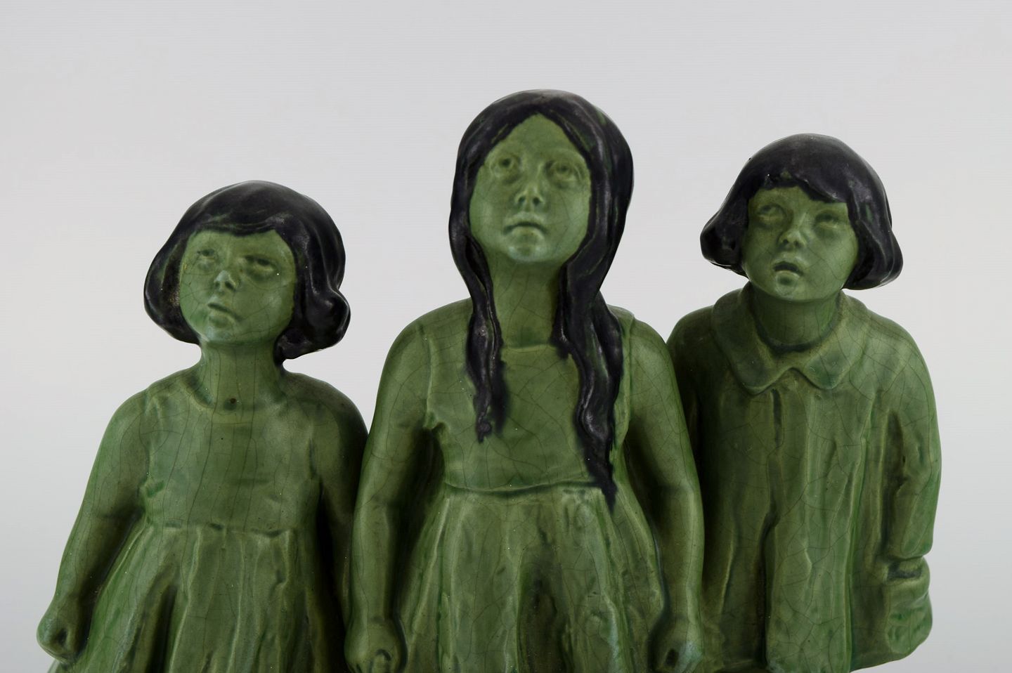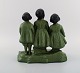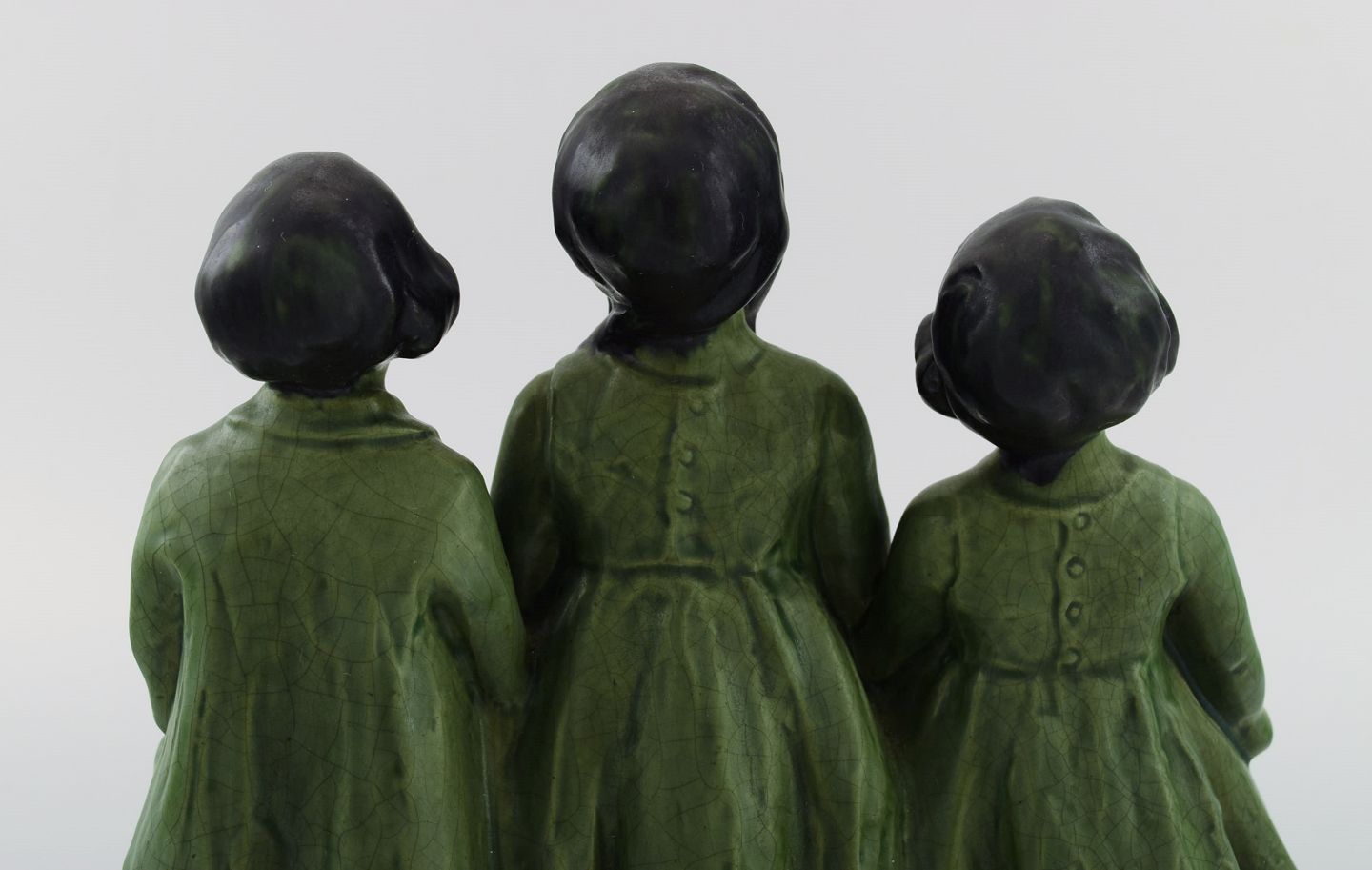 Alice Nordin for Ipsen's, Denmark. Large sculpture in jade green glazed ceramics. Three girls scout for wild geese. Ca. 1920. Measures: 23.5 x 22.5 cm. In excellent condition. Signed.