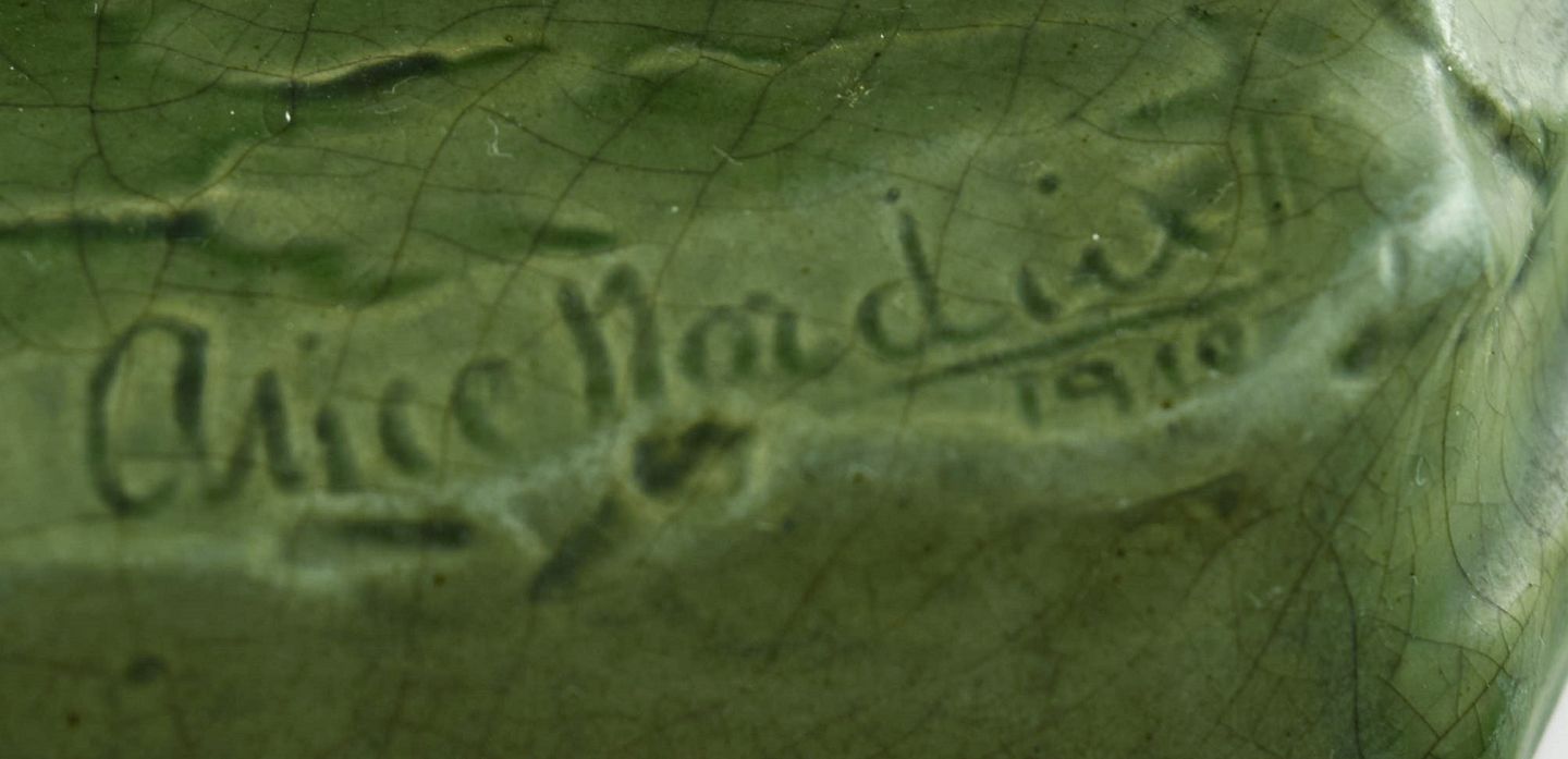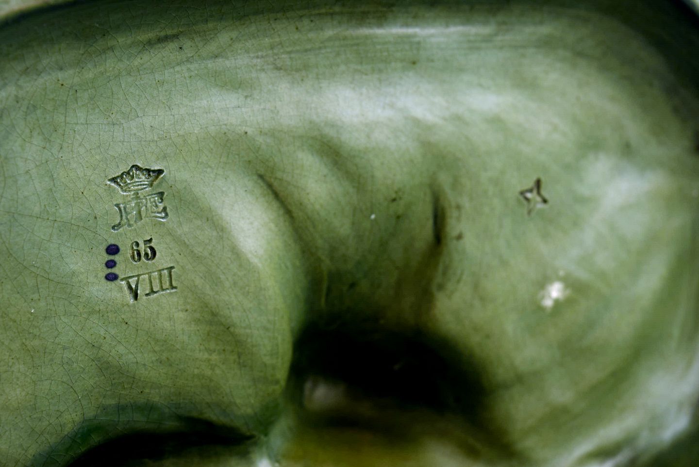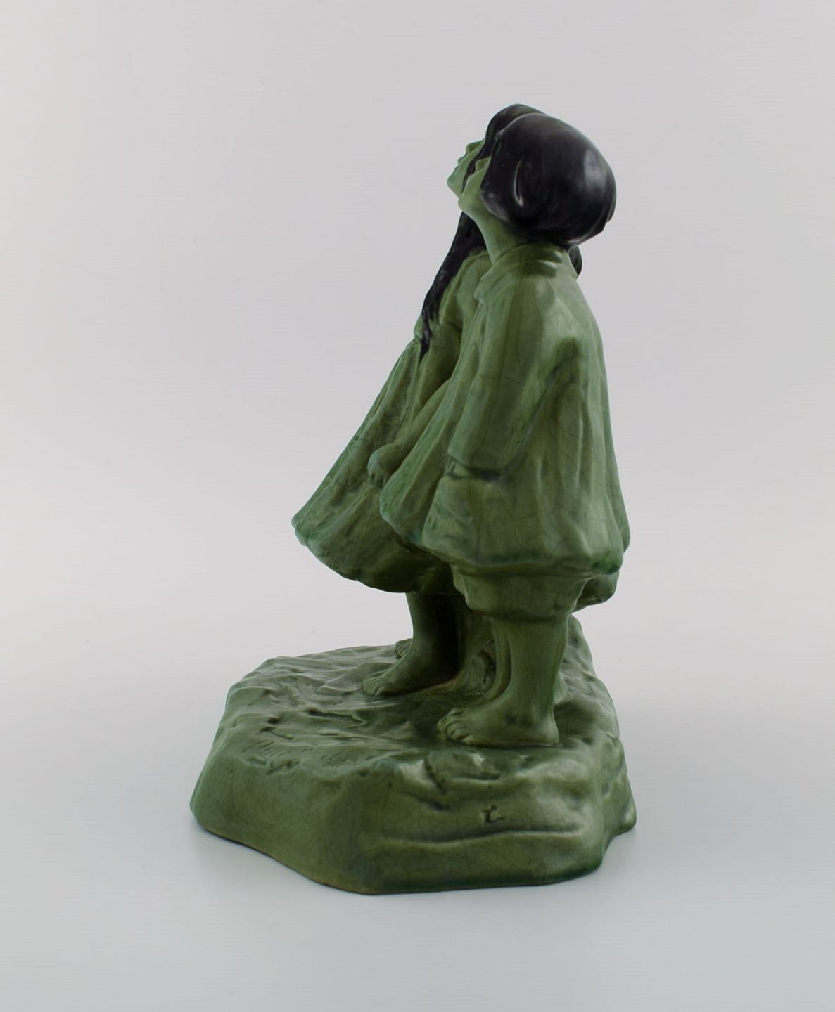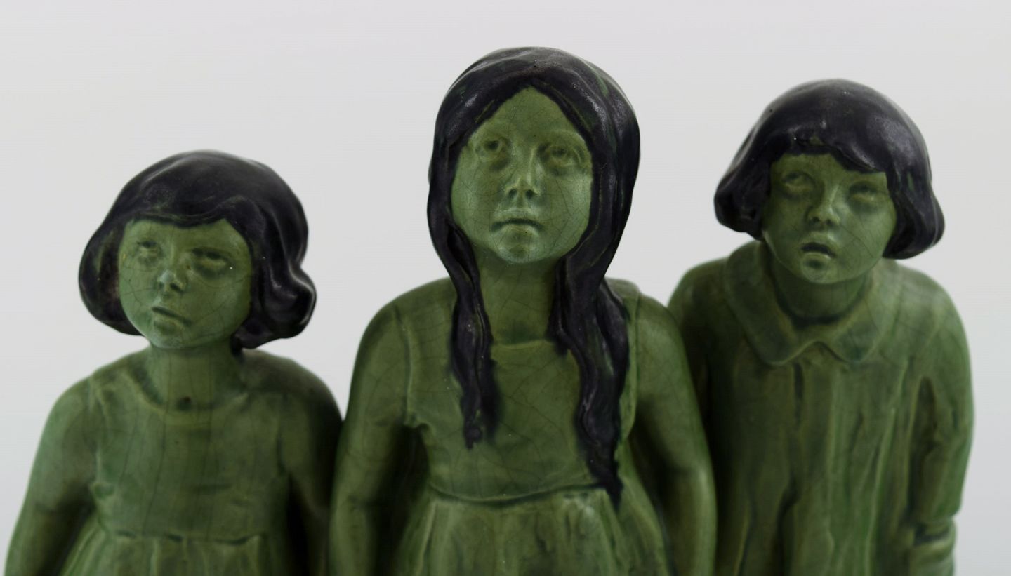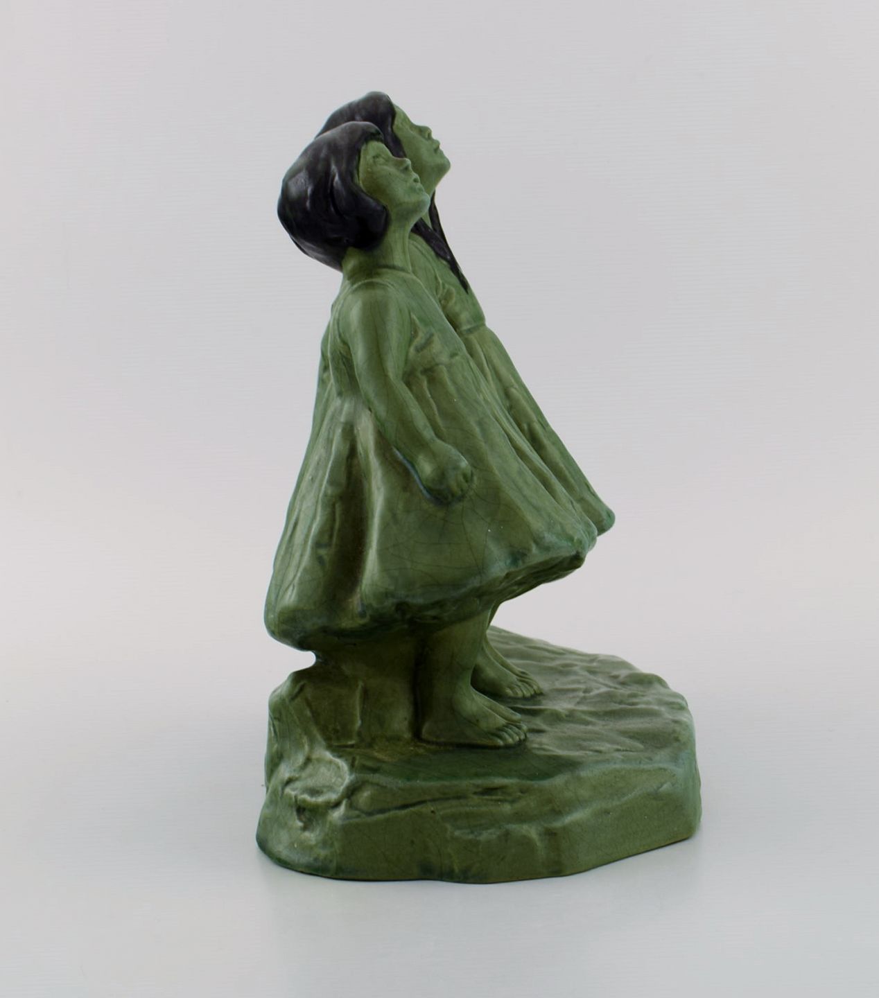Alice Nordin for Ipsen's, Denmark. Large sculpture in jade green glazed ceramics. Three girls scout for wild geese. Ca. 1920. Measures: 23.5 x 22.5 cm. In excellent condition. Signed.