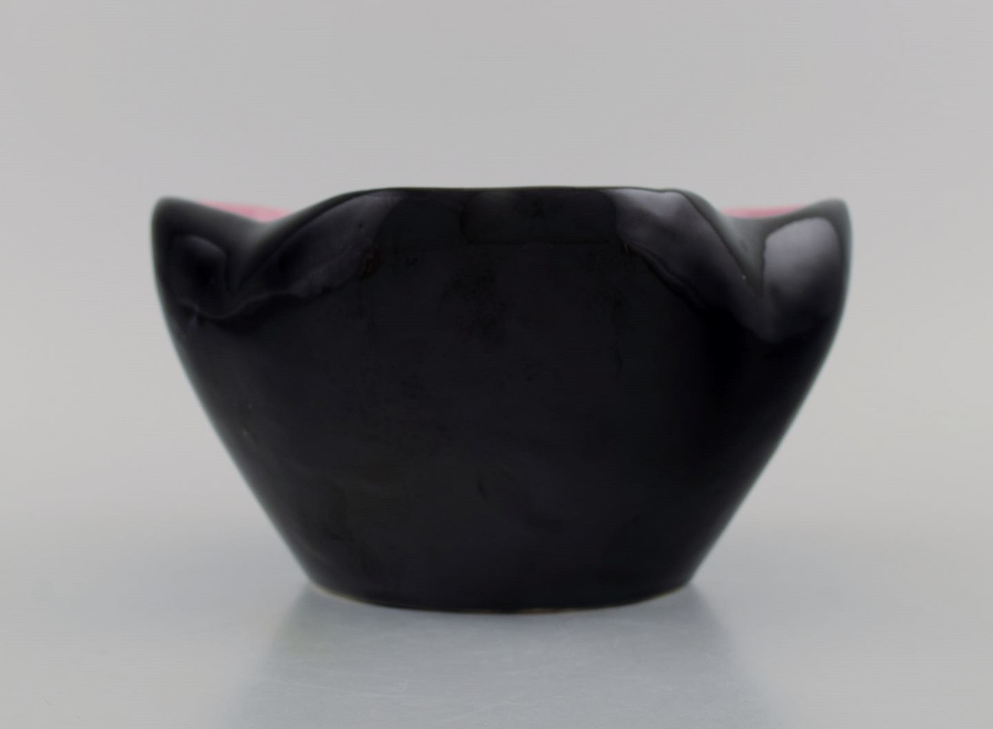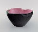 French studio ceramicist. Bowl in glazed ceramics modeled with flowers. Pink interior glaze. Late 20th century. Measures: 22 x 11.5 cm. In excellent condition. Signed.