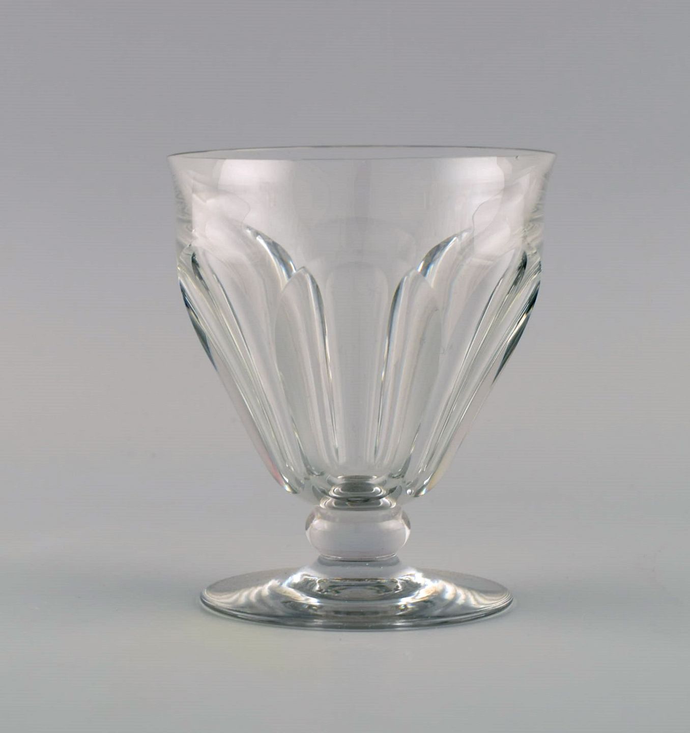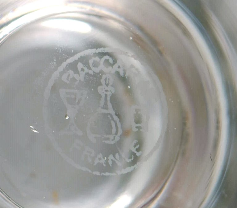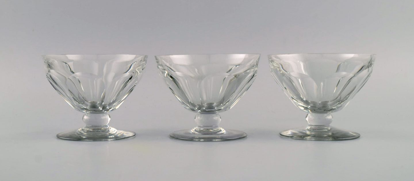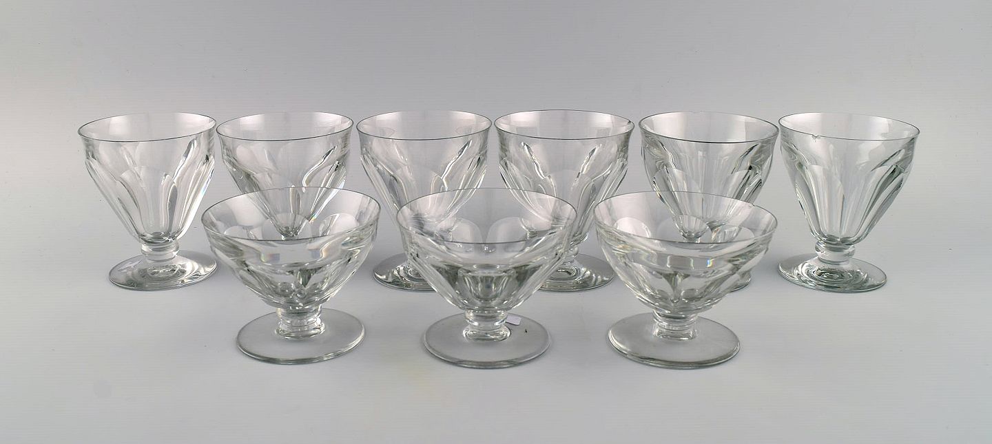 Baccarat, France. 9 Tallyrand glass in clear mouth blown crystal glass. Mid-20th century. Largest measures: 10.8 x 9.3 cm. In good condition. All glasses with small chips. Stamped.