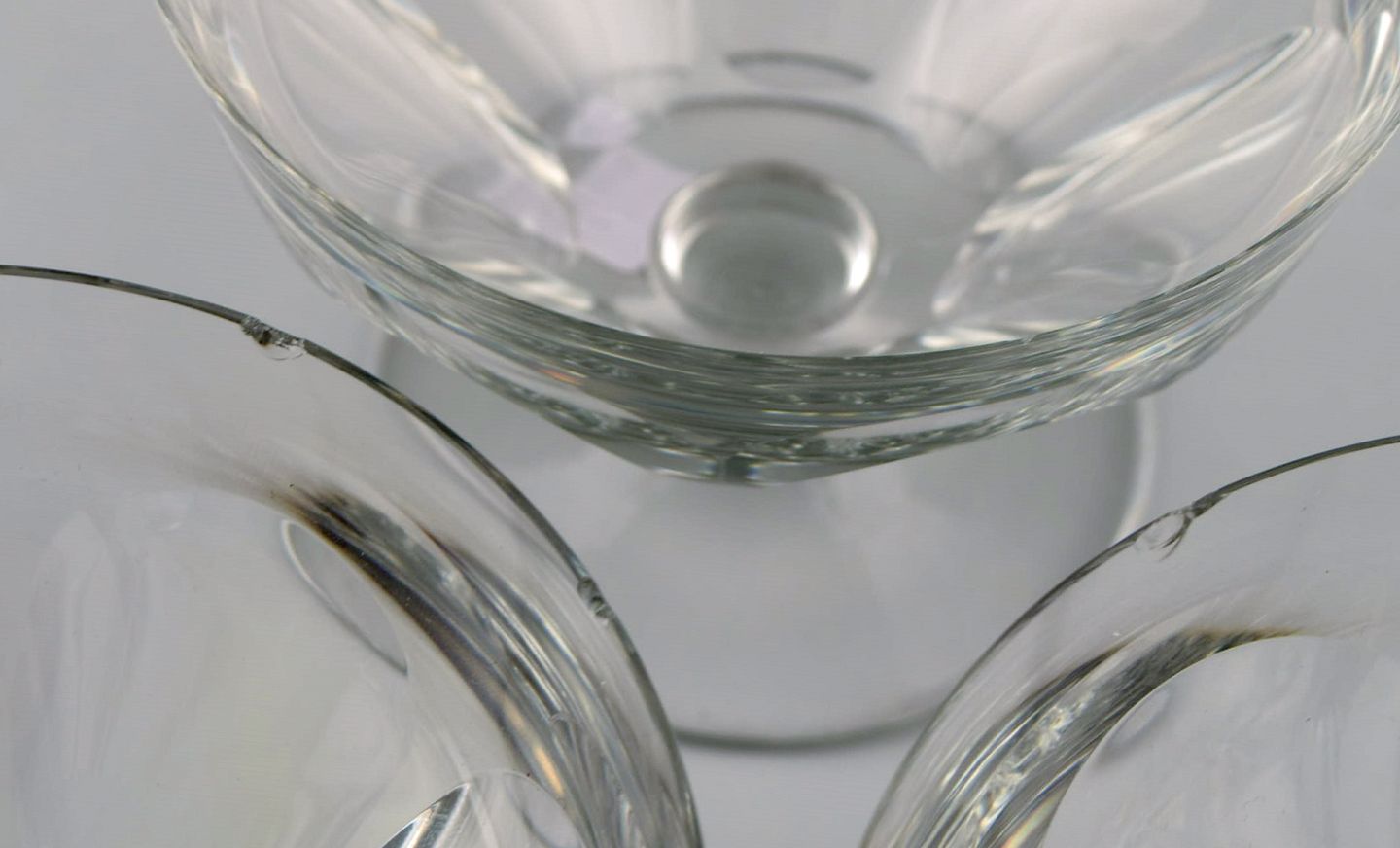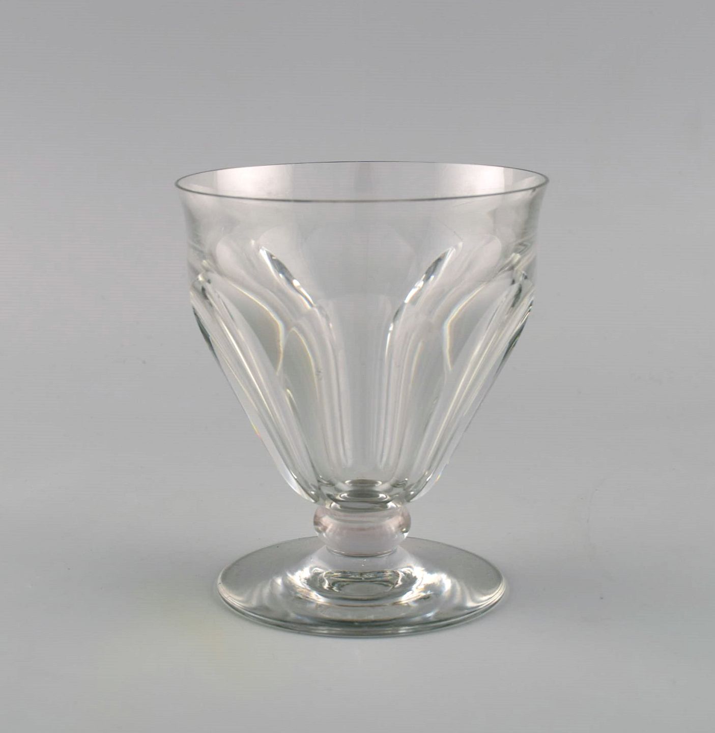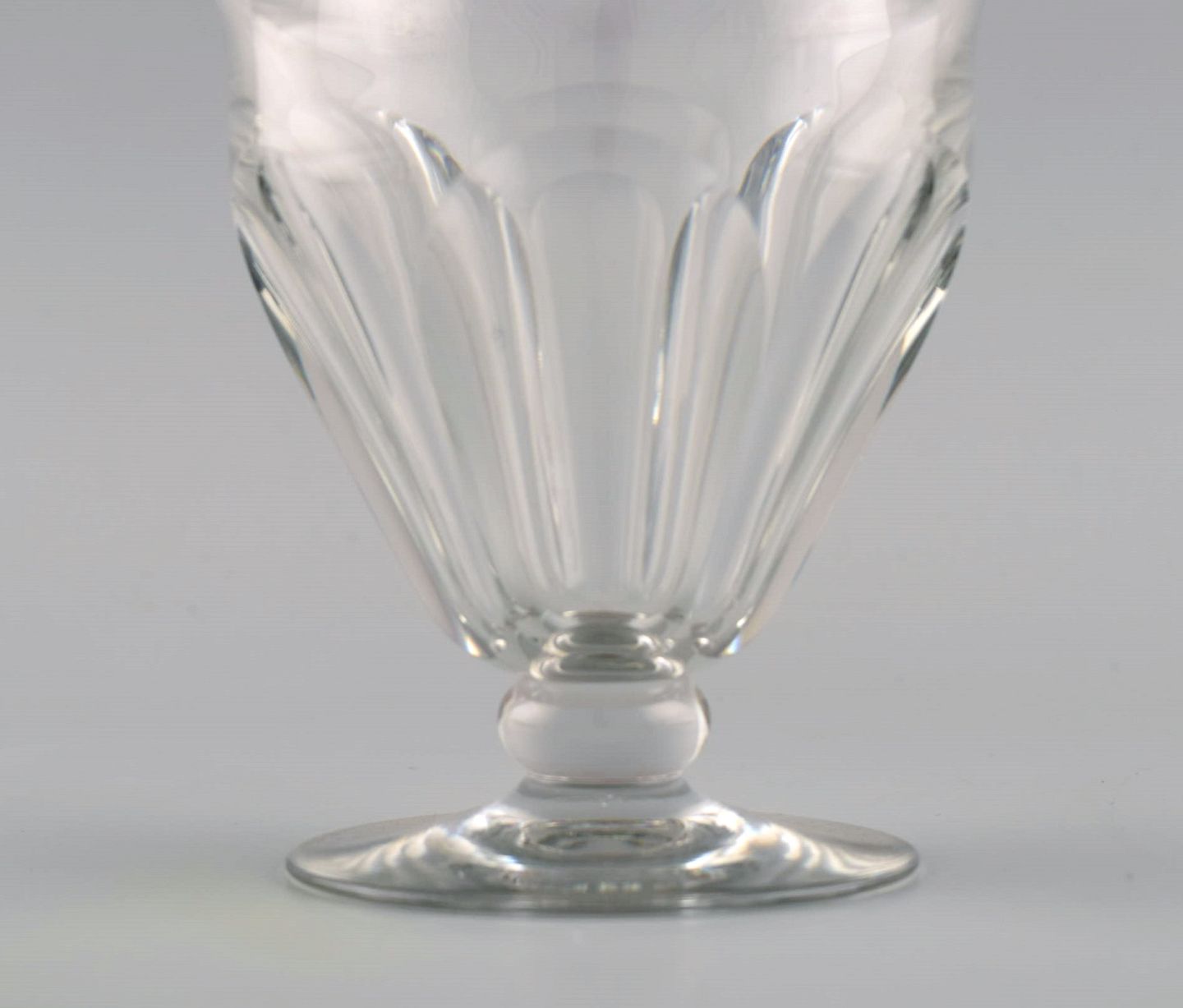 Baccarat, France. 9 Tallyrand glass in clear mouth blown crystal glass. Mid-20th century. Largest measures: 10.8 x 9.3 cm. In good condition. All glasses with small chips. Stamped.