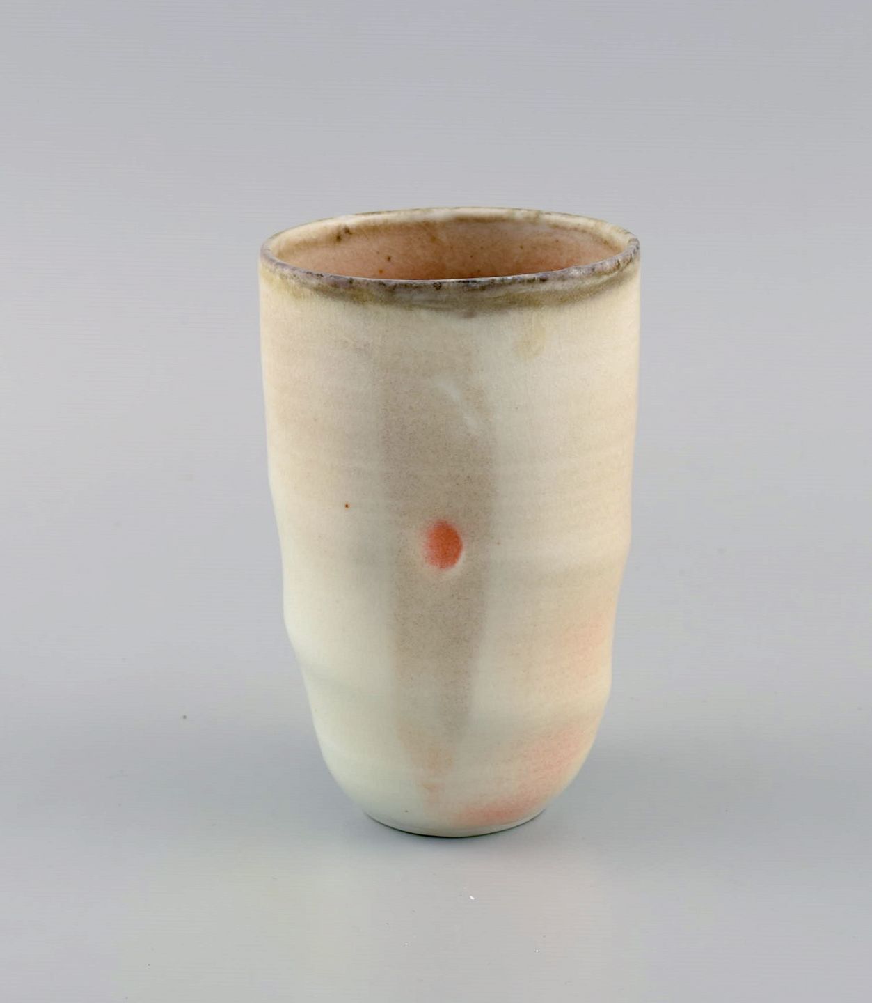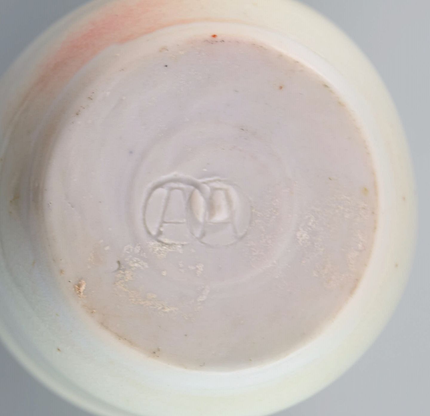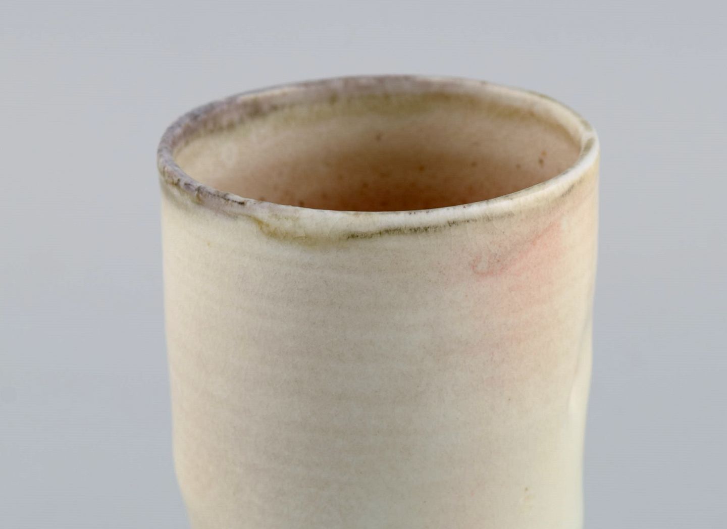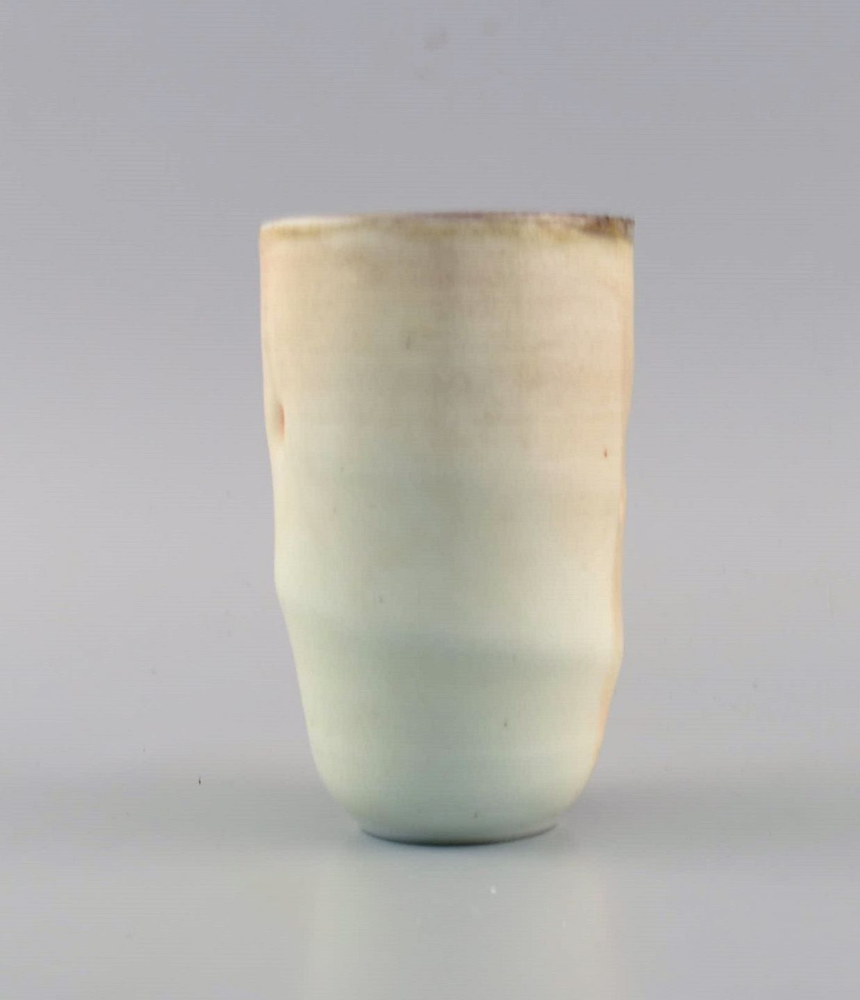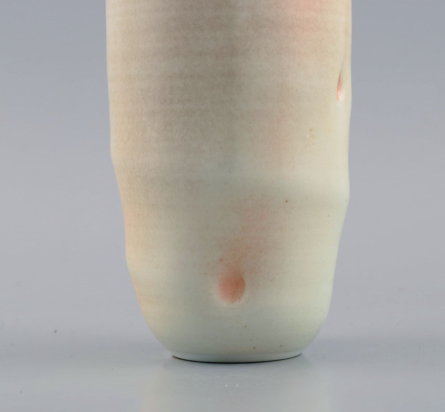 Dansk studiokeramiker. Unika vase i glaseret stentøj. Smuk glasur i sarte lyse og fersken nuancer. Sent 1900-tallet. Måler: 13 x 8 cm. I flot stand. Stemplet.