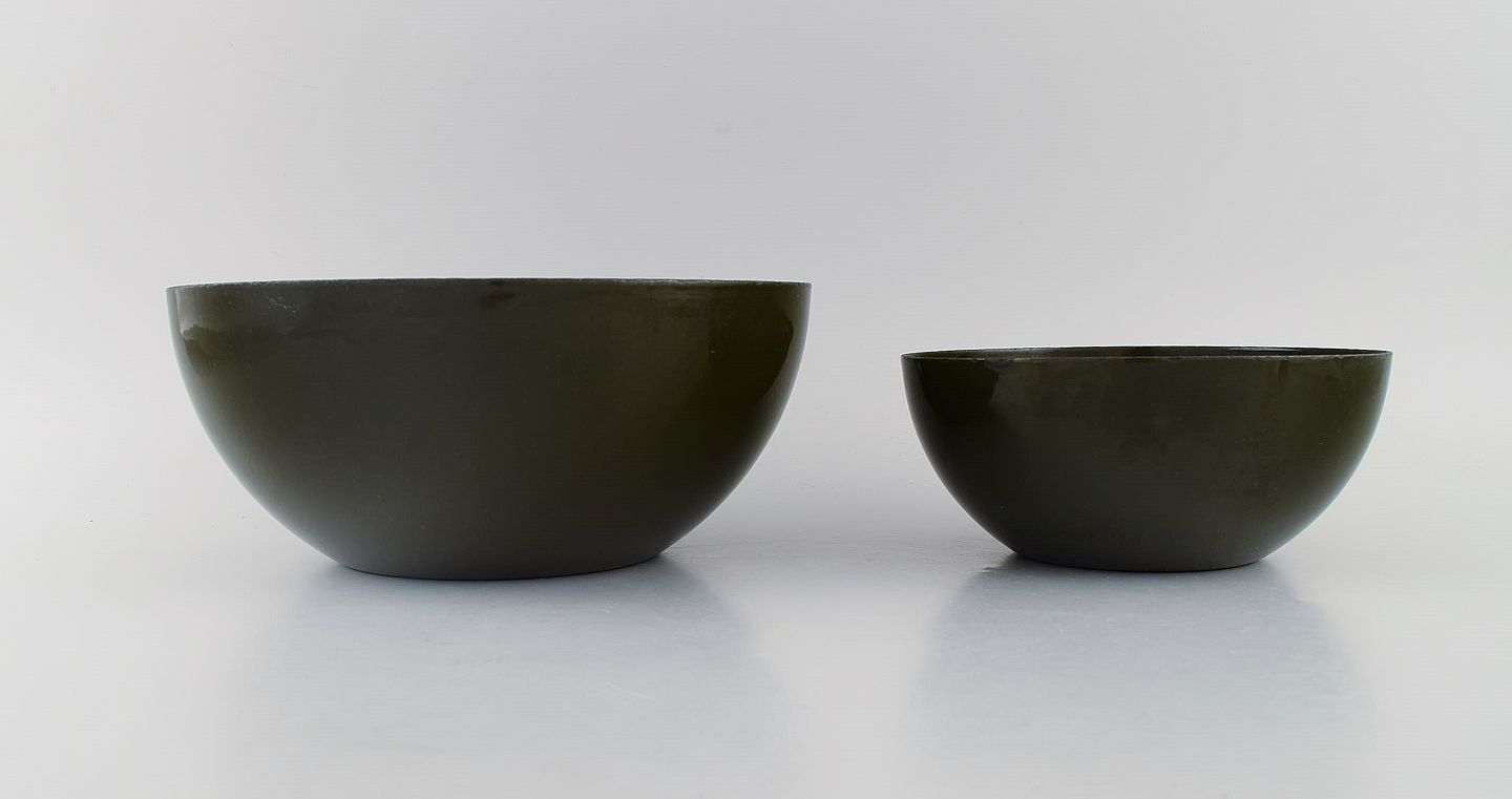 Kaj Franck (1911-1989) for Finel. To mørkegrønne skåle i emaljeret metal. Finsk design, midt 1900-tallet.