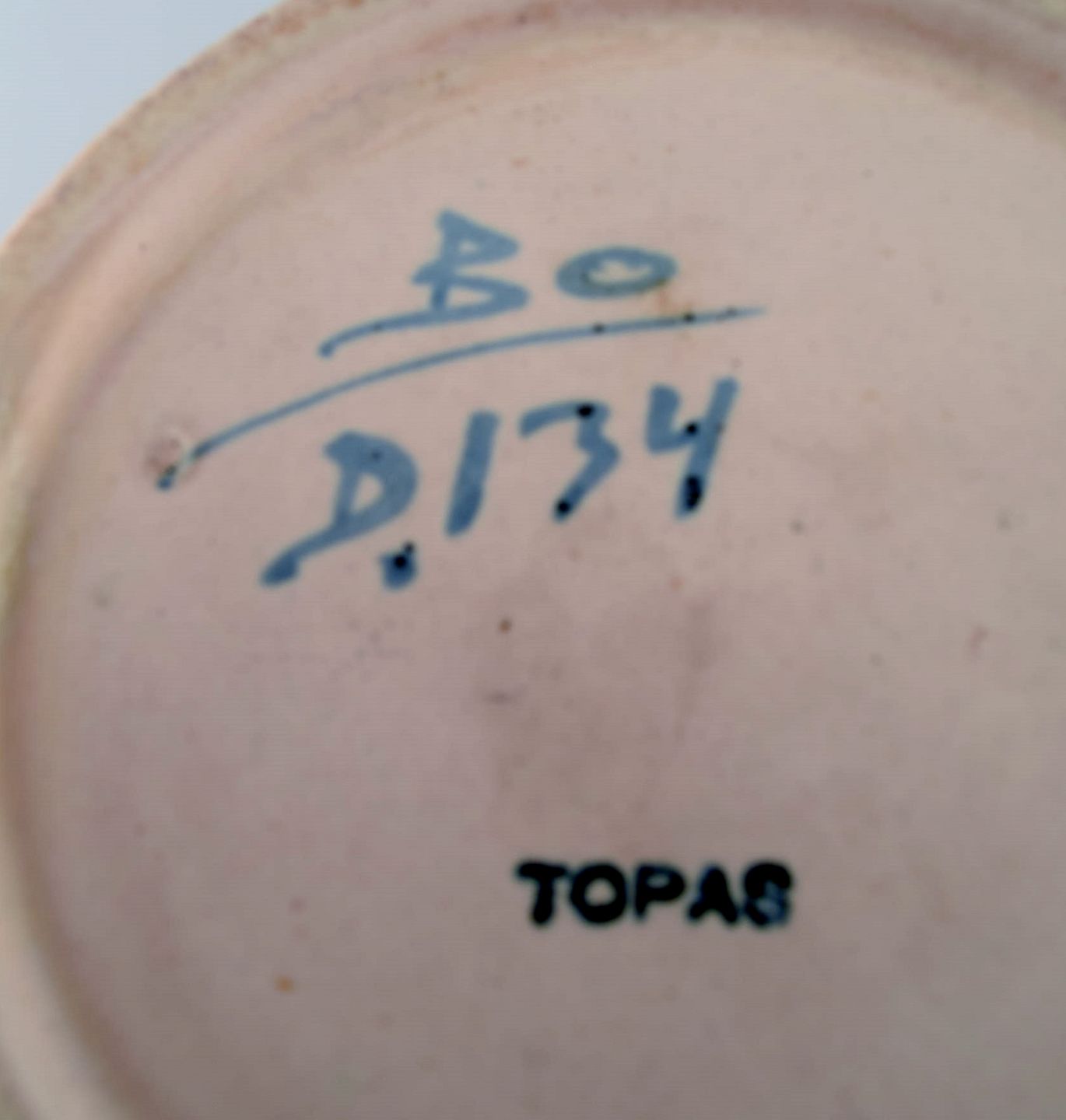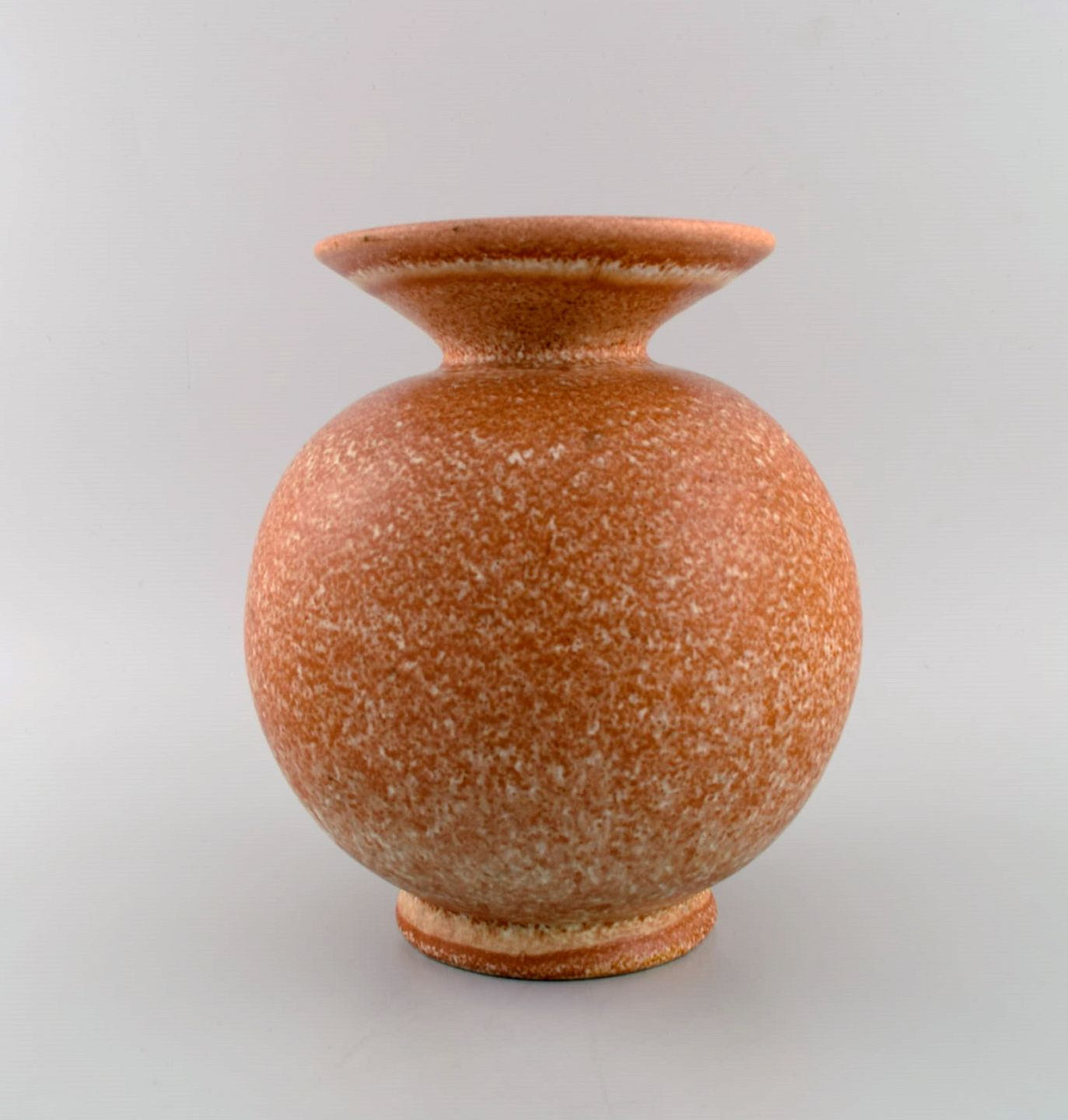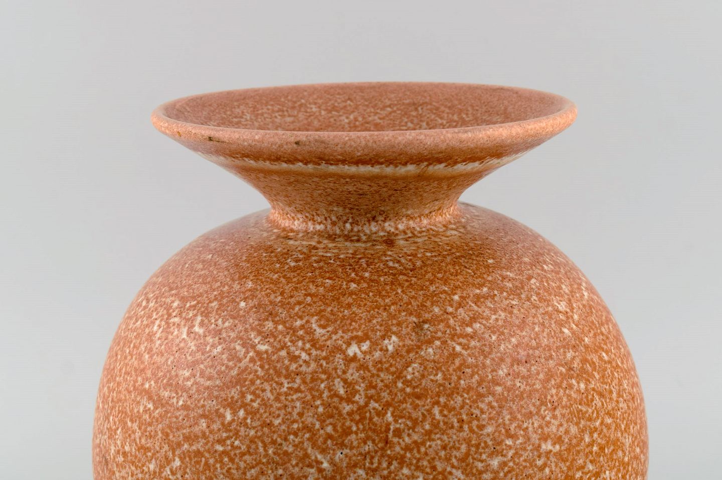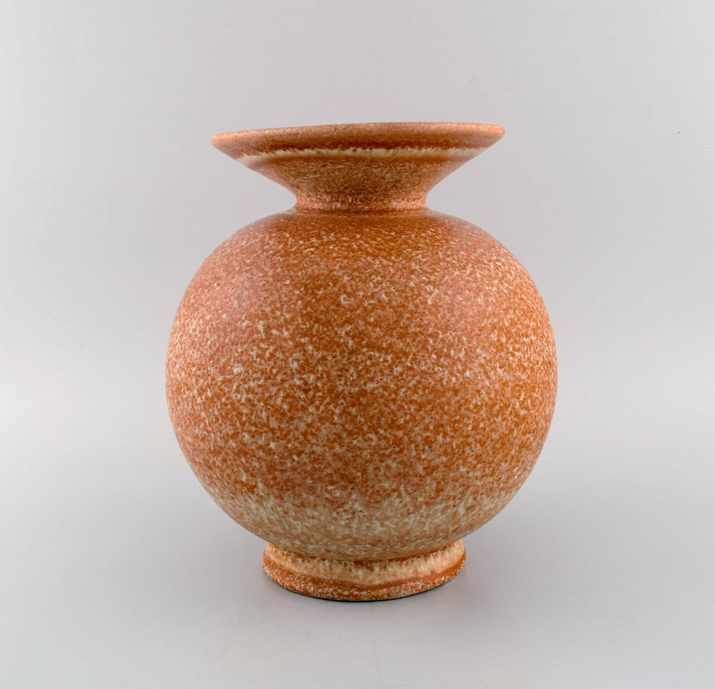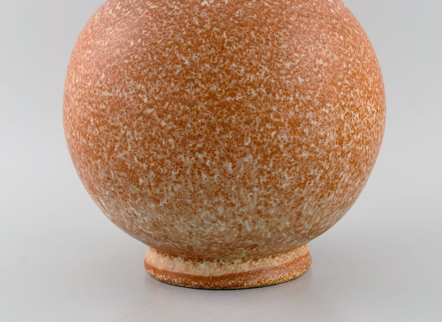 Bo fajans, Sverige. Rund Topas vase i glaseret keramik. Smuk spættet glasur i orange og sand nuancer. 1960'erne. Måler: 23 x 21 cm. I flot stand. Signeret.