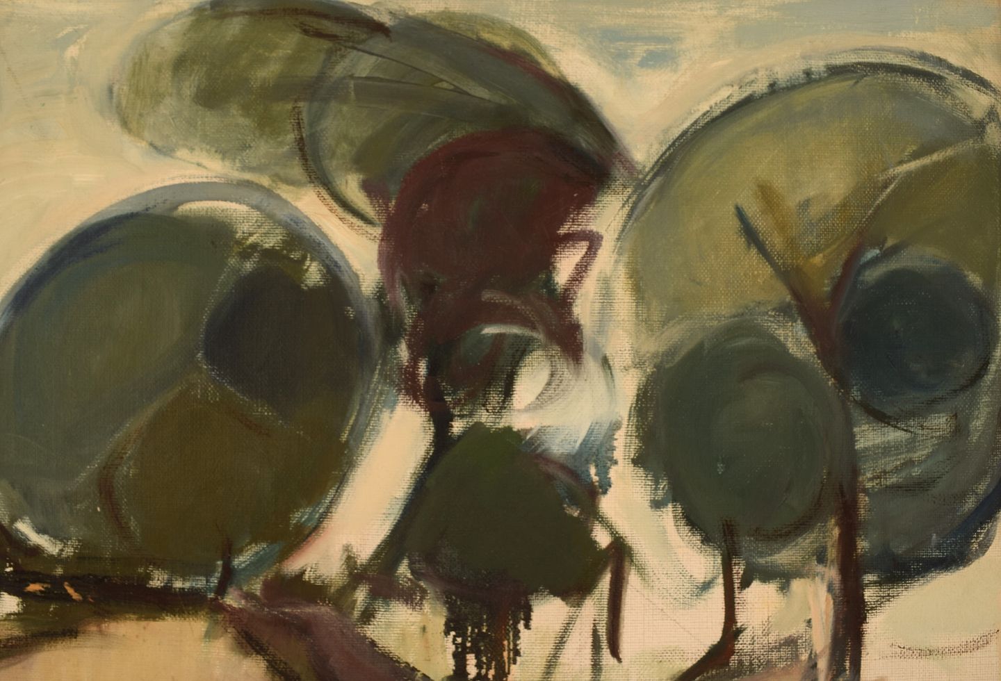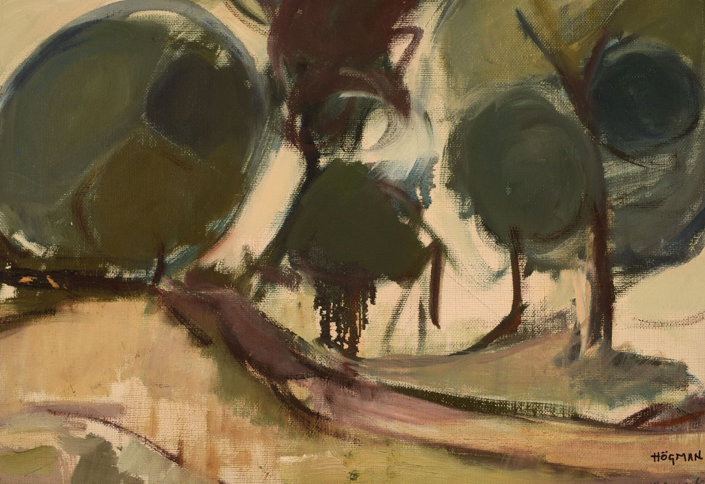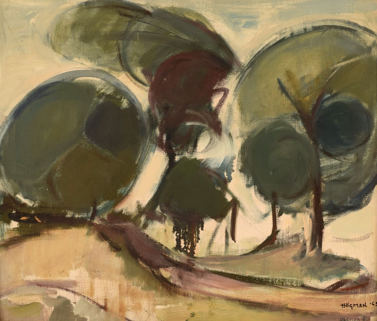 Ragnar Högman (1891-1976), Sverige. Olie på lærred. Modernistisk landskab med træer. Dateret 1963. Lærredet måler: 52 x 44 cm. Rammen måler: 5 cm. I flot stand. Signeret og dateret.