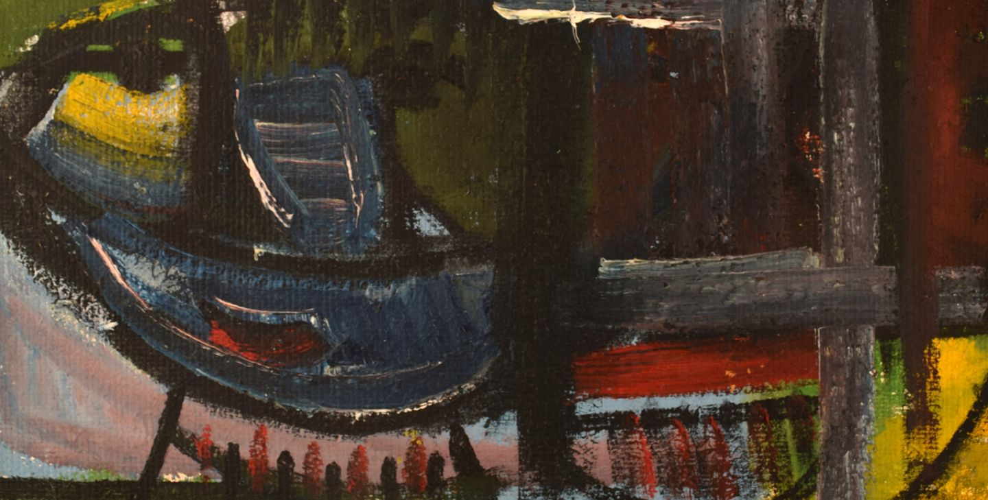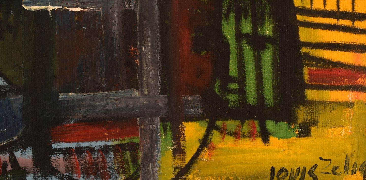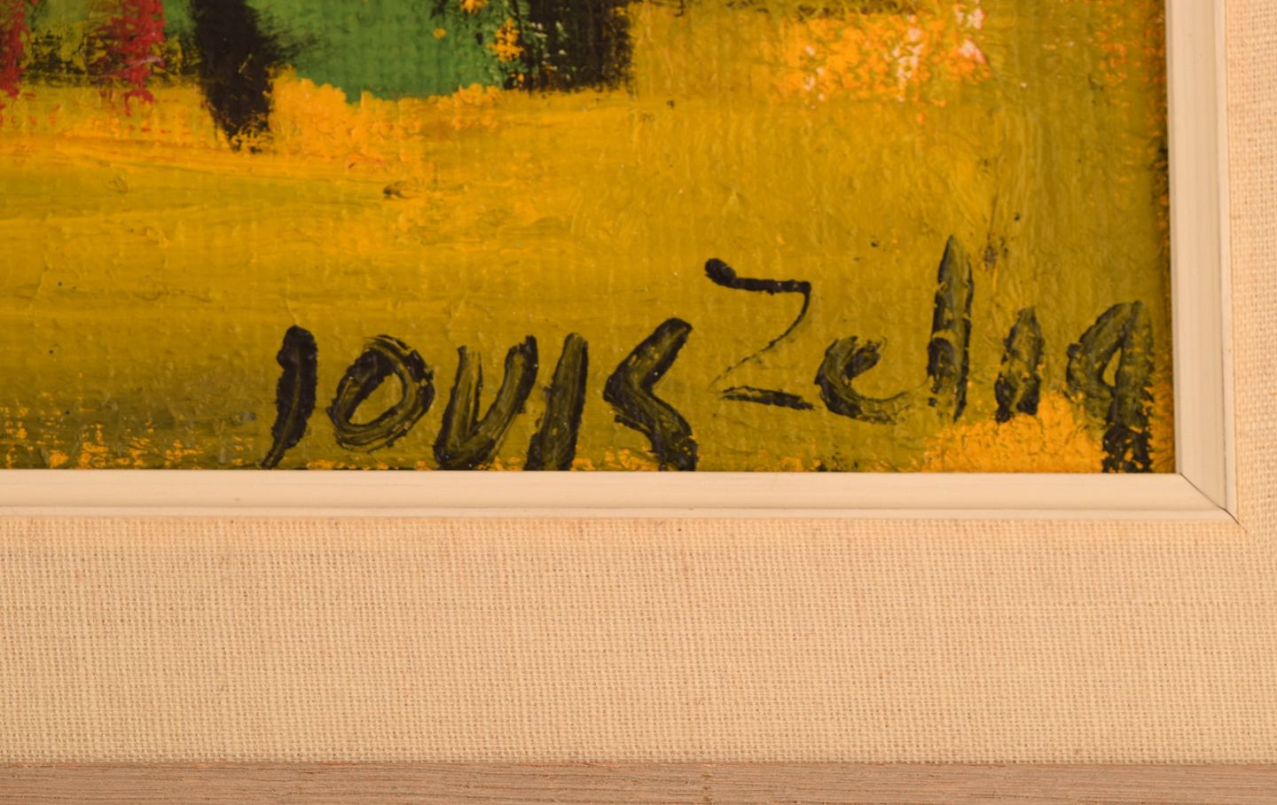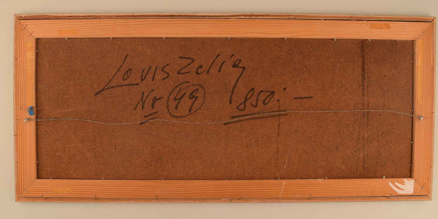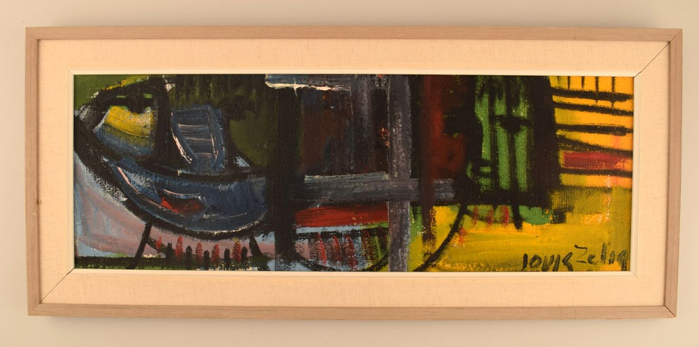 Louis Zelig (1922-1993), rumænsk/svensk kunstner. Olie på plade. Abstrakt komposition. 1960'erne. Pladen måler: 61,5 x 21,5 cm. Rammen måler: 5 cm. I flot stand. Signeret.