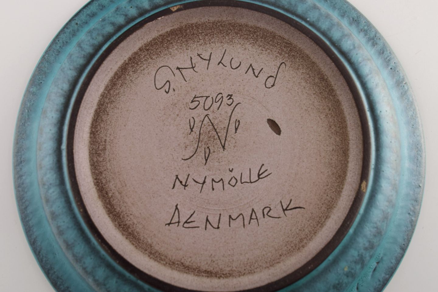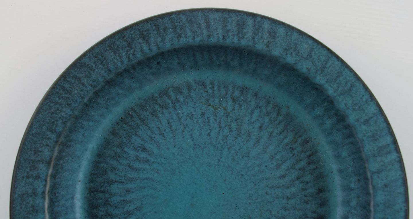 Gunnar Nylund for Nymølle. Rundt fad / skål i glaseret keramik. Smuk glasur i blå nuancer. 1960'erne. Måler: 20 x 3,3 cm. I flot stand. Signeret.