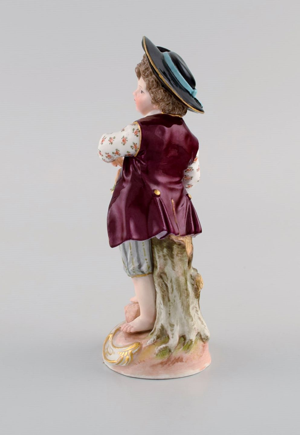 Antik Meissen figur i håndmalet porcelæn. Dreng med blomsterkurv. 1800-tallet. Måler: 13,5 x 6 cm. I flot stand. Stemplet. 1. Sortering.