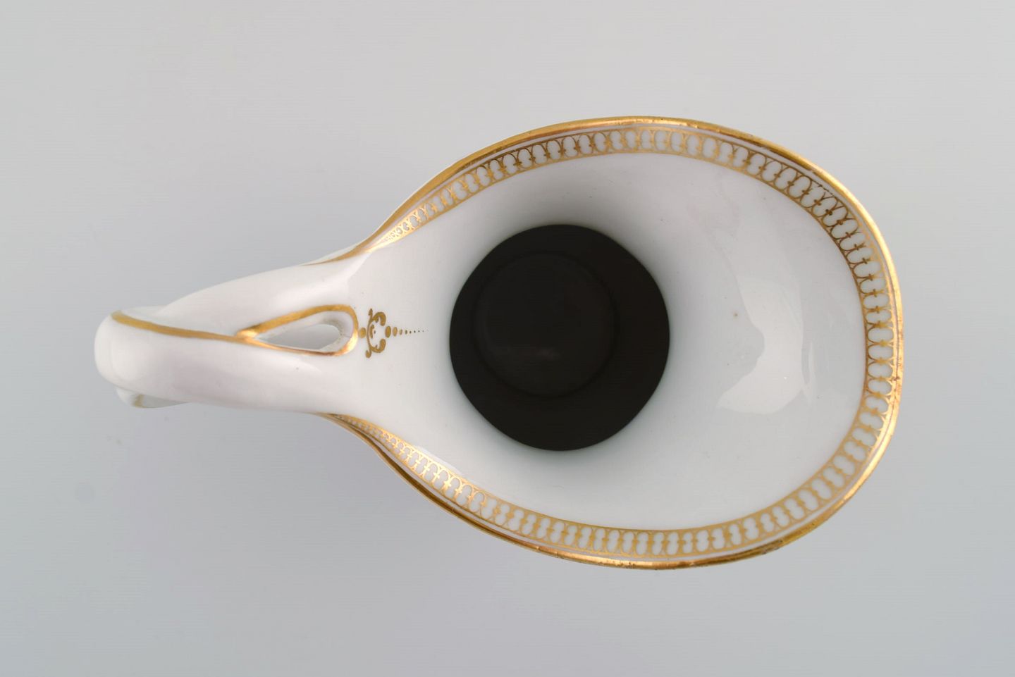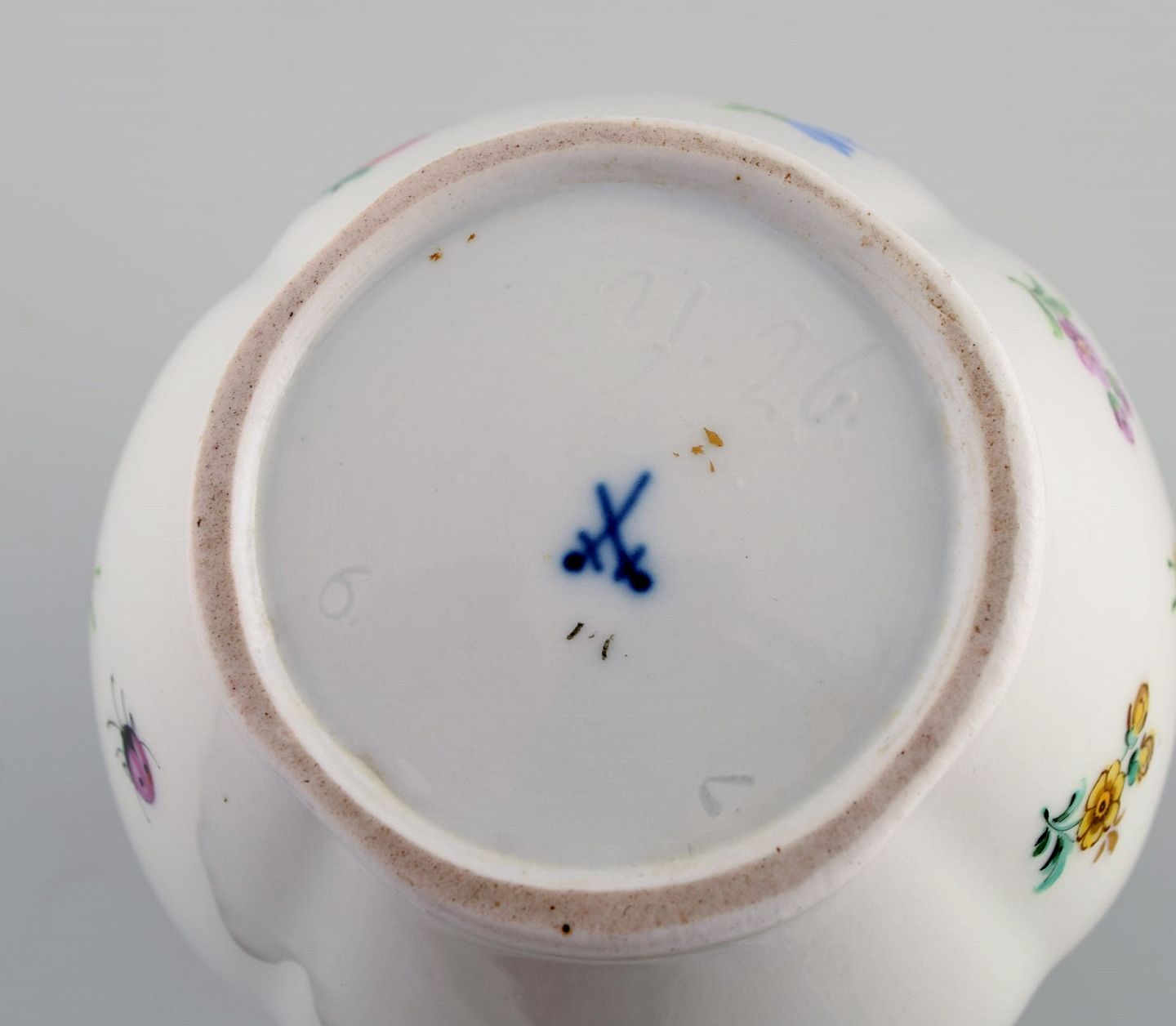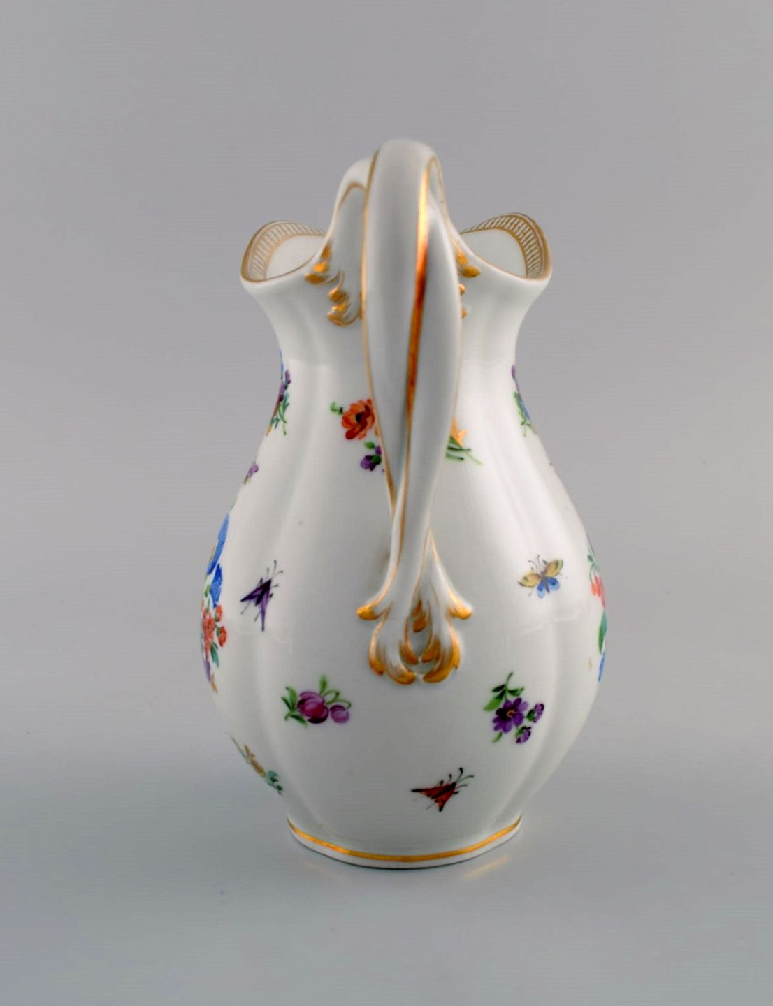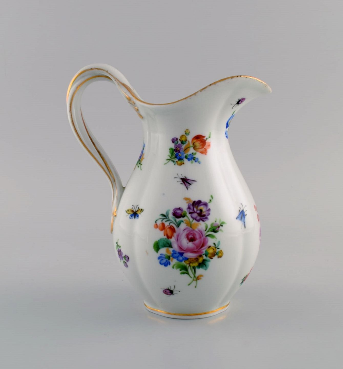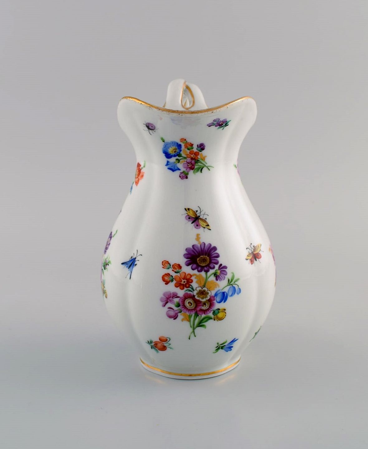 Antique Meissen porcelain jug with hand-painted gold decoration, flowers and insects. 19th century. Measures: 17 x 14 cm. In excellent condition. Stamped.