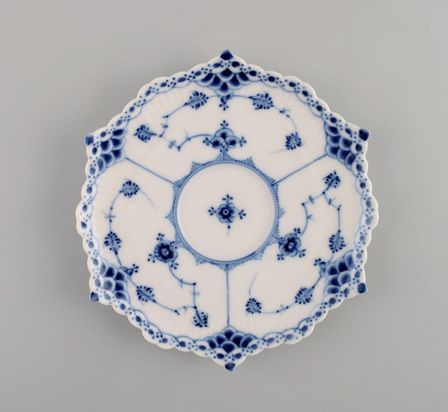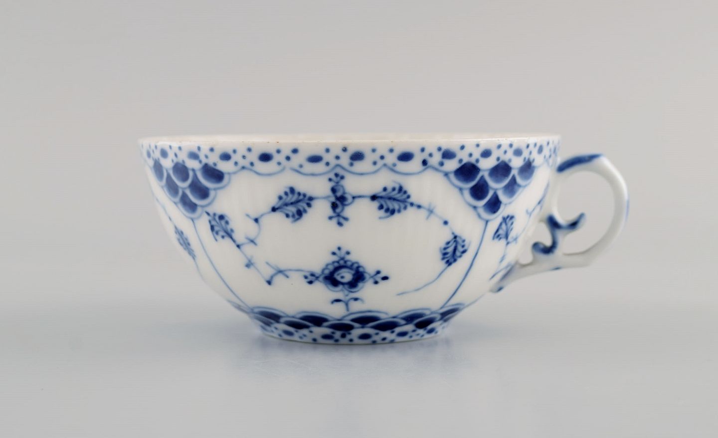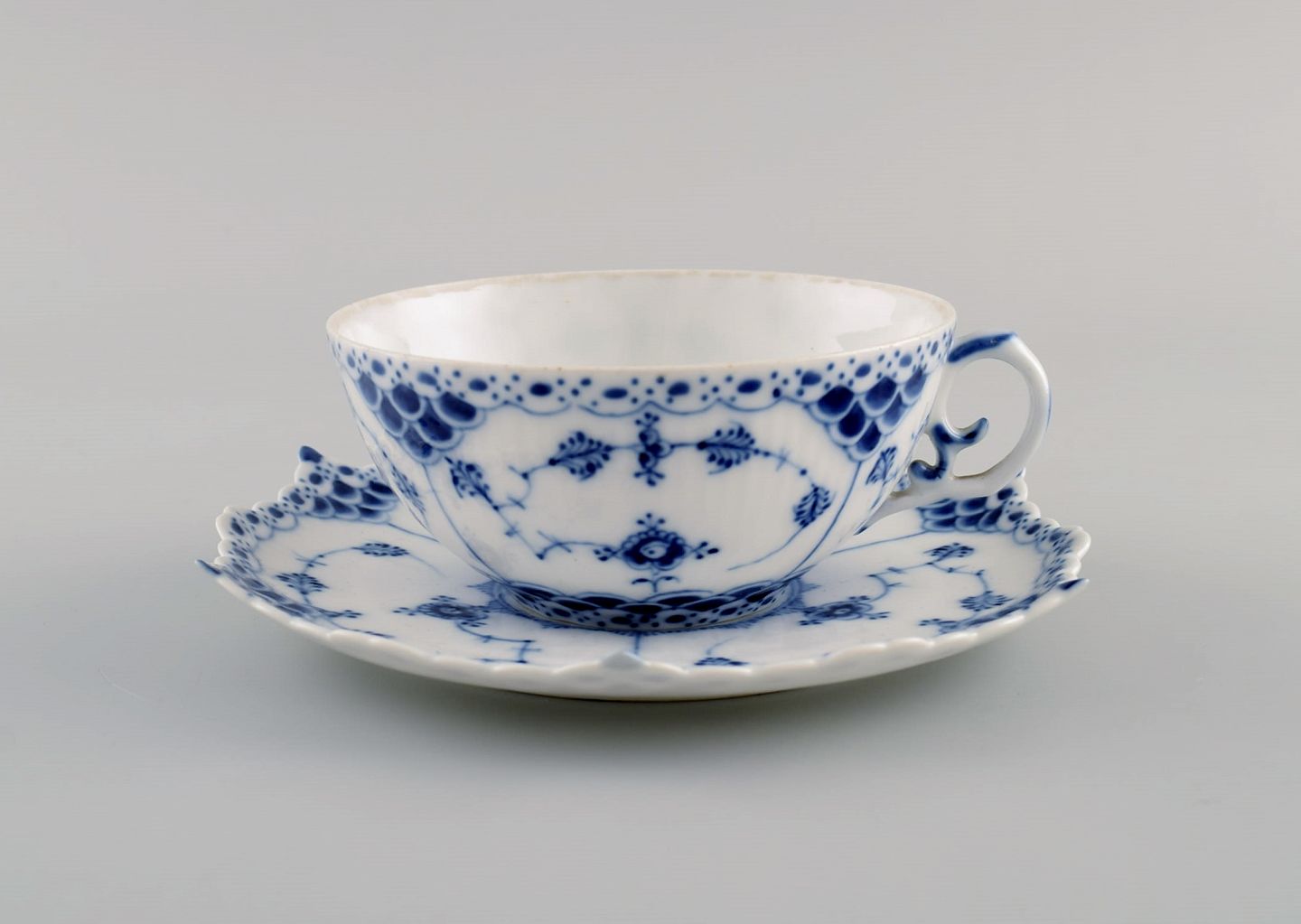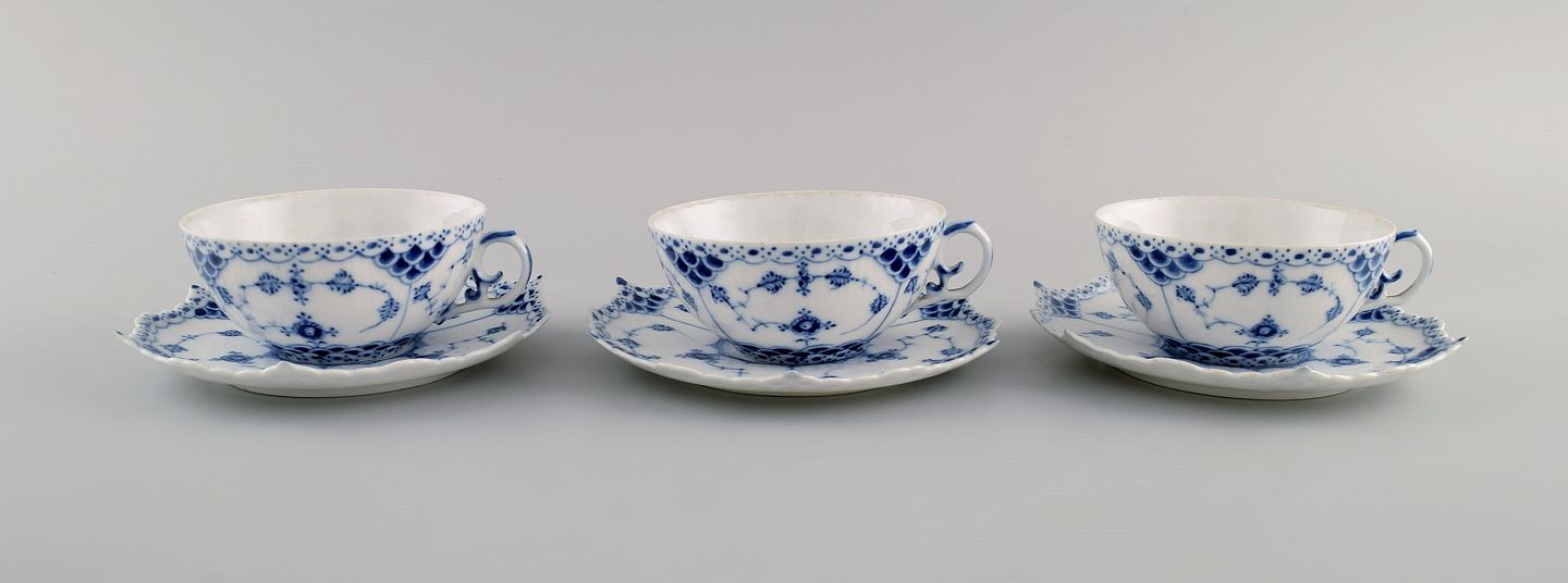 Three antique Royal Copenhagen Blue Fluted Full Lace teacups with saucers. Model number 1/1130. Early 20th century.