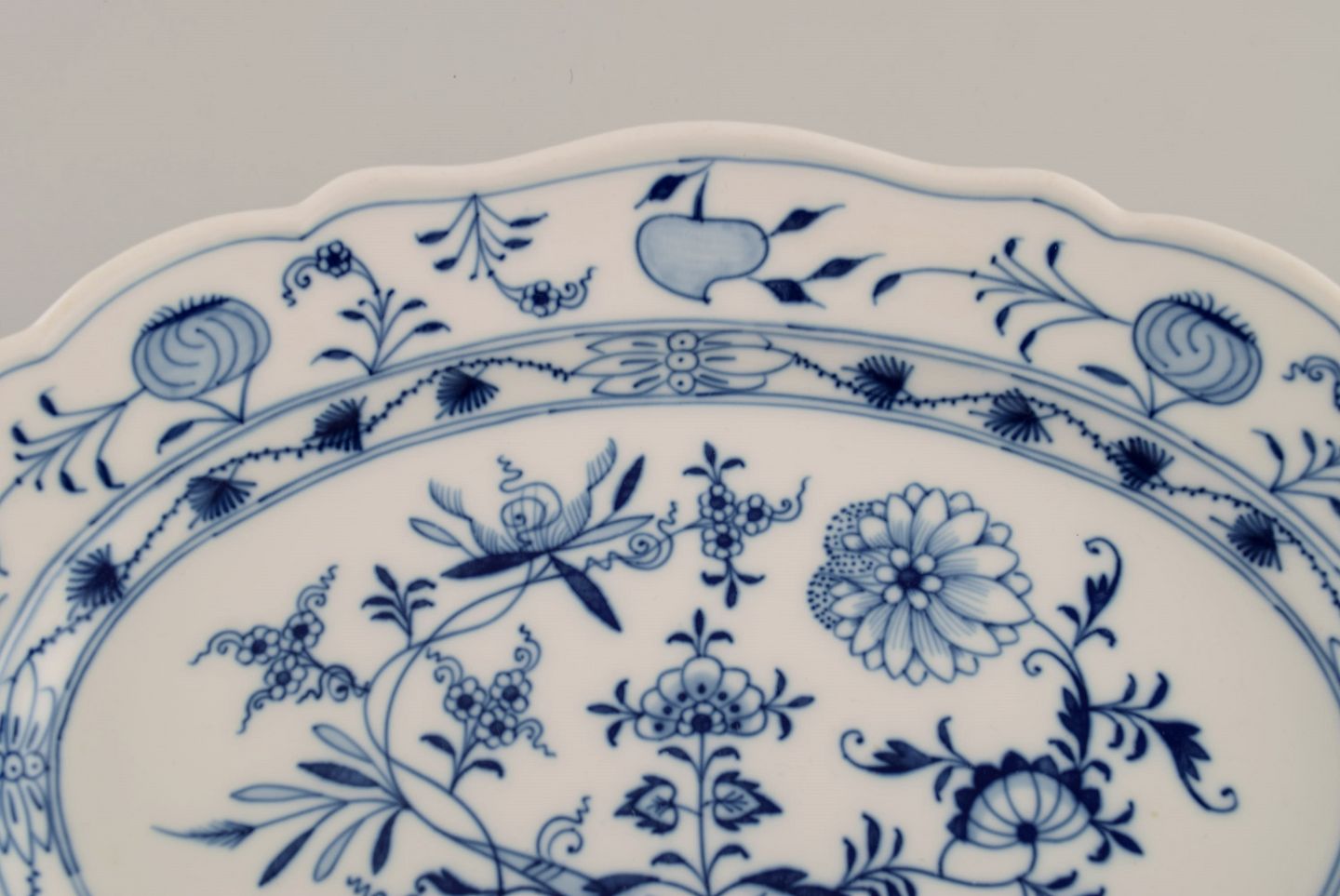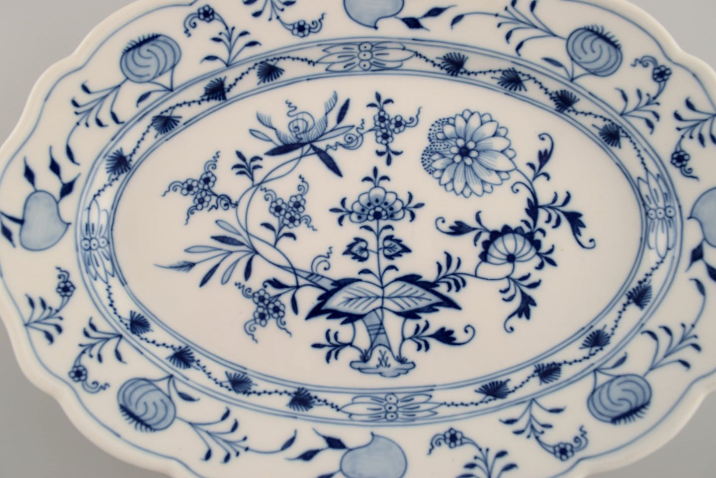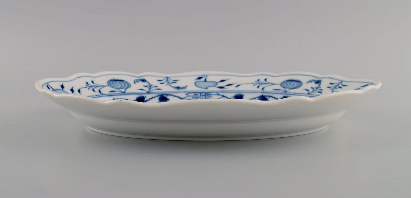 Antikt Meissen Løgmønstret serveringsfad i håndmalet porcelæn. Sent 1800-tallet. Måler: 28,5 x 20,5 x 4 cm. I flot stand. Stemplet. 1. Sortering.