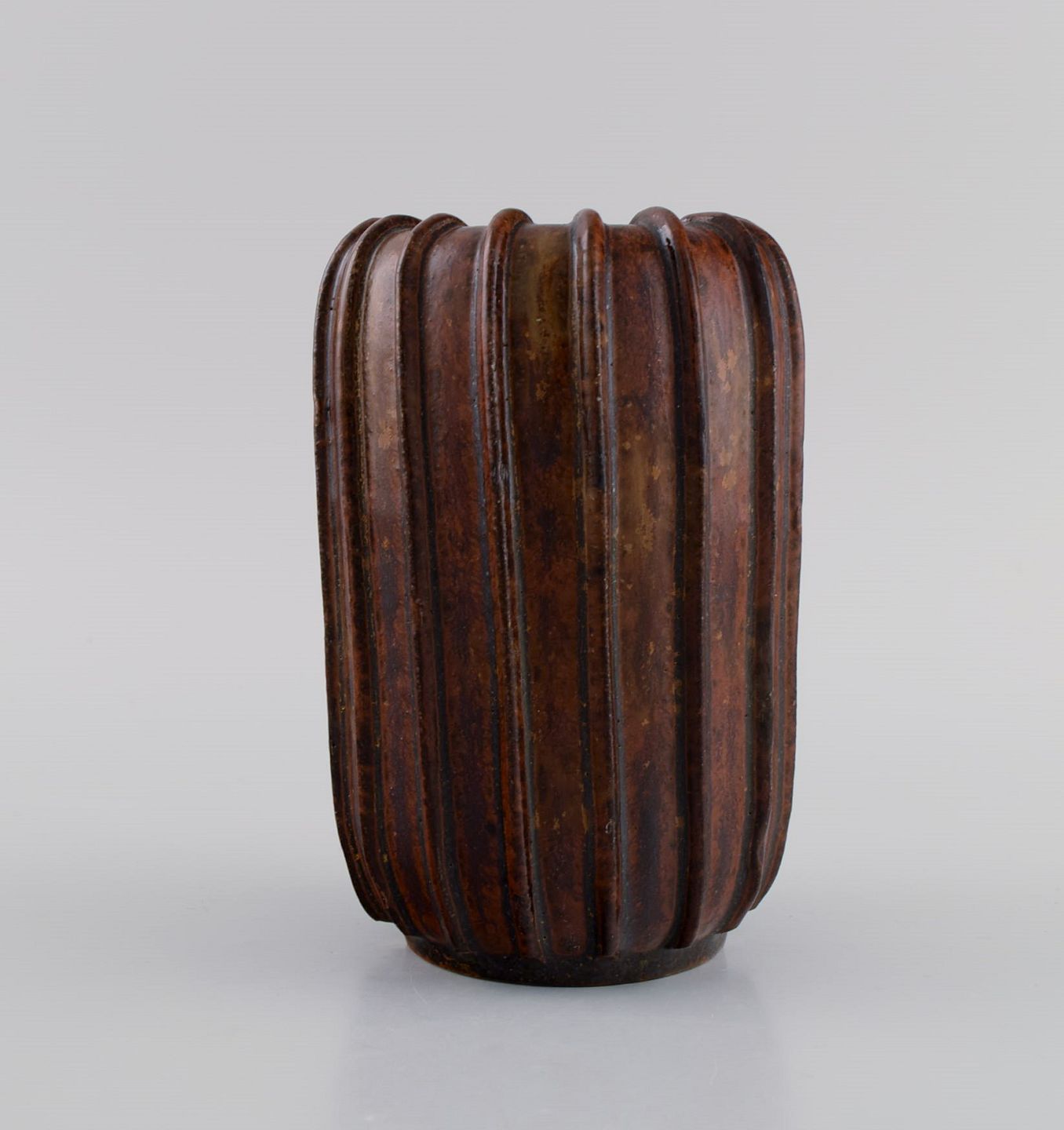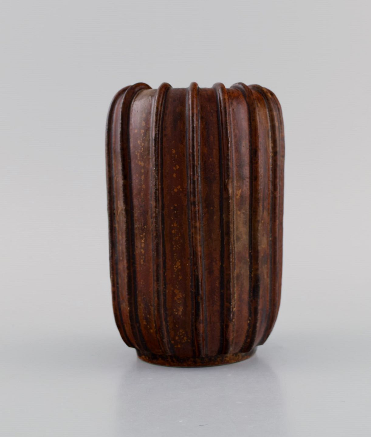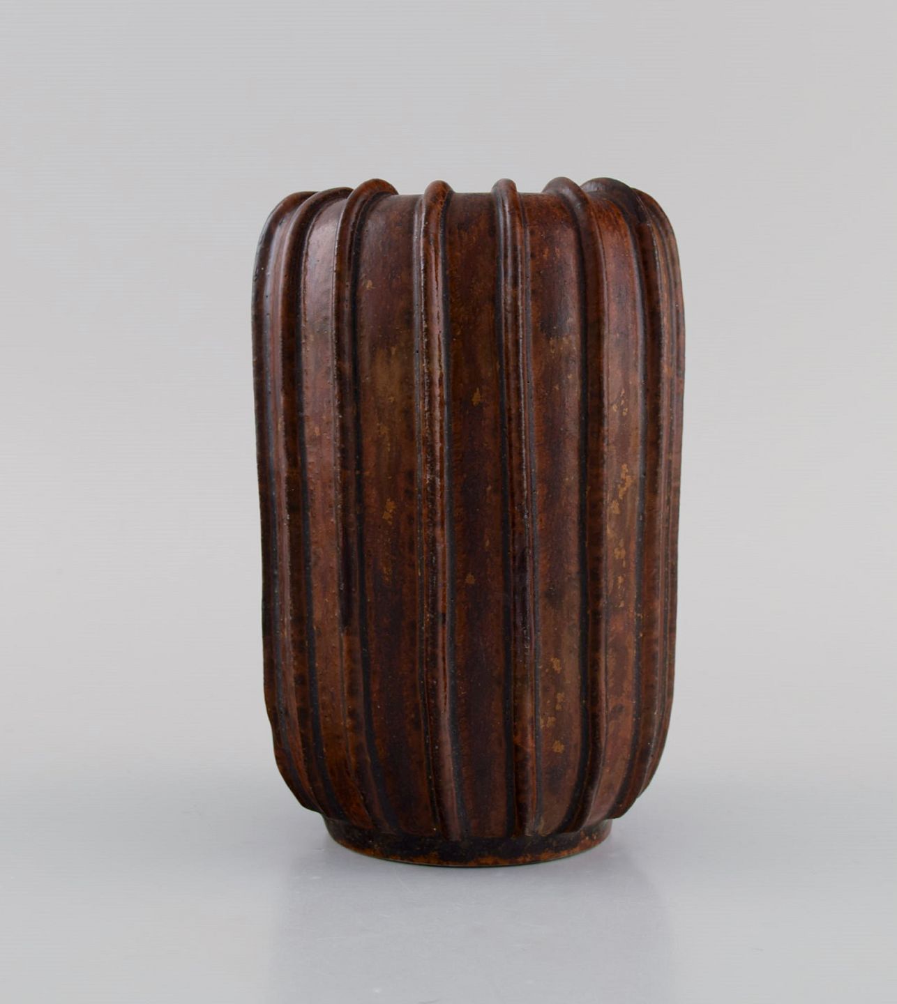 Arne Bang (1901-1983), Danmark. Vase med kanneleret korpus i glaseret keramik. Smuk glasur i brune nuancer. Midt 1900-tallet. Måler: 14 x 9,5 cm. I flot stand. Signeret i monogram.