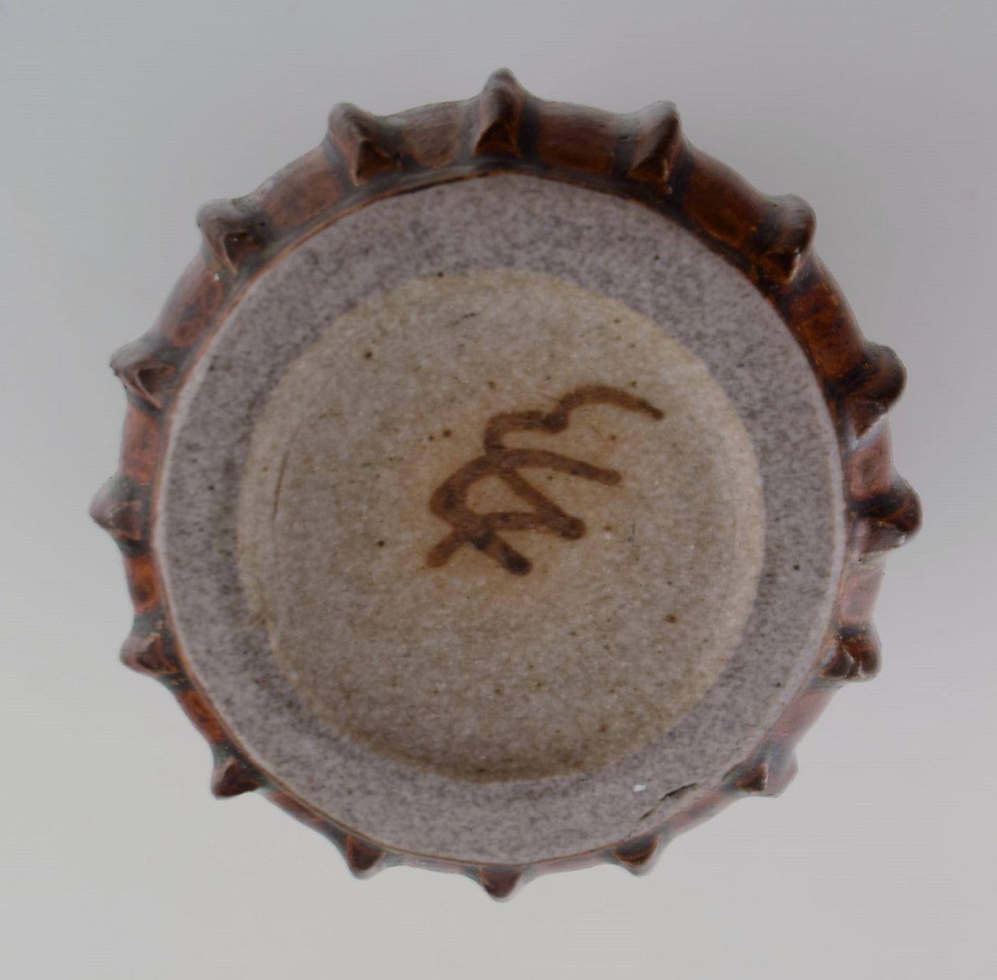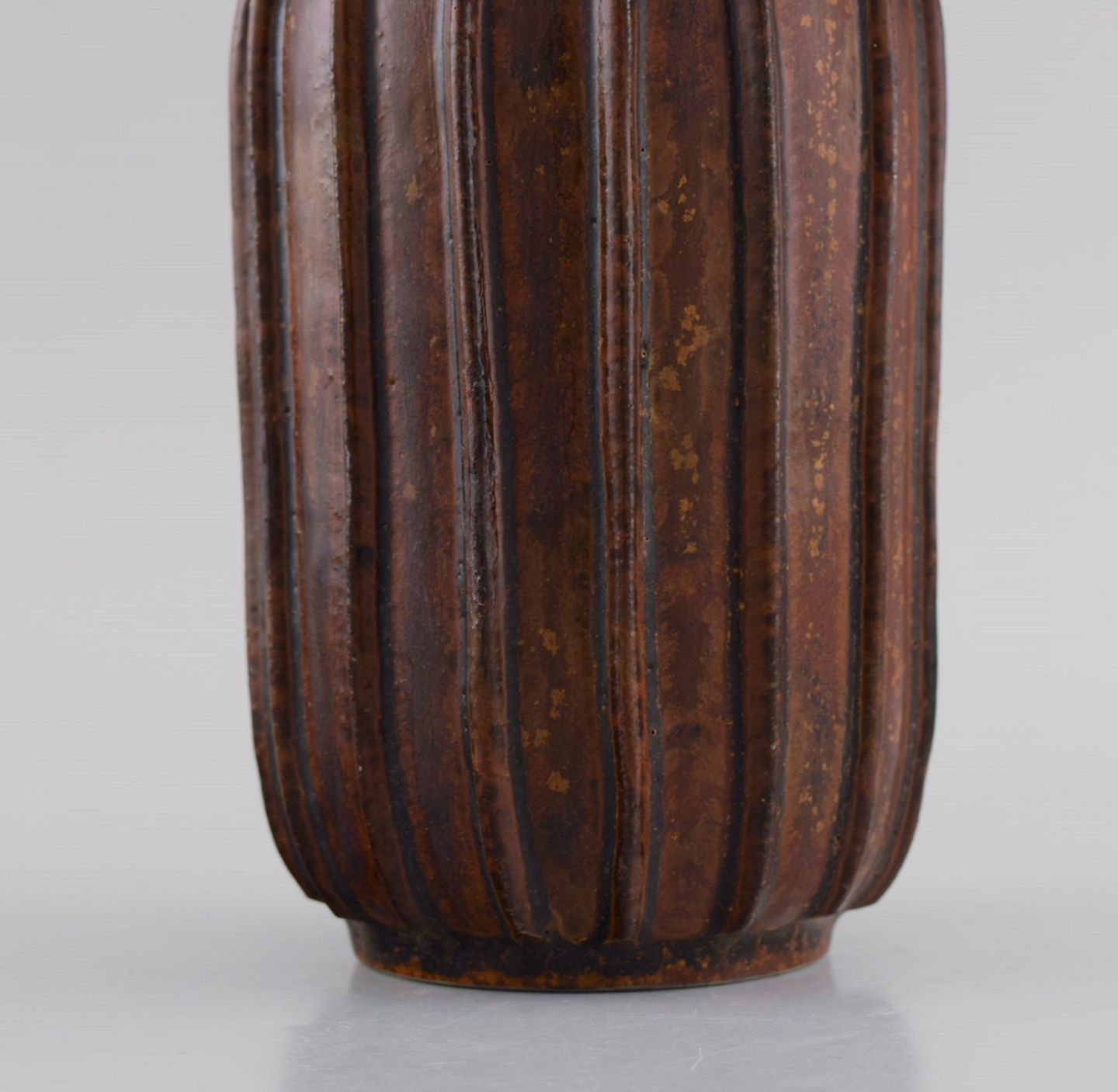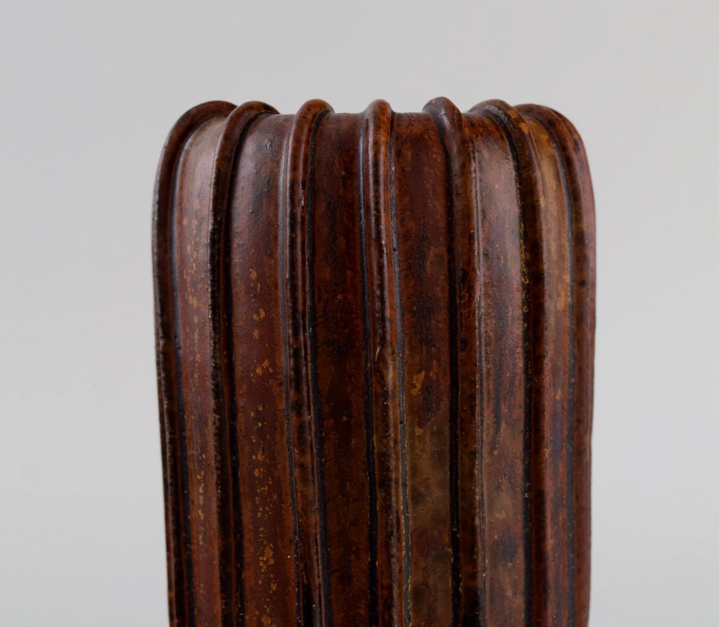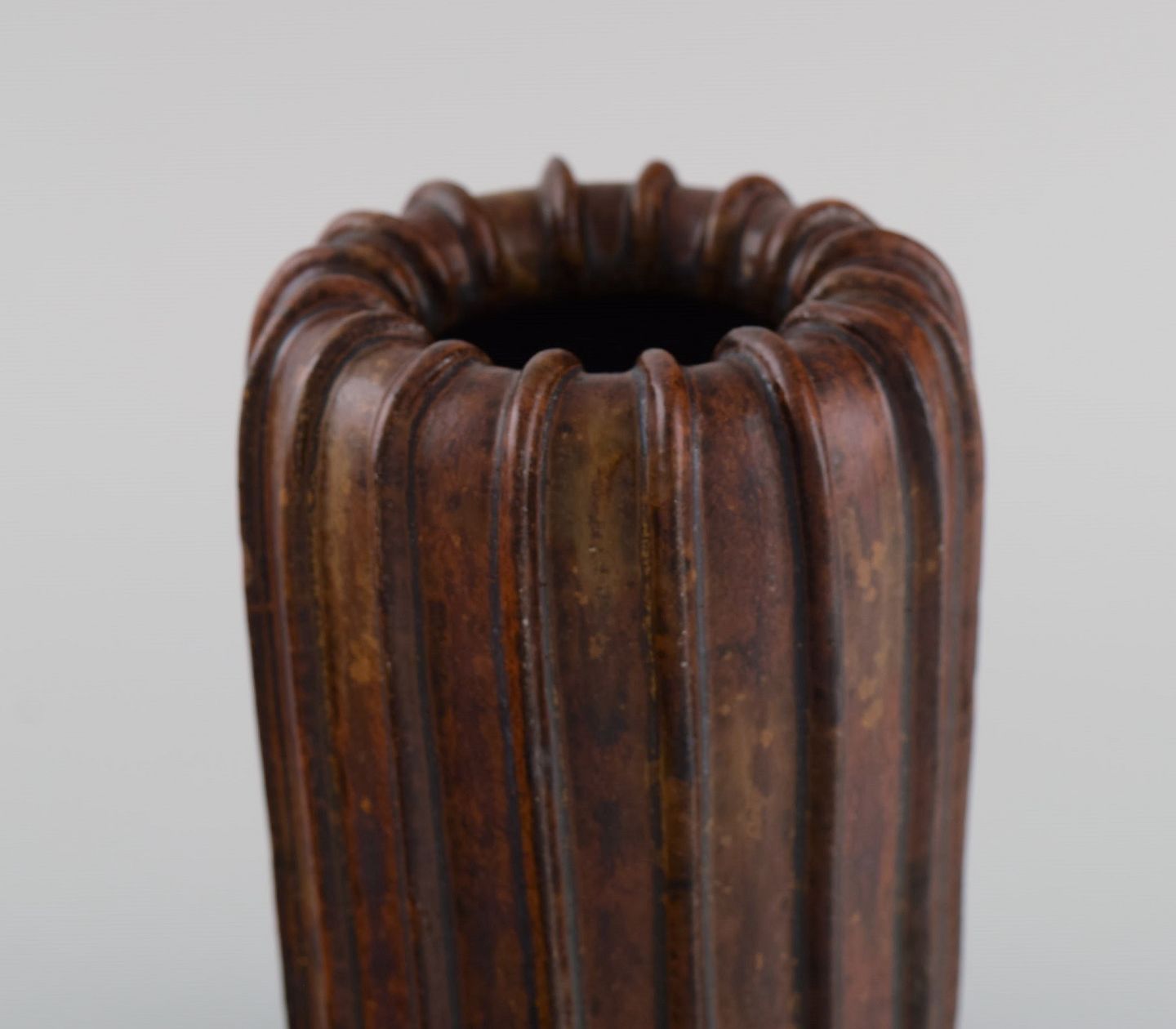 Arne Bang (1901-1983), Danmark. Vase med kanneleret korpus i glaseret keramik. Smuk glasur i brune nuancer. Midt 1900-tallet. Måler: 14 x 9,5 cm. I flot stand. Signeret i monogram.