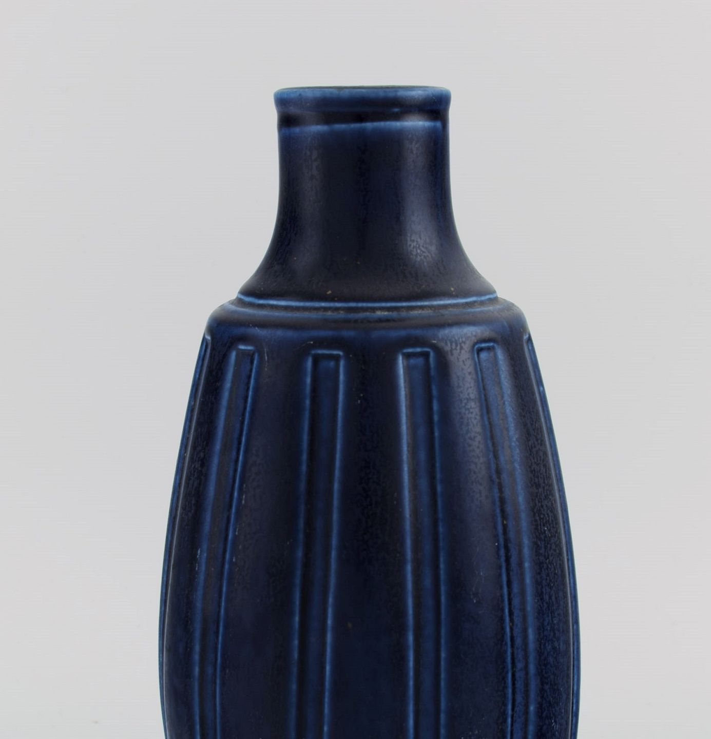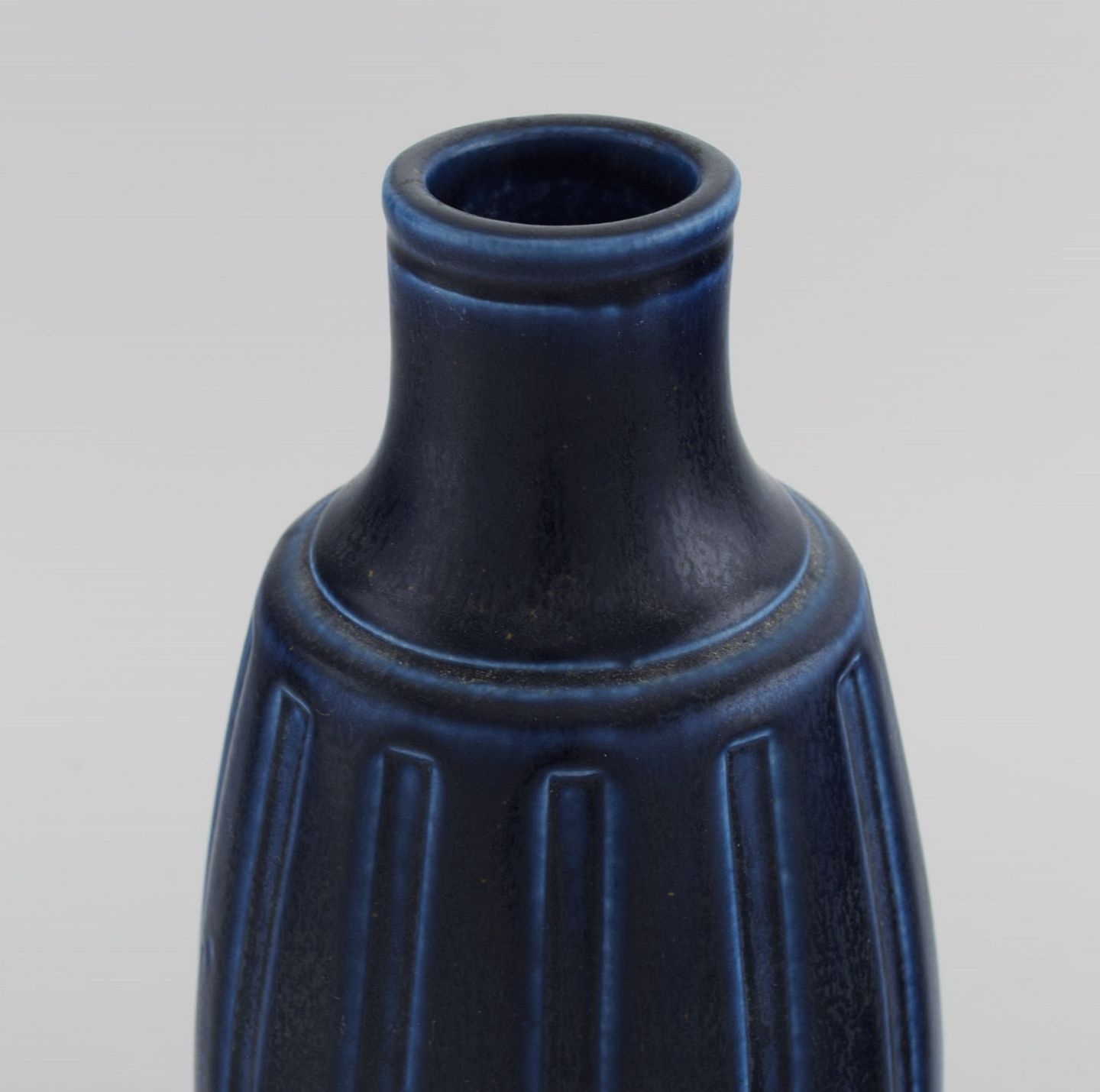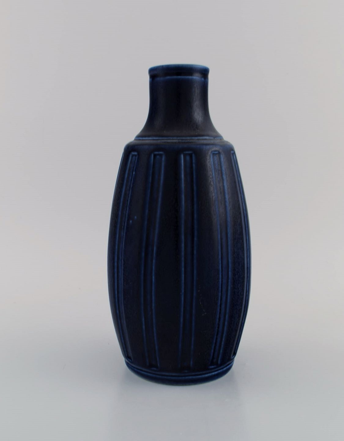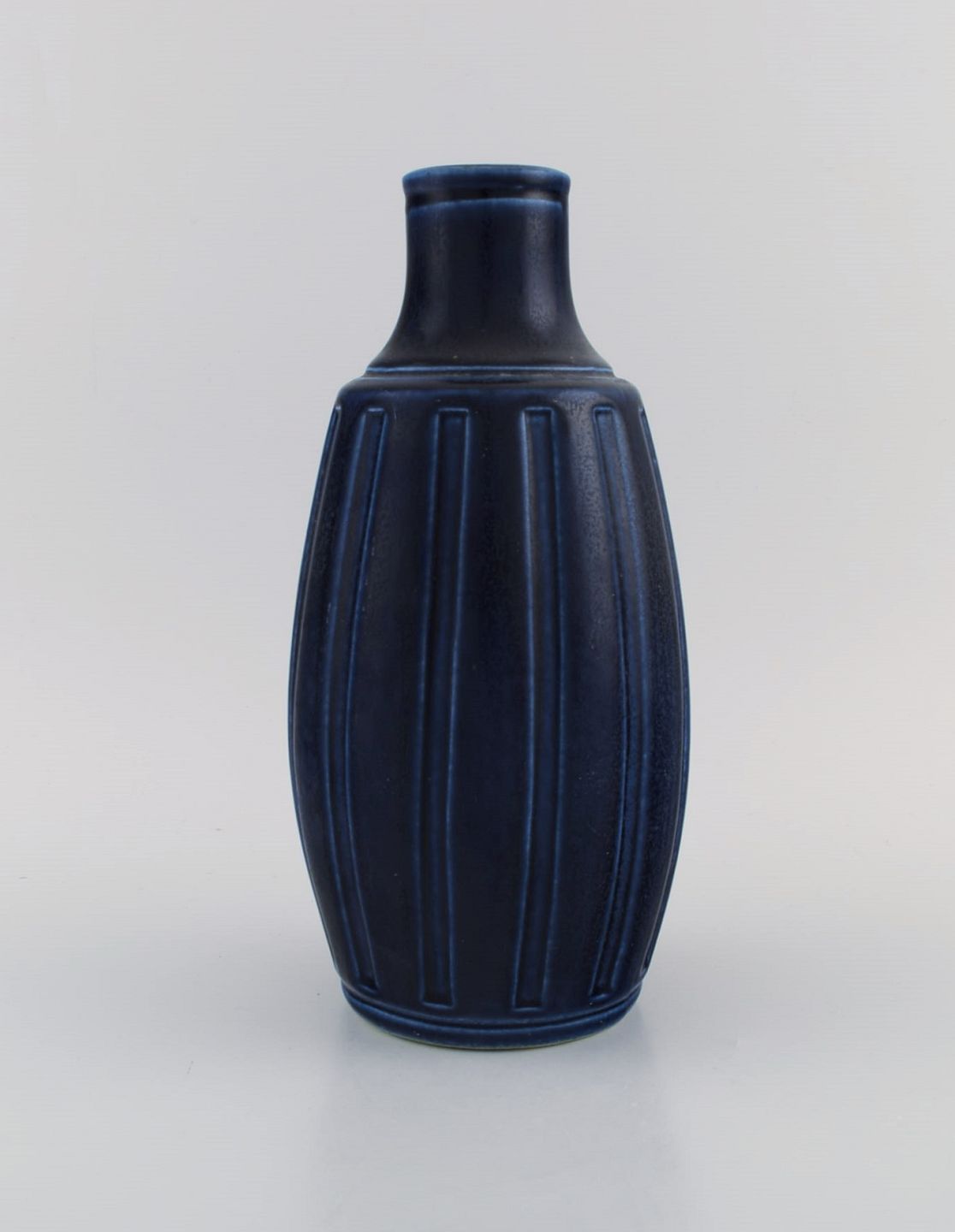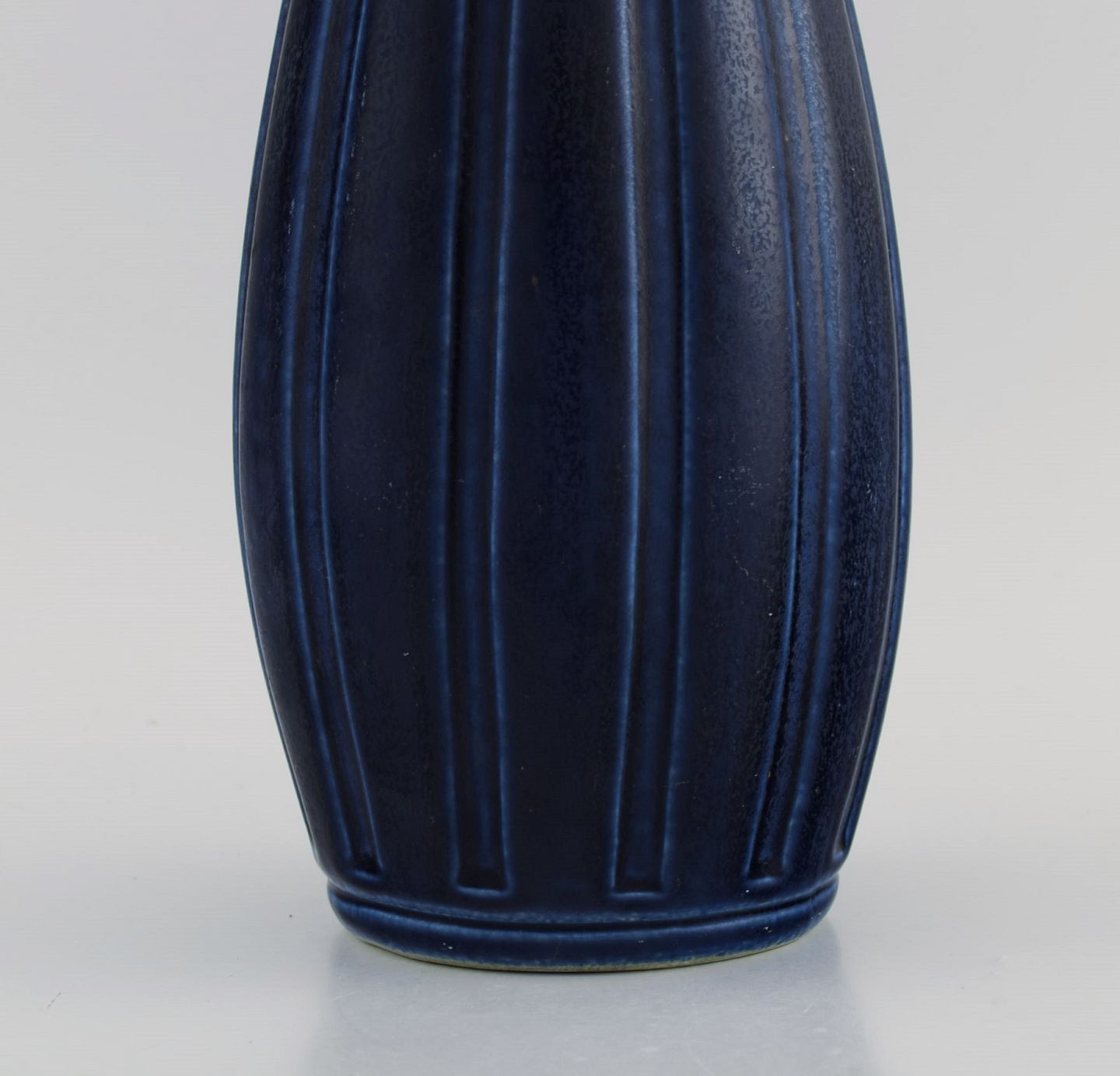 Wilhelm Kåge (1889-1960) for Gustavsberg. Vase i glaseret stentøj. Smuk glasur i mørkeblå nuancer. Midt 1900-tallet. Måler: 26 x 12 cm. Stemplet. Gustavsberg Kåge Verkstad. I flot stand.