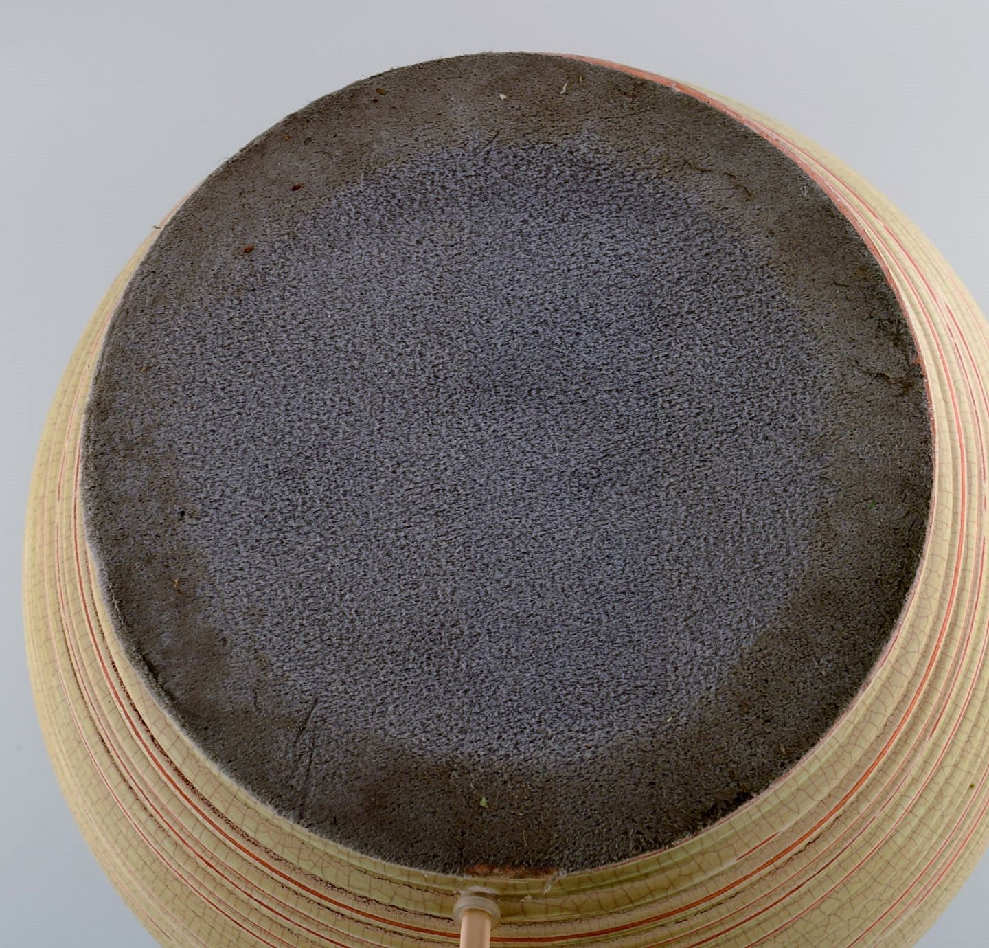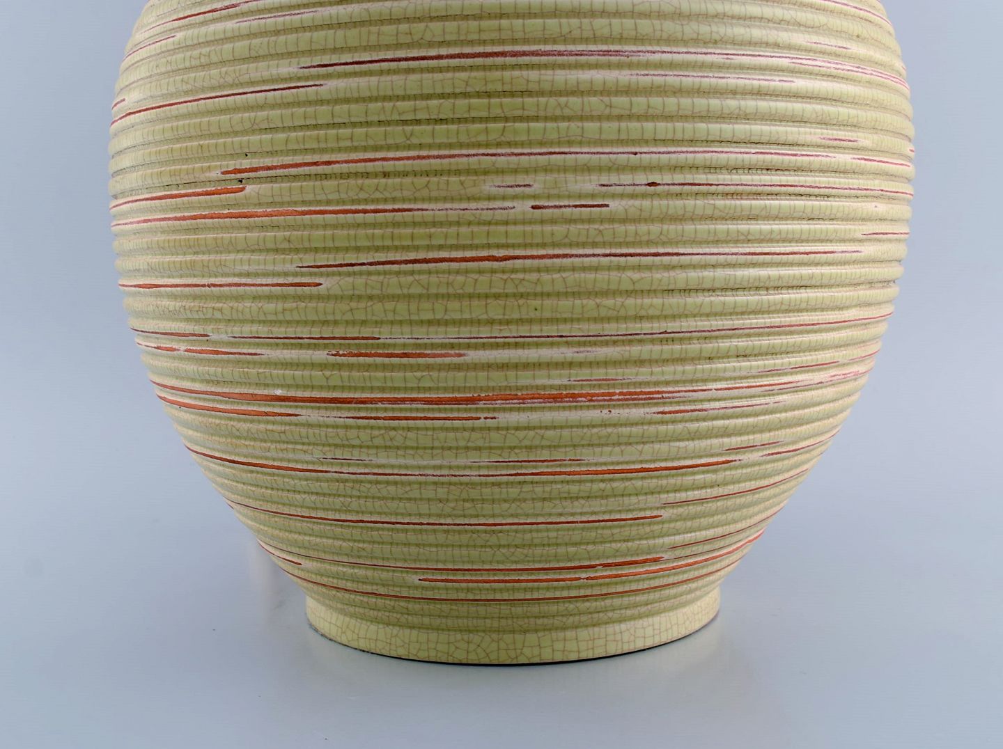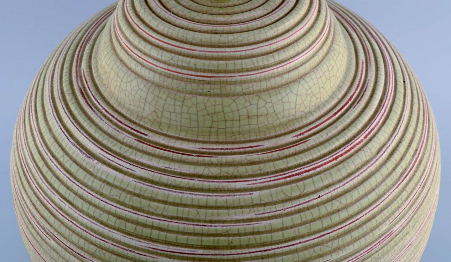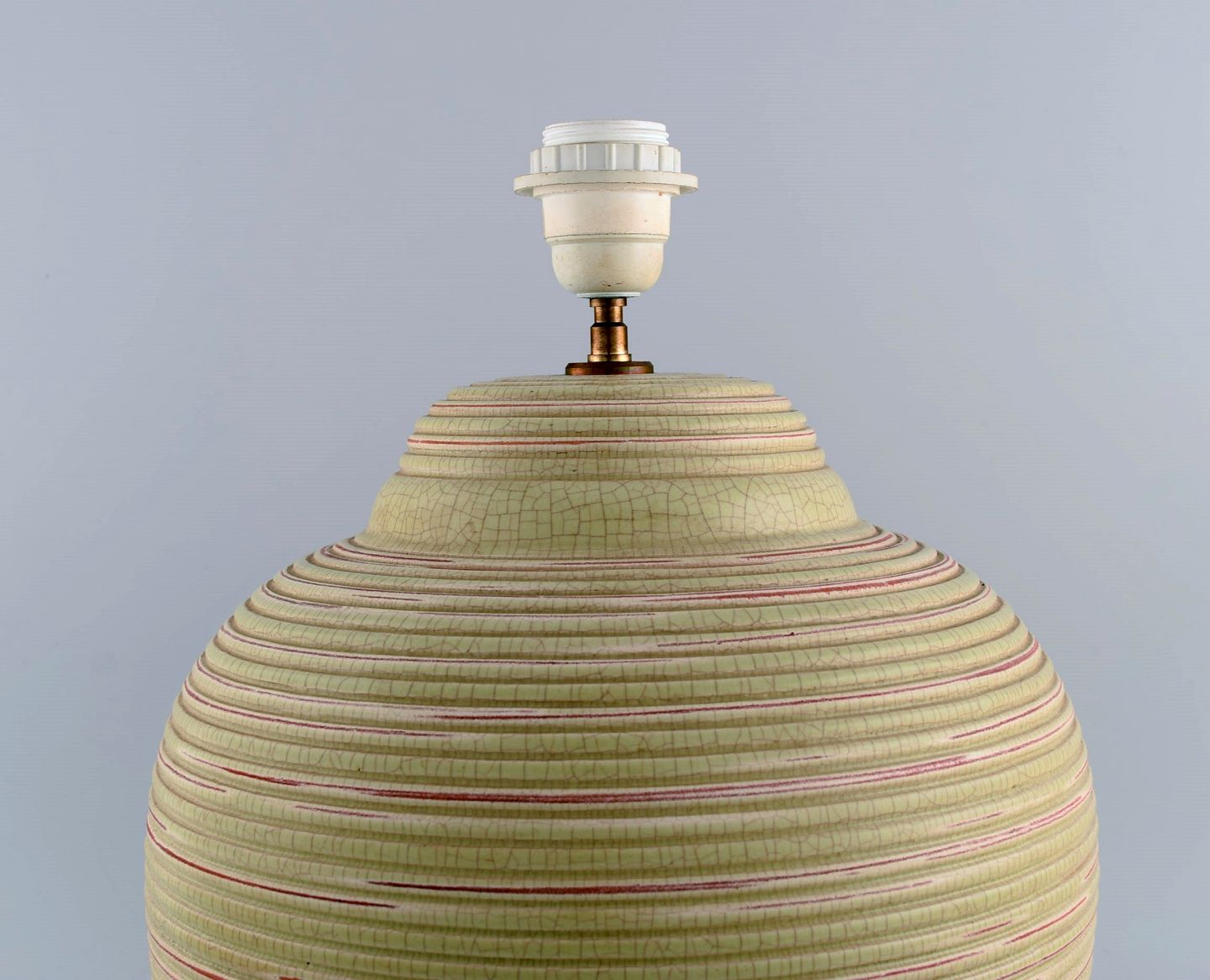 Europæisk studiokeramiker. Stor bordlampe i glaseret stentøj med rillet korpus. Smuk krakeleret glasur. 1970'erne.