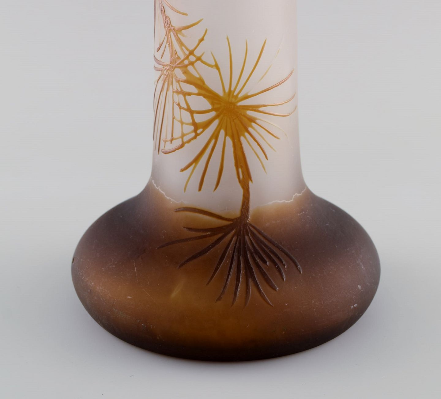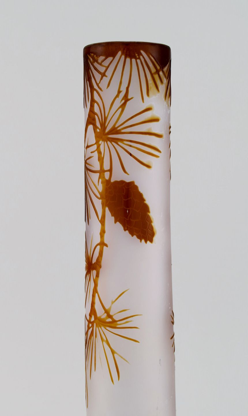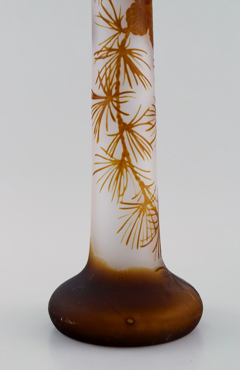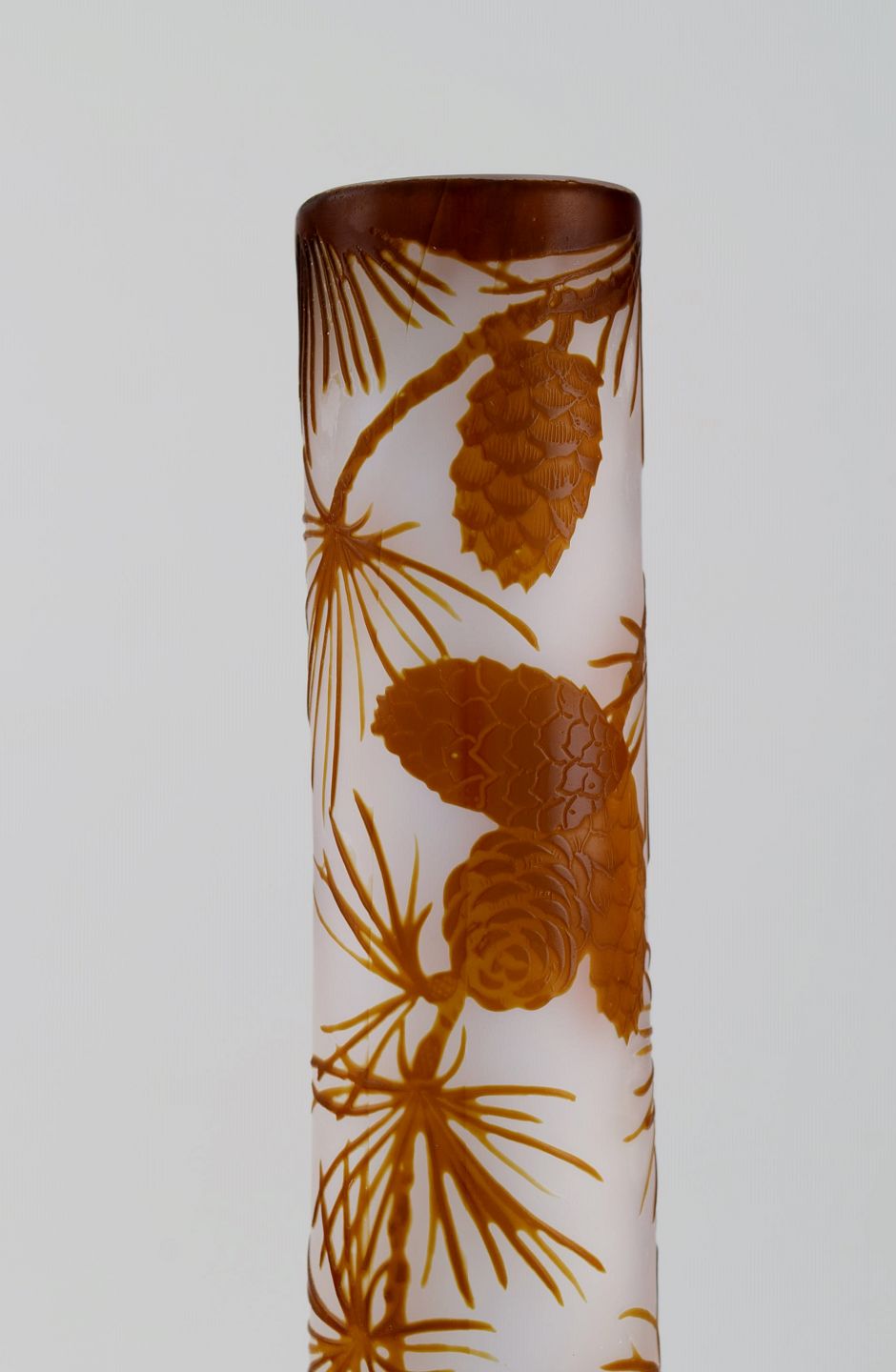Antik Emile Gallé vase i matteret kunstglas med lysebrunt overfang udskåret i form af grankogler og grene. Tidligt 1900-tallet. Måler: 34 x 12,5 cm. I flot stand. Signeret.