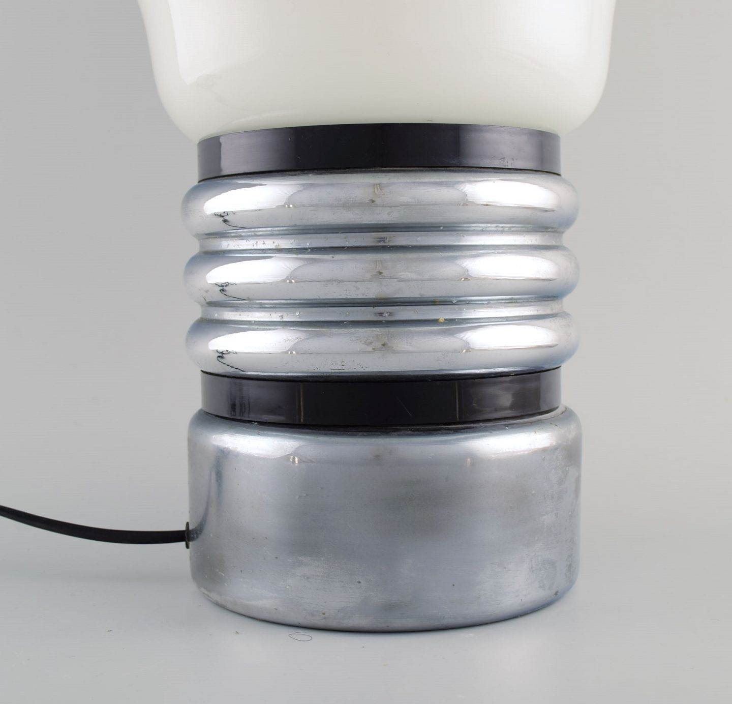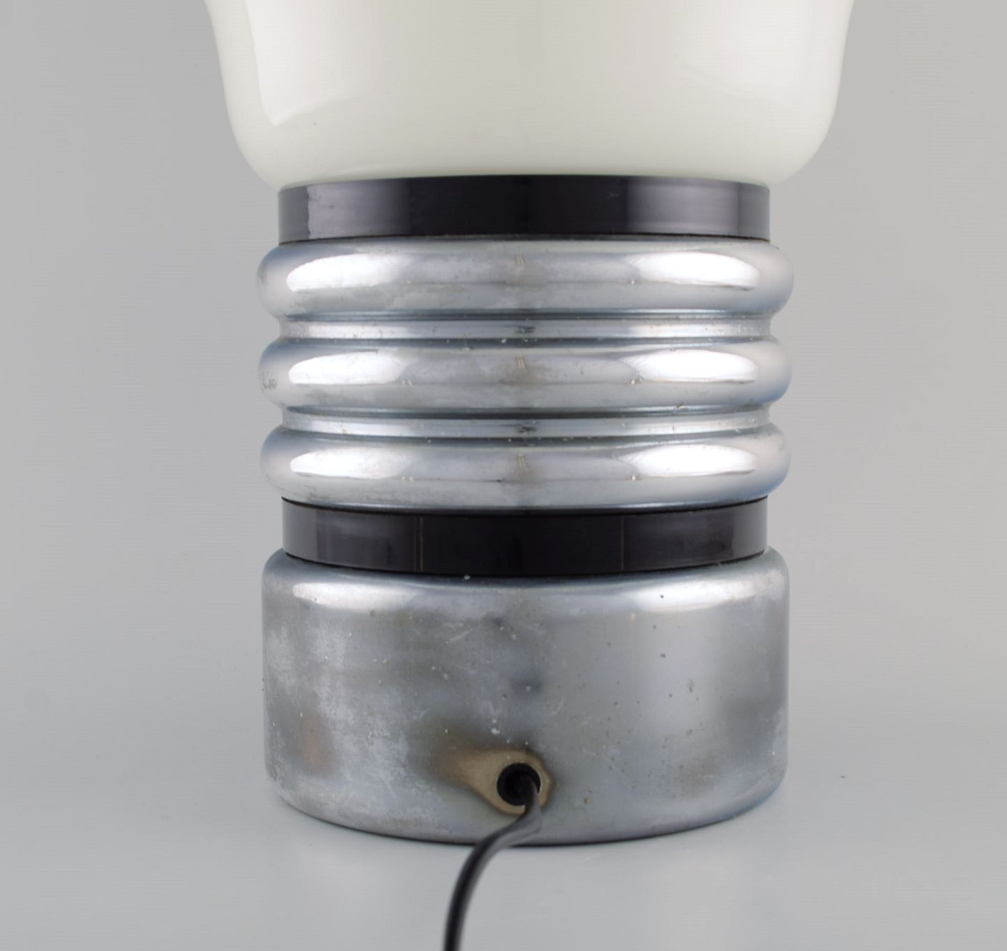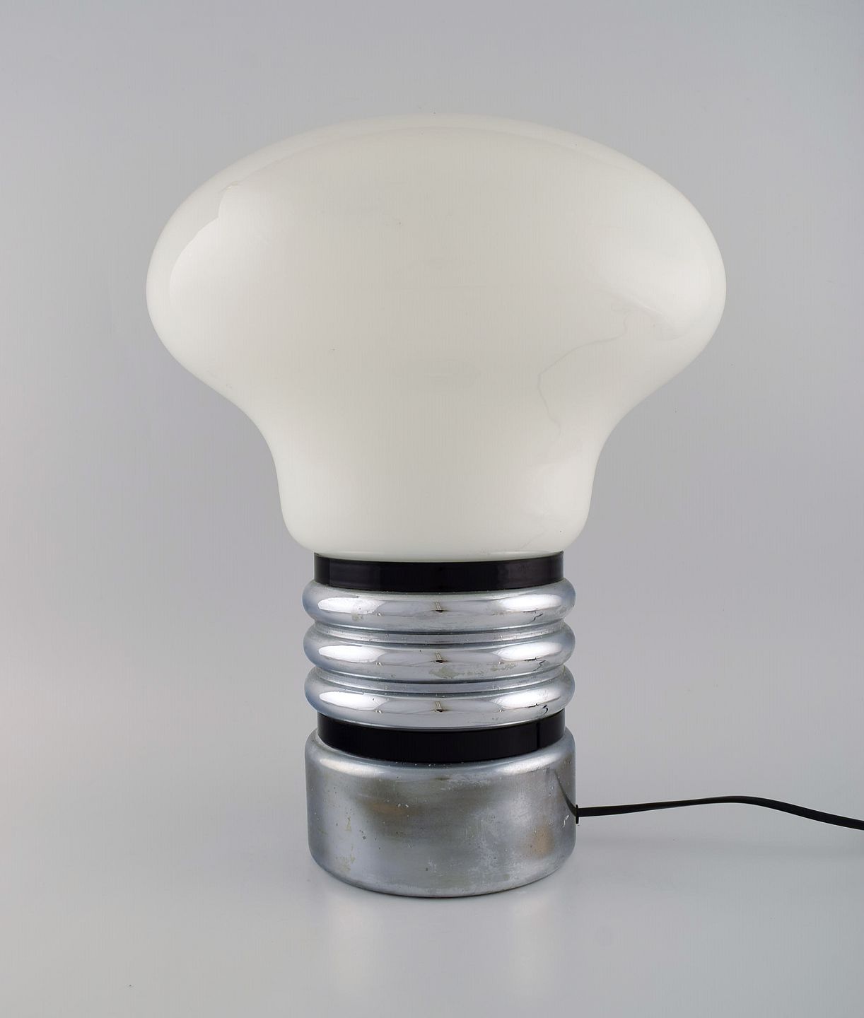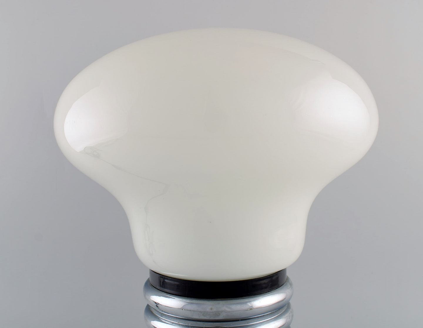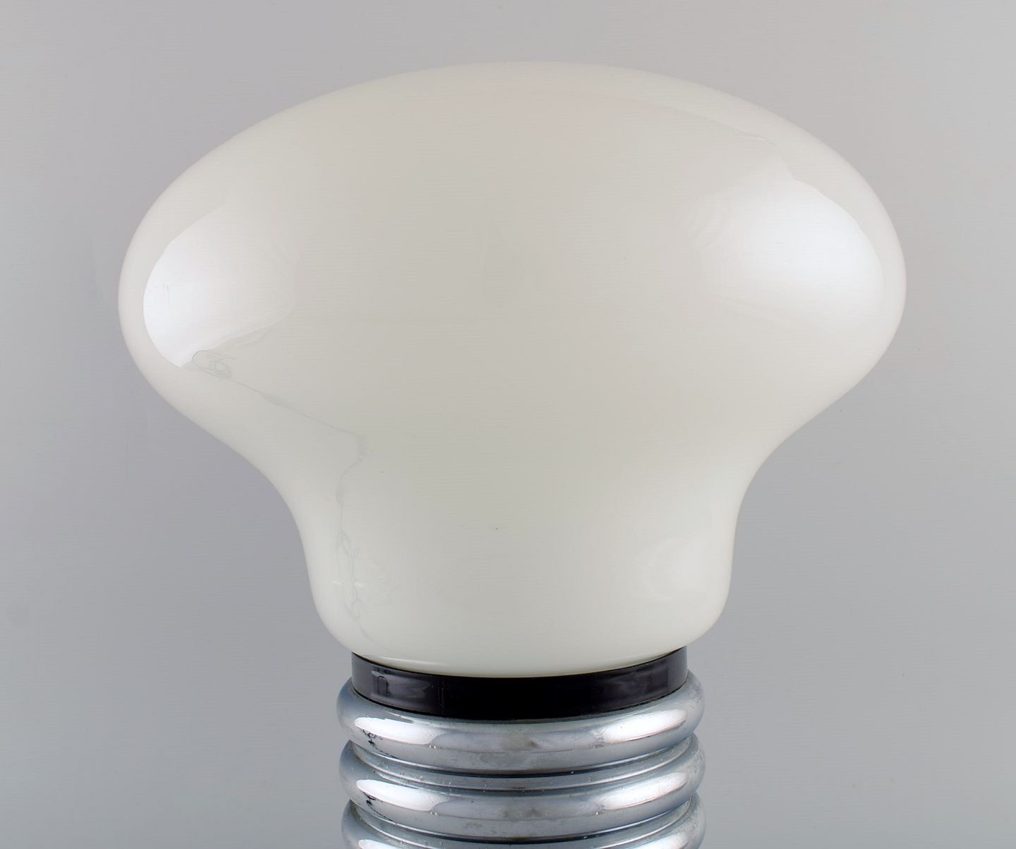 Stor italiensk designer bordlampe formet som elpære. 1980'erne. Måler: 42 x 34 cm I flot stand. Materiale: Forkromet metal og mundblæst opalglas.