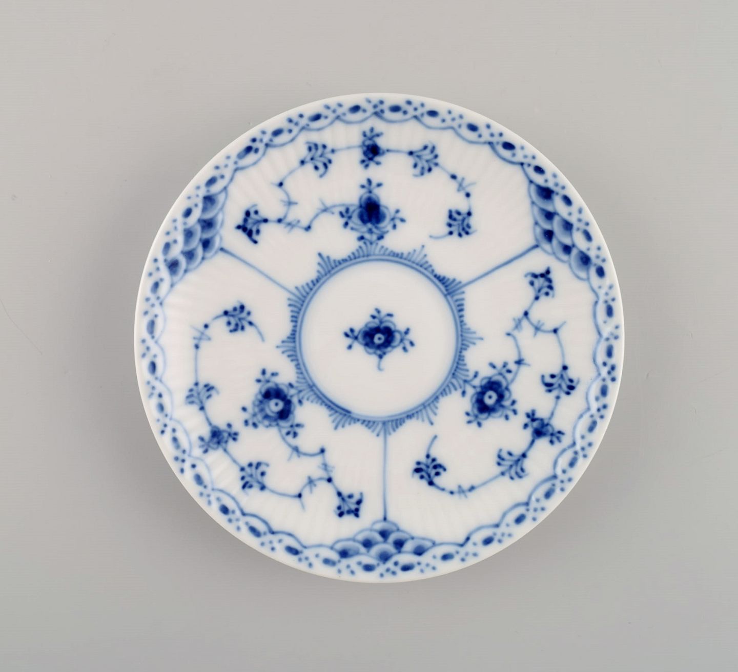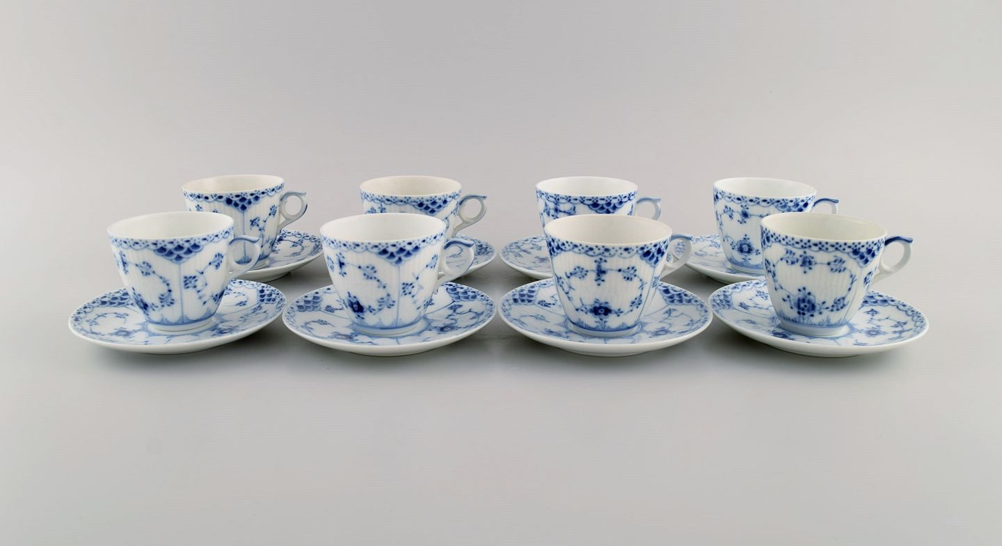 Eight Royal Copenhagen Blue Fluted Half Lace coffee cups with saucers. Model number 1/719. The coffee cup measures: 7.2 x 6 cm. Saucer diameter: 12.8 cm. In excellent condition. Stamped. 1st factory quality.