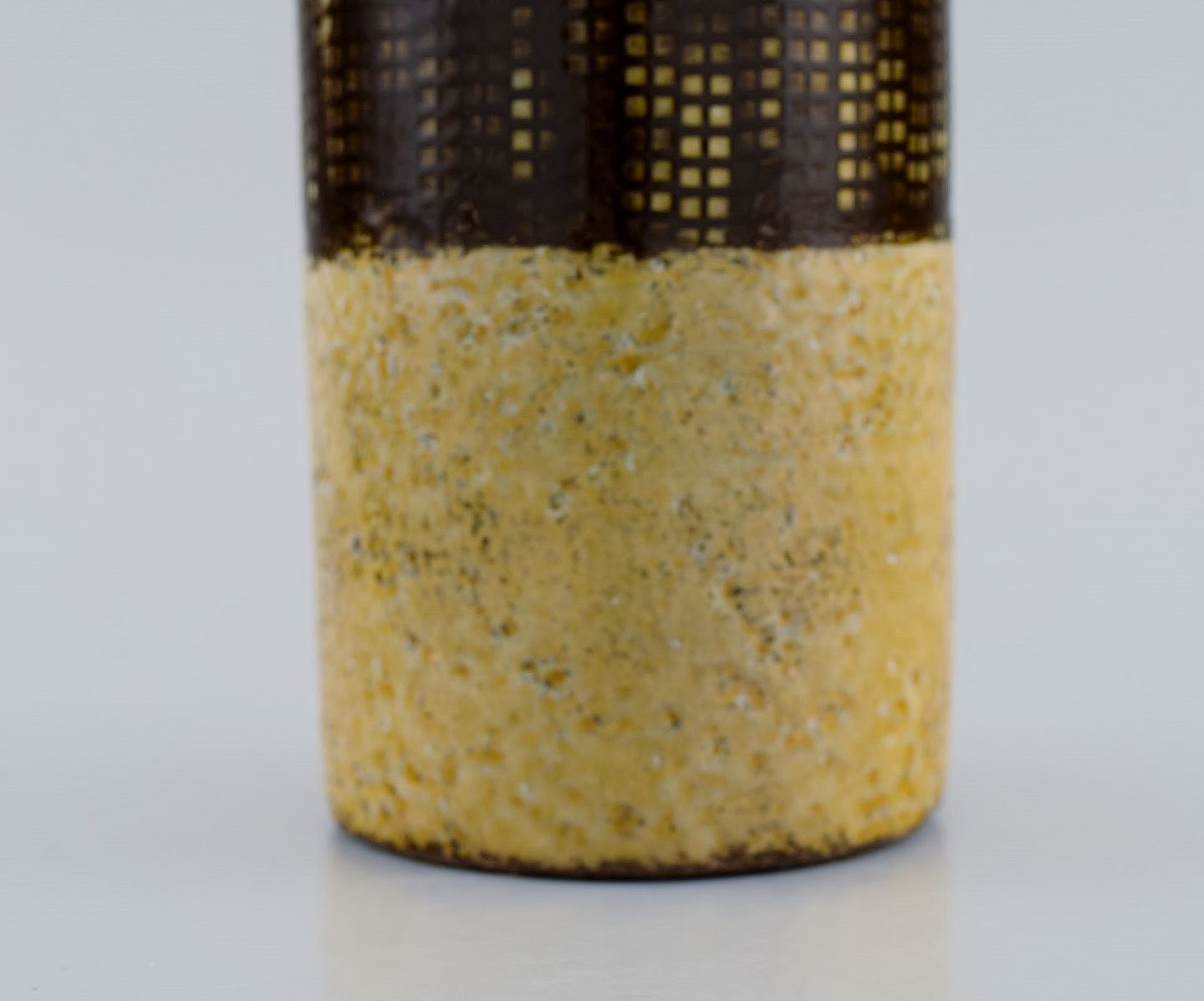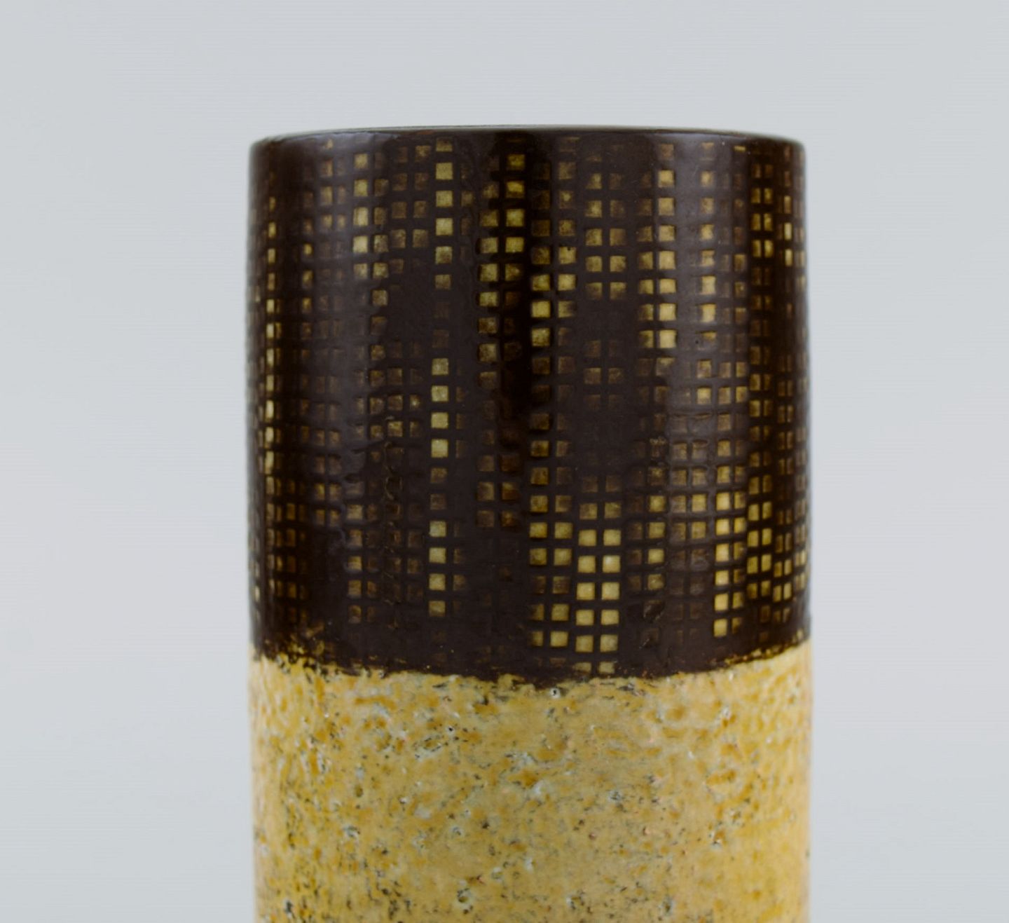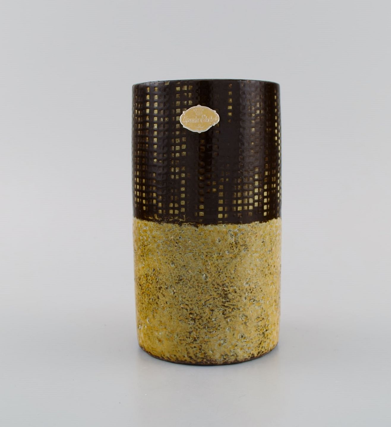 Ingrid Atterberg (1920-2008) for Upsala-Ekeby. Yondel vase i glaseret stentøj. Delt glasur i brune og sennepsgule nuancer. Ca. 1960. Måler: 14,5 x 8 cm. I flot stand. Stemplet.