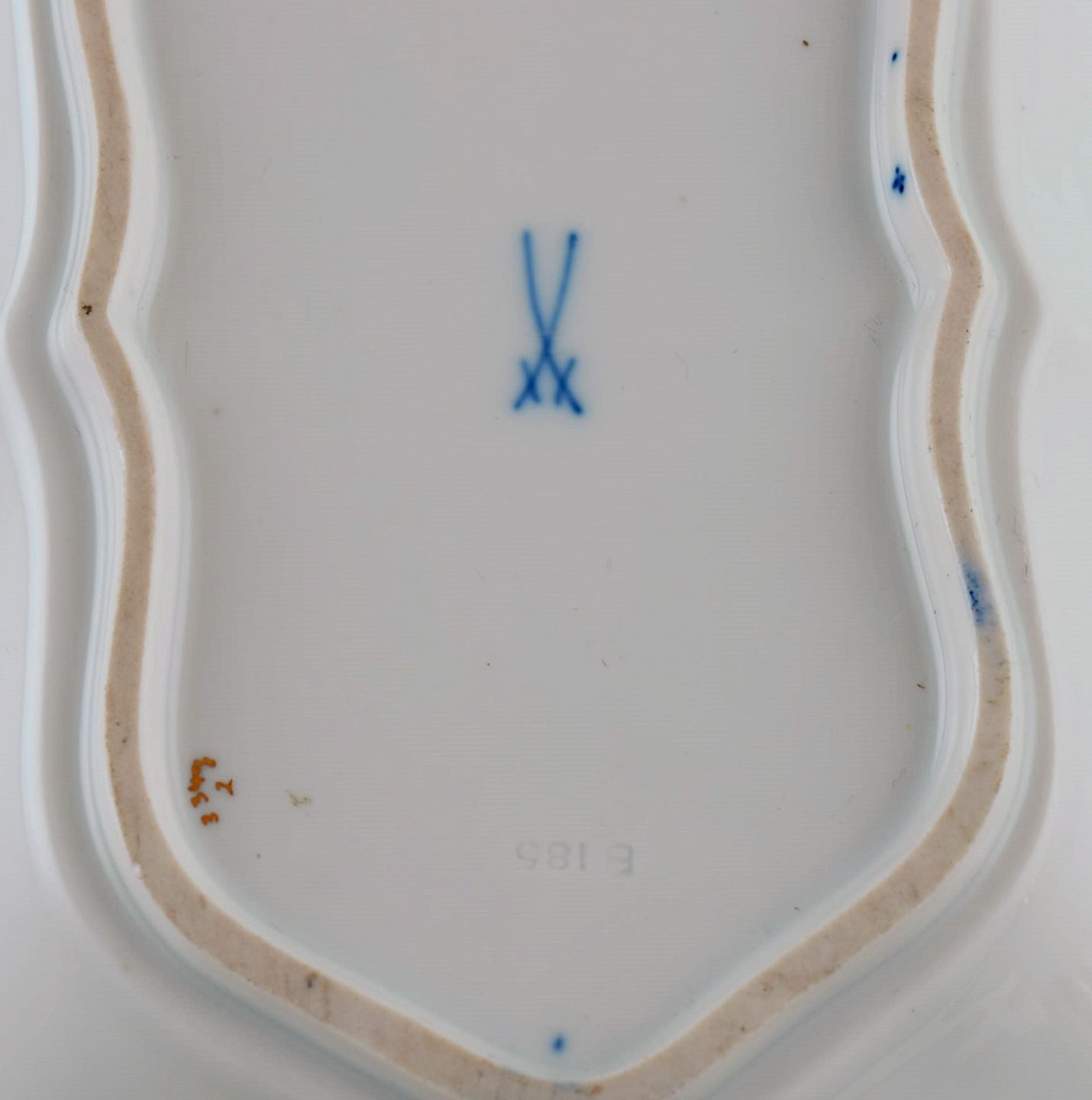 Antik Meissen skål i håndmalet porcelæn. Bladværk i hvidt og guld på mørkeblå baggrund. Tidligt 1900-tallet. Måler: 31 x 19,5 x 6,5 cm. I flot stand. 3. Sortering. Stemplet.