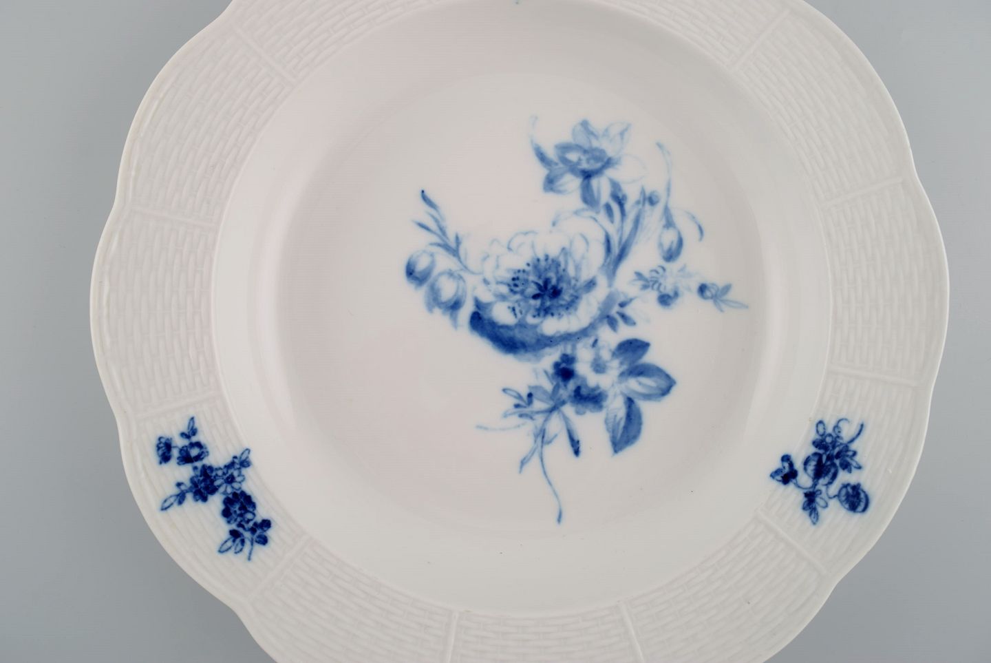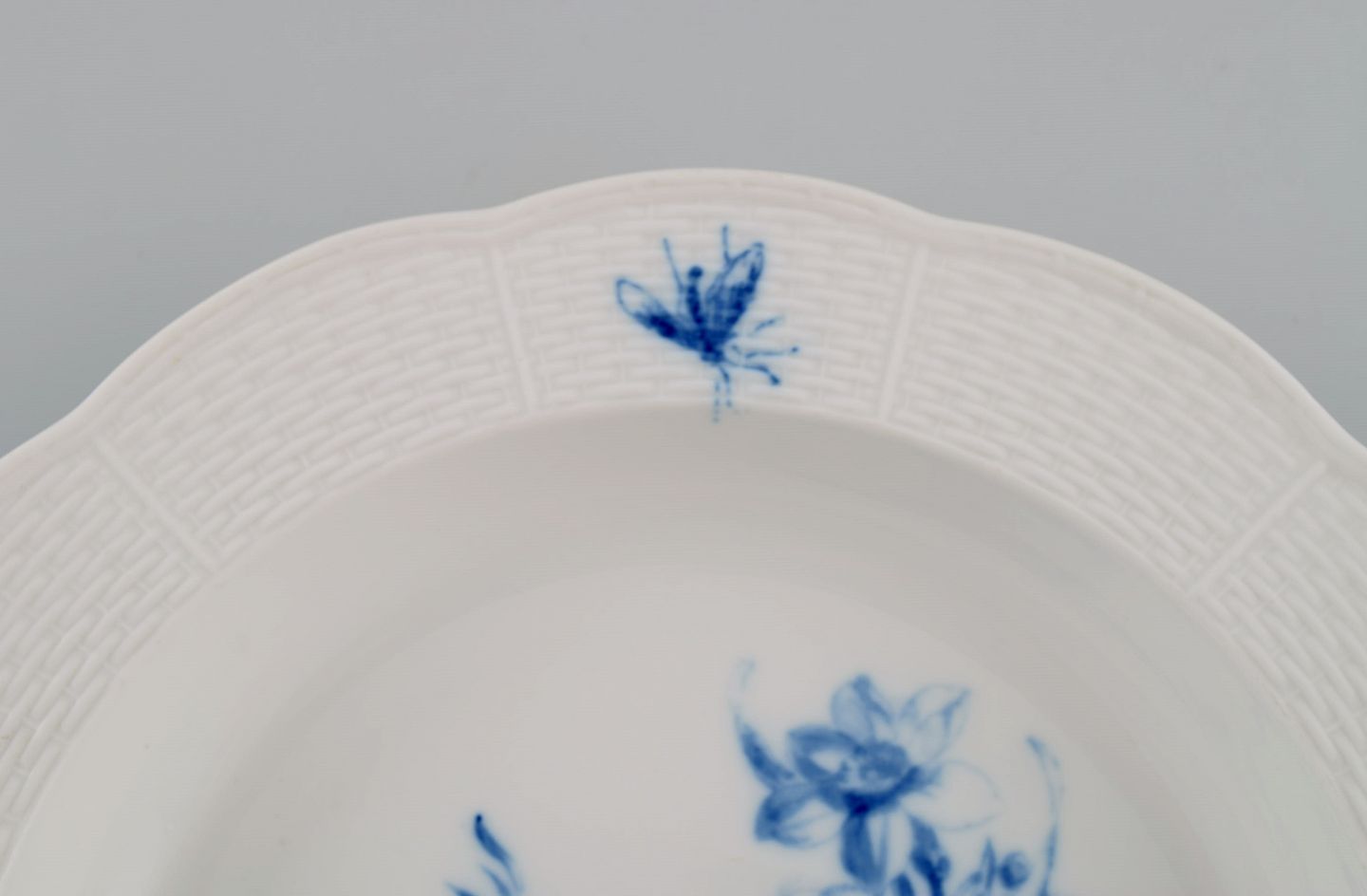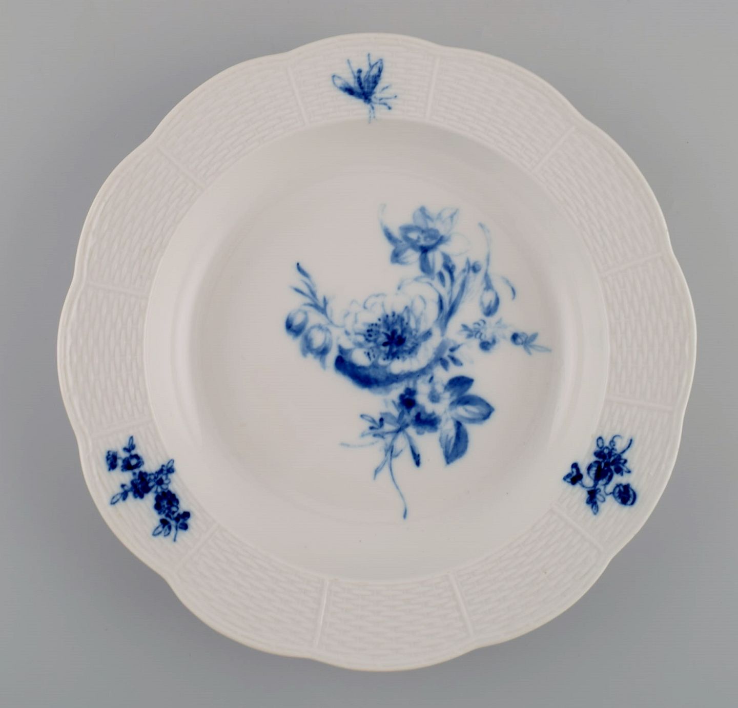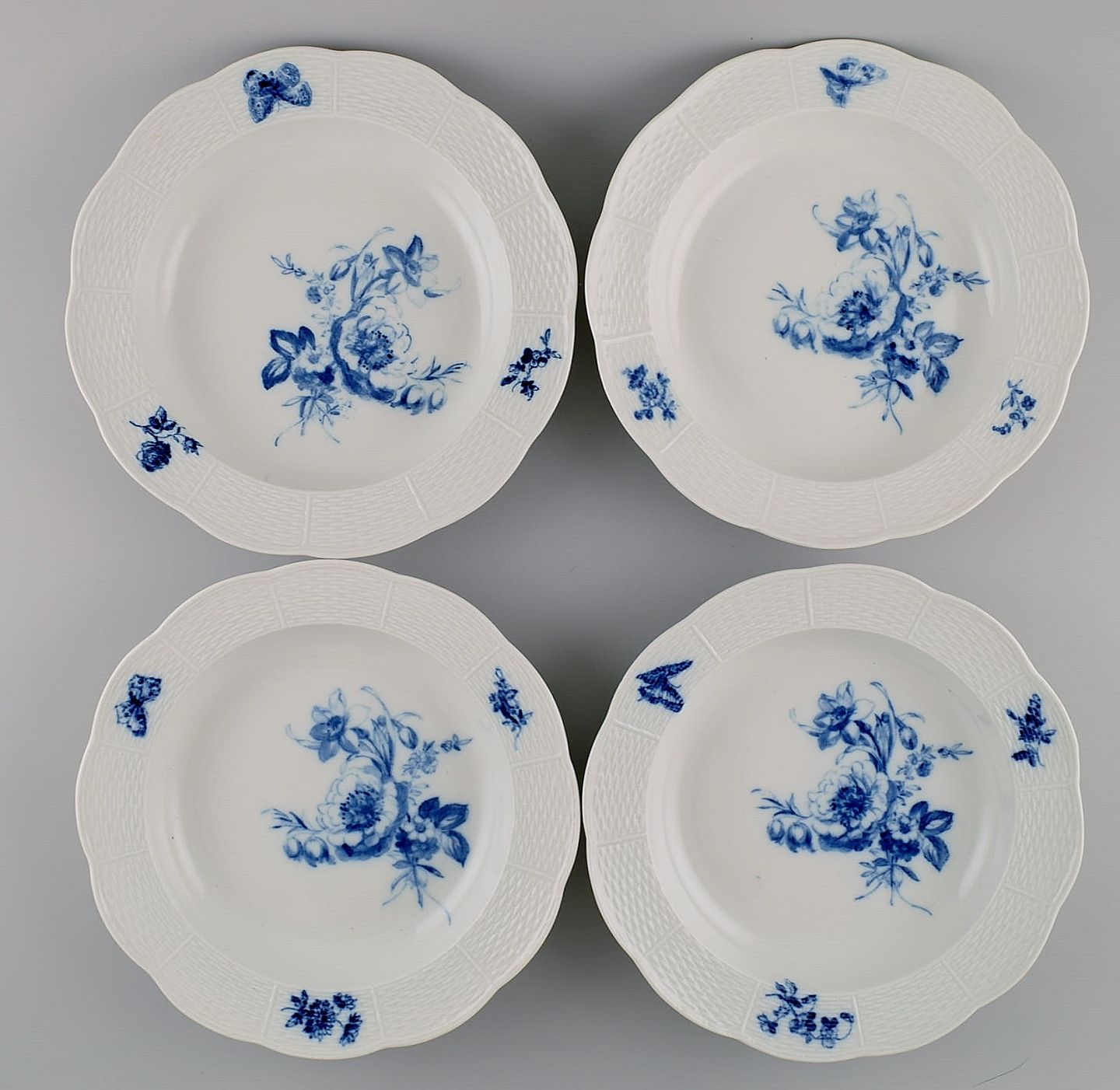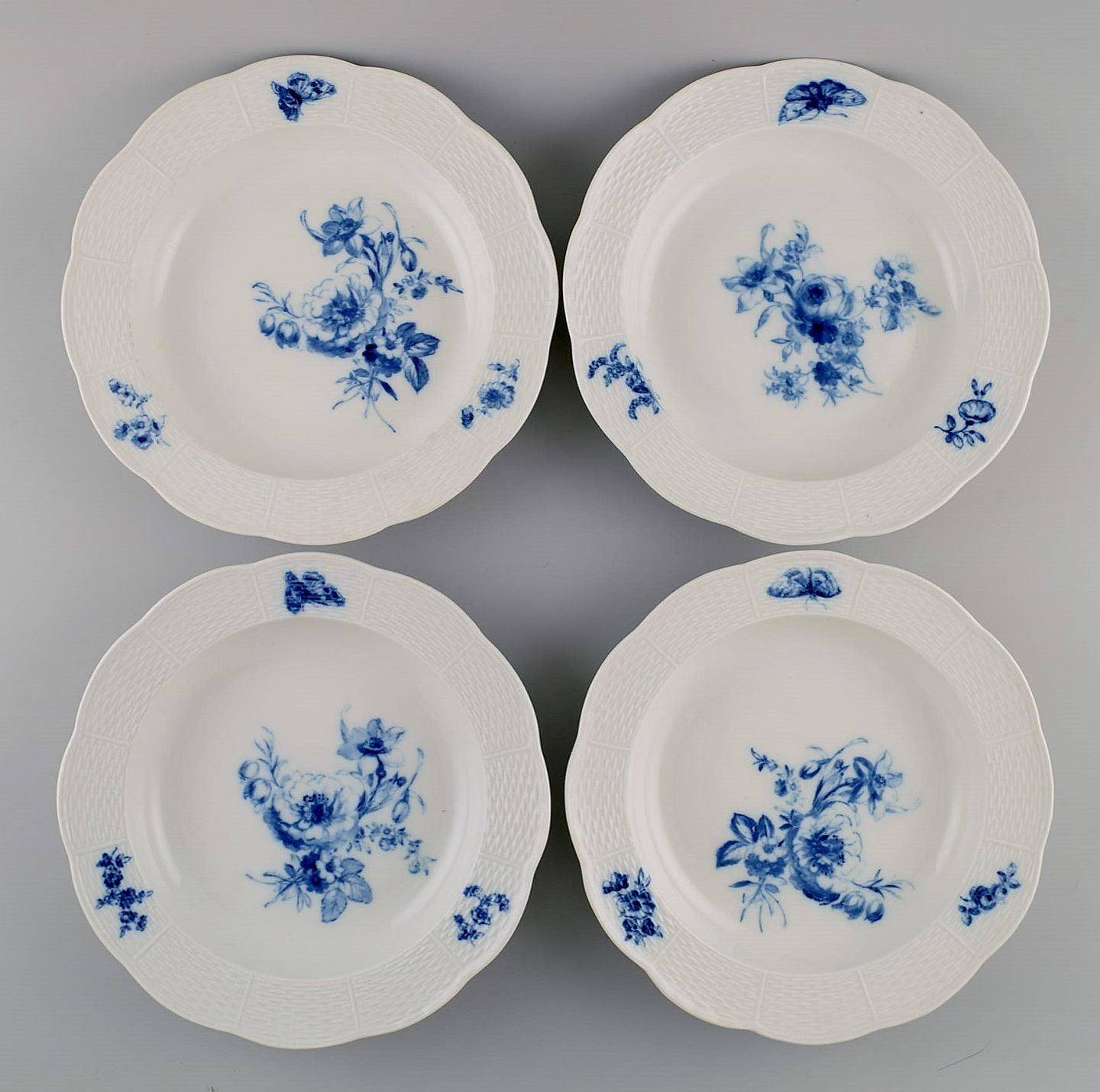 11 antikke Meissen dybe tallerkener i håndmalet porcelæn. Blå blomster og sommerfugle. Sent 1800-tallet. Måler: 25 x 4 cm. I flot stand. Stemplet. 3. Sortering.