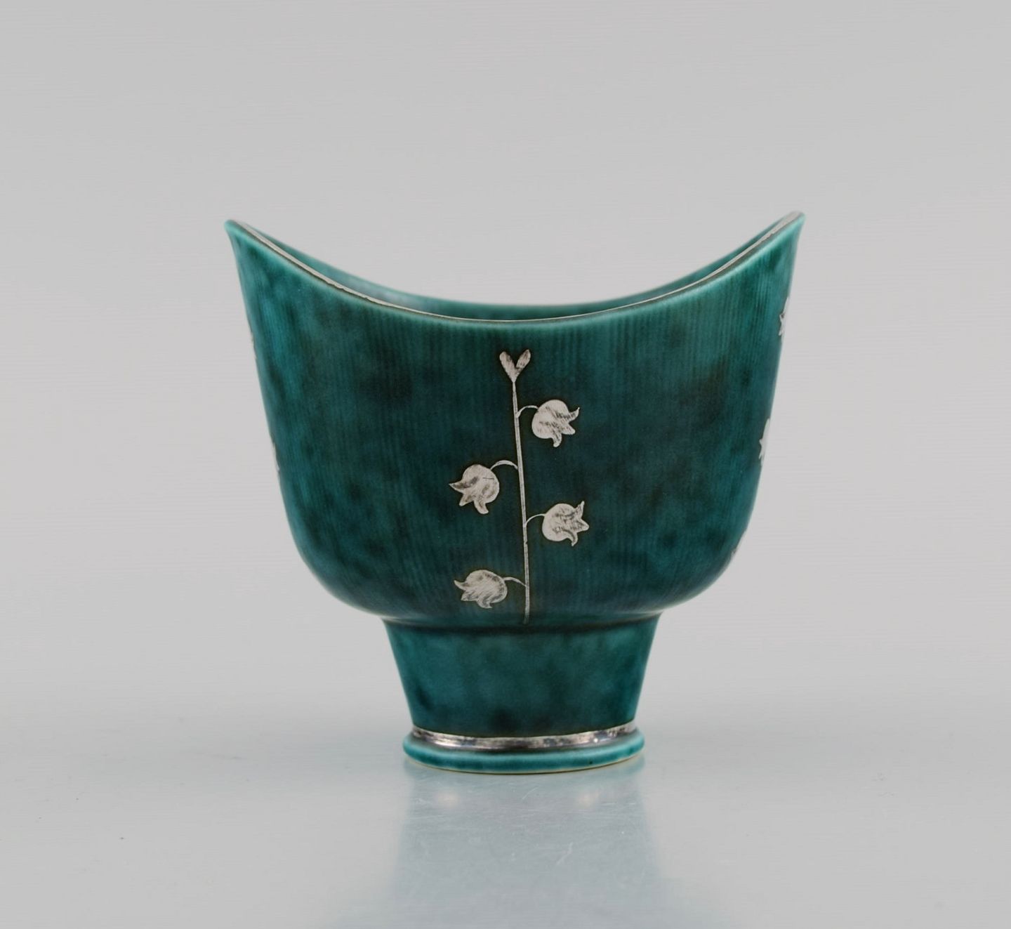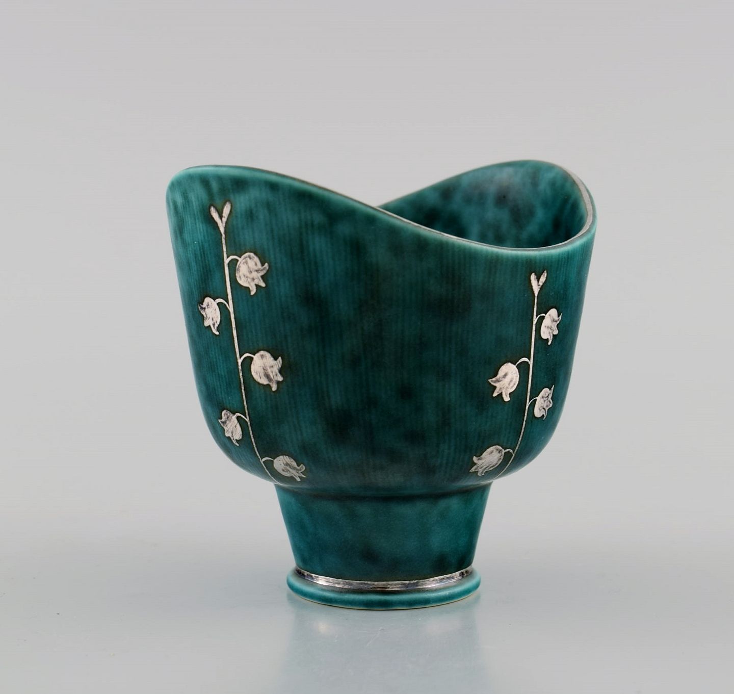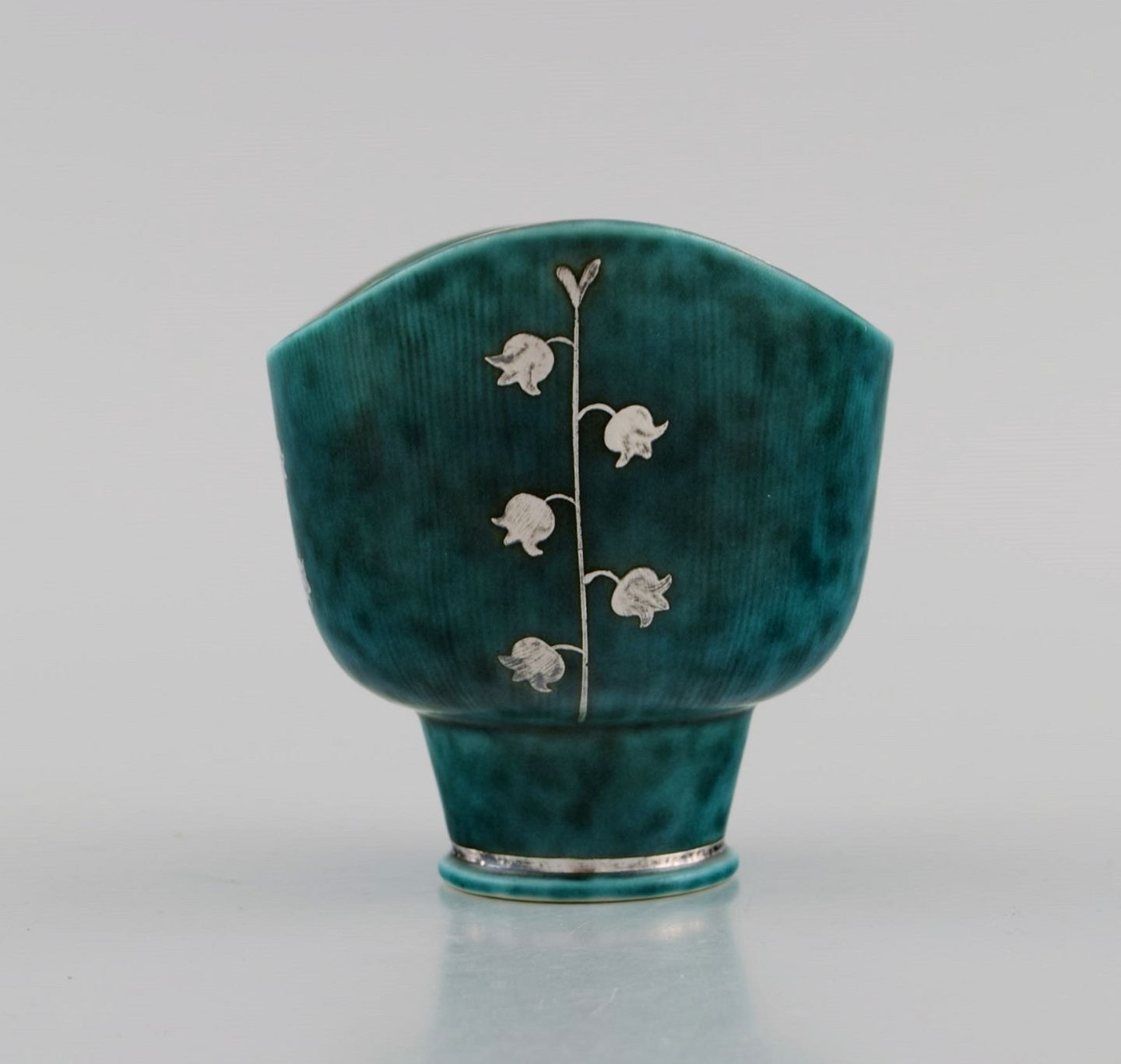 Wilhelm Kåge (1889-1960) for Gustavsberg. Argenta art deco vase i glaseret keramik. Smuk glasur i grønne nuancer med sølvindlæg i form af bladværk. Dateret 1952. Måler: 8,5 x 8,2 cm. I flot stand. Stemplet.