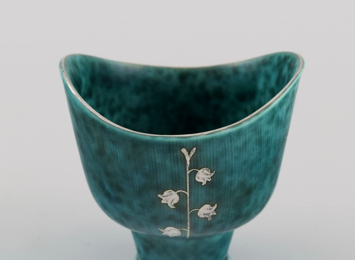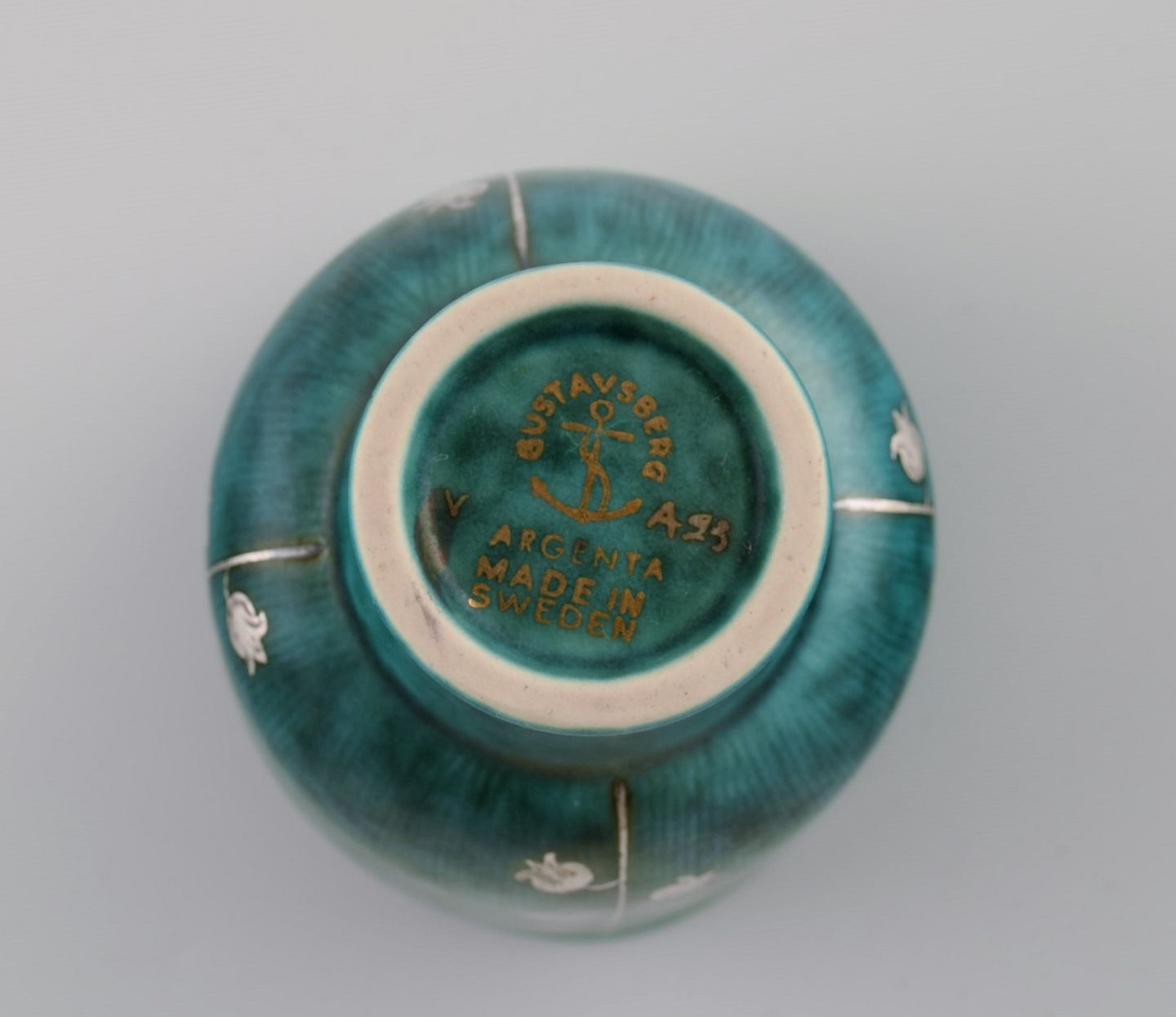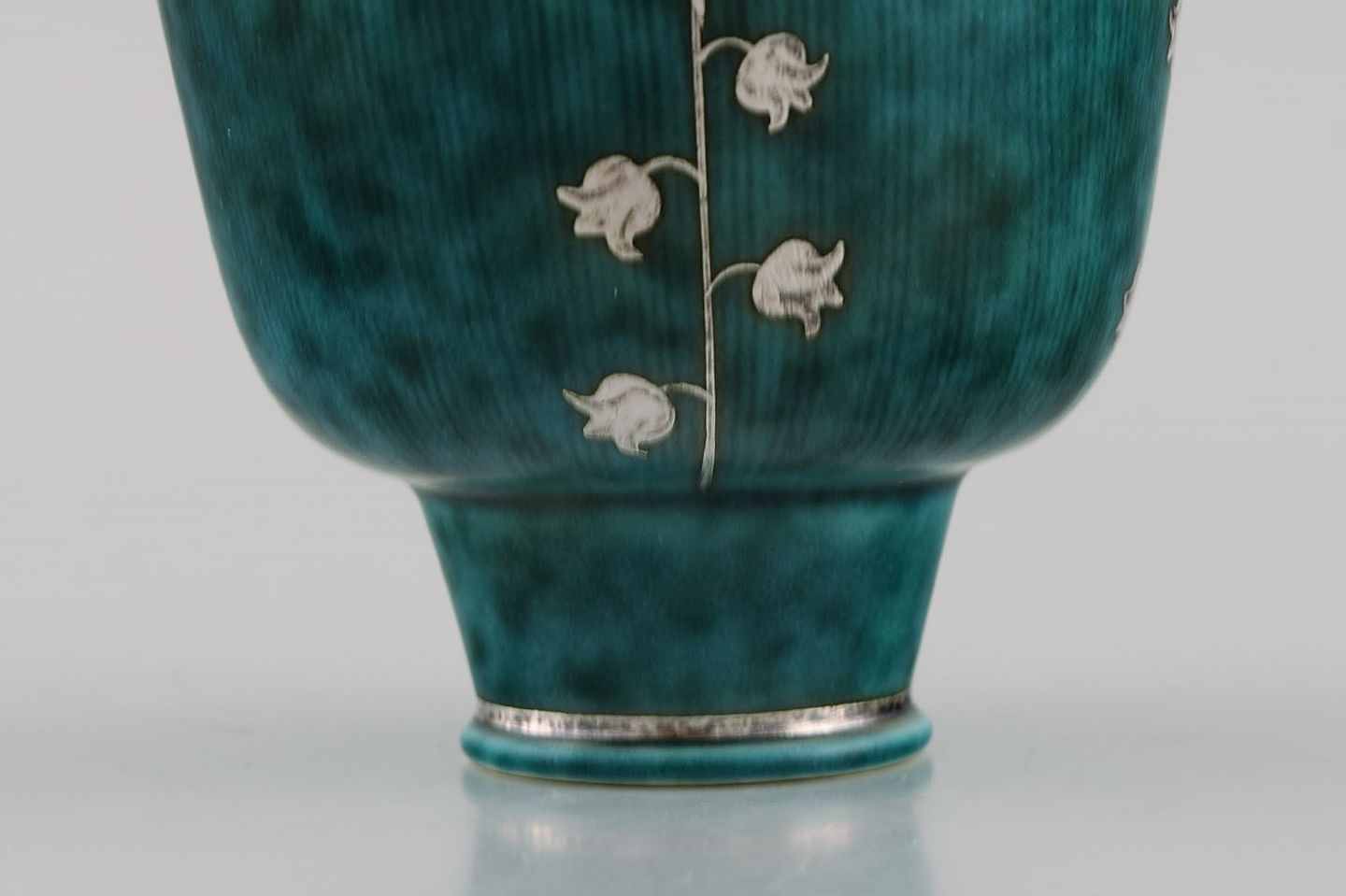 Wilhelm Kåge (1889-1960) for Gustavsberg. Argenta art deco vase i glaseret keramik. Smuk glasur i grønne nuancer med sølvindlæg i form af bladværk. Dateret 1952. Måler: 8,5 x 8,2 cm. I flot stand. Stemplet.