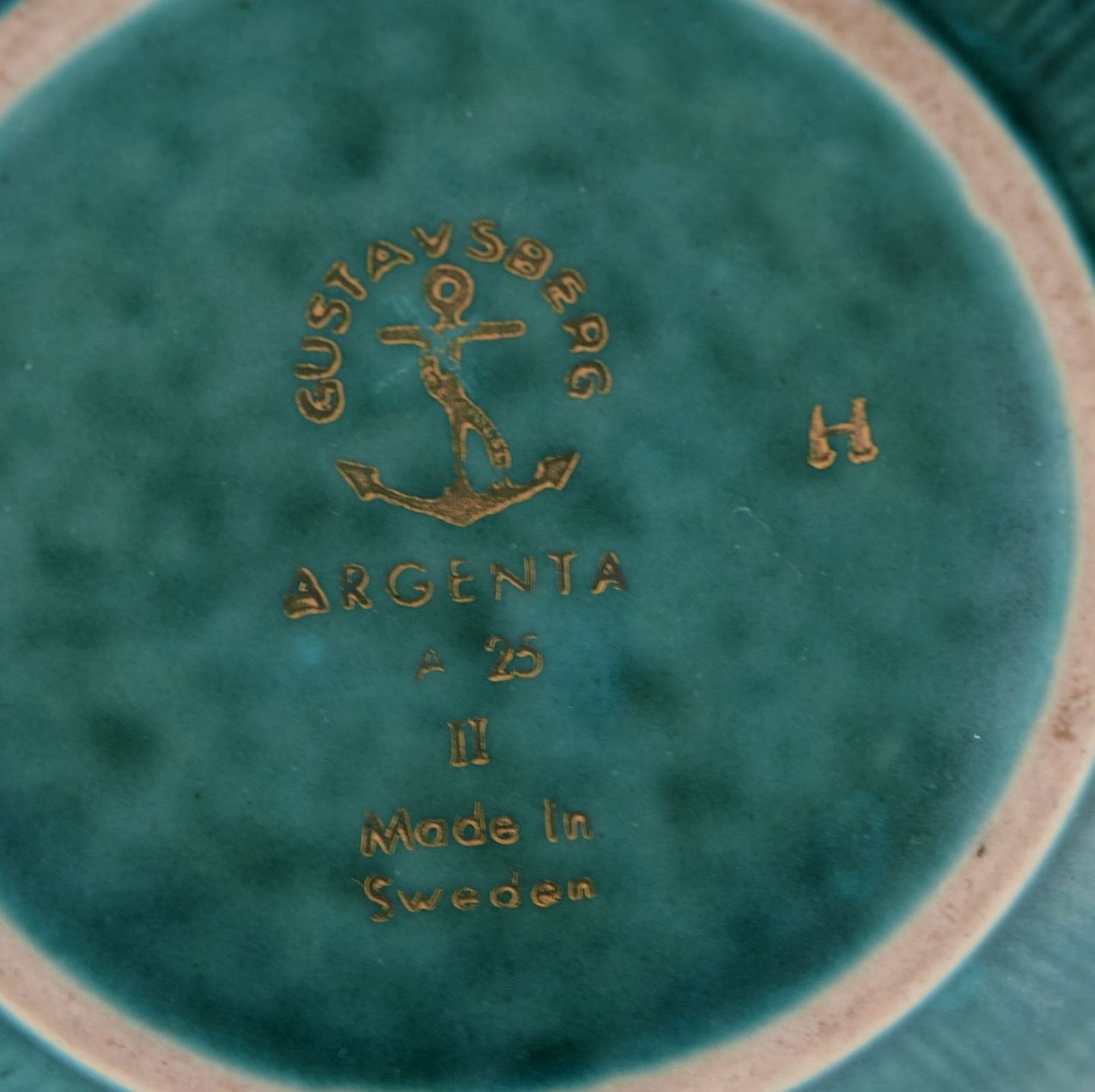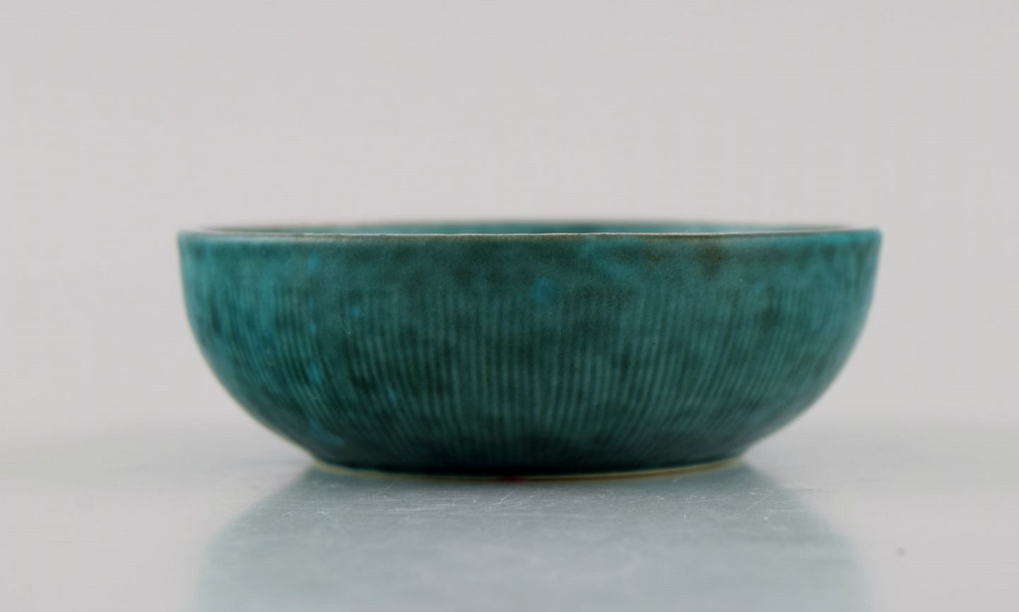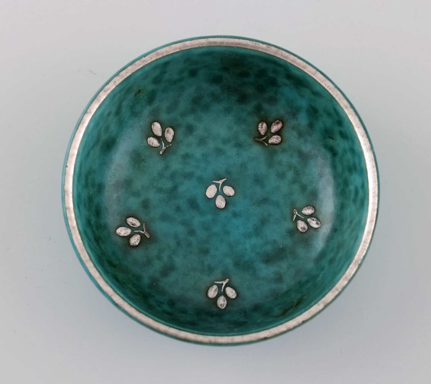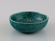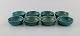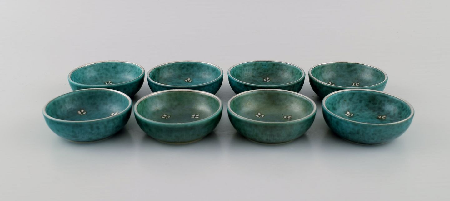 Wilhelm Kåge (1889-1960) for Gustavsberg. Eight small Argenta bowls in glazed ceramics. Beautiful glaze in shades of green with silver inlay in the form of leaves. Mid 20th century.