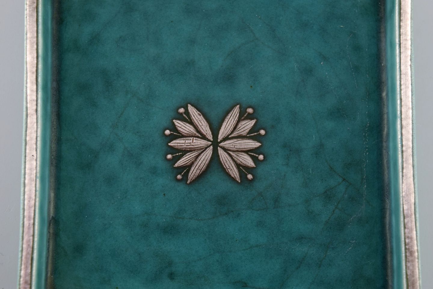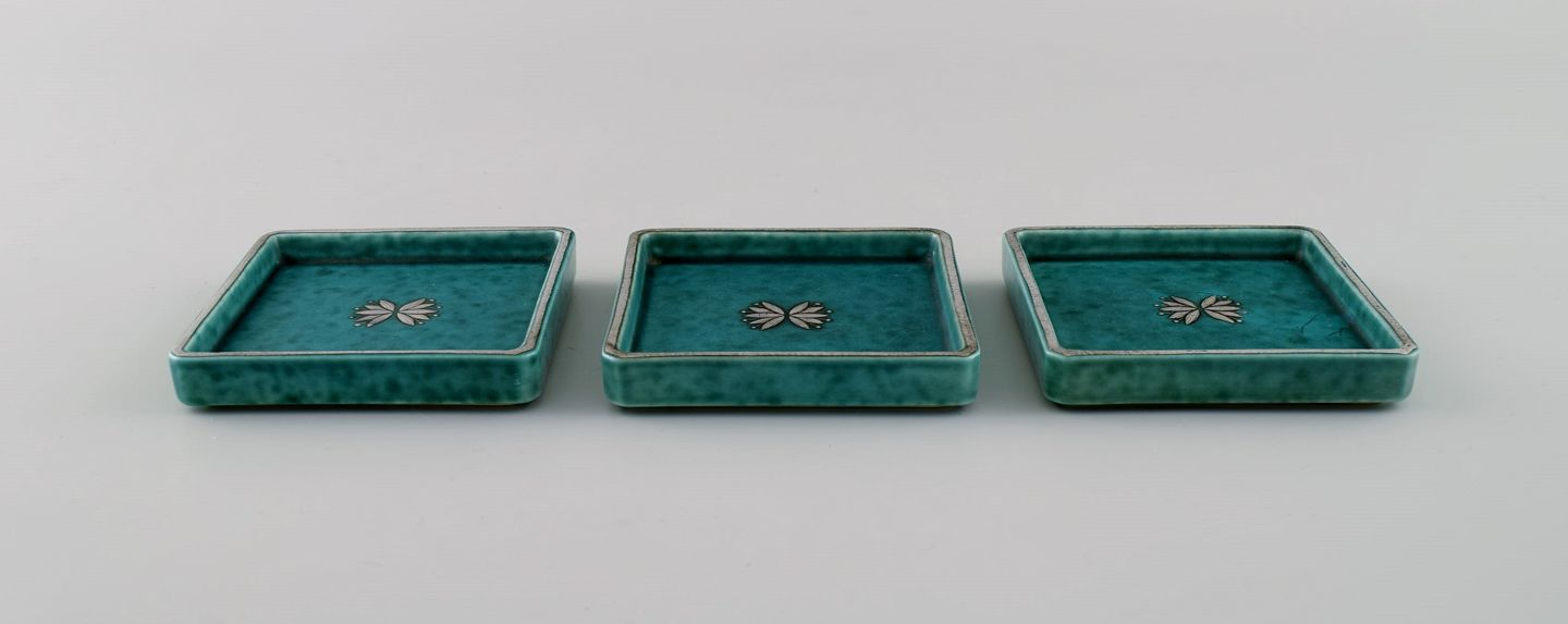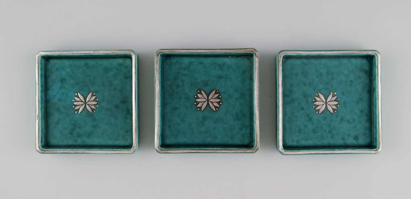 Wilhelm Kåge (1889-1960) for Gustavsberg. Three Argenta art deco dishes in glazed ceramics. Beautiful glaze in shades of green with silver inlay. 1940s.