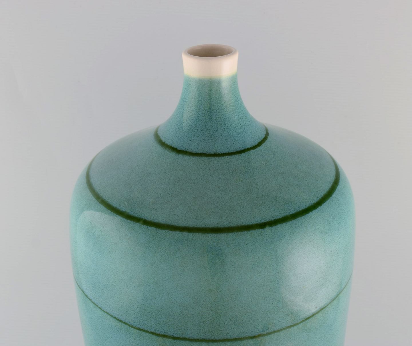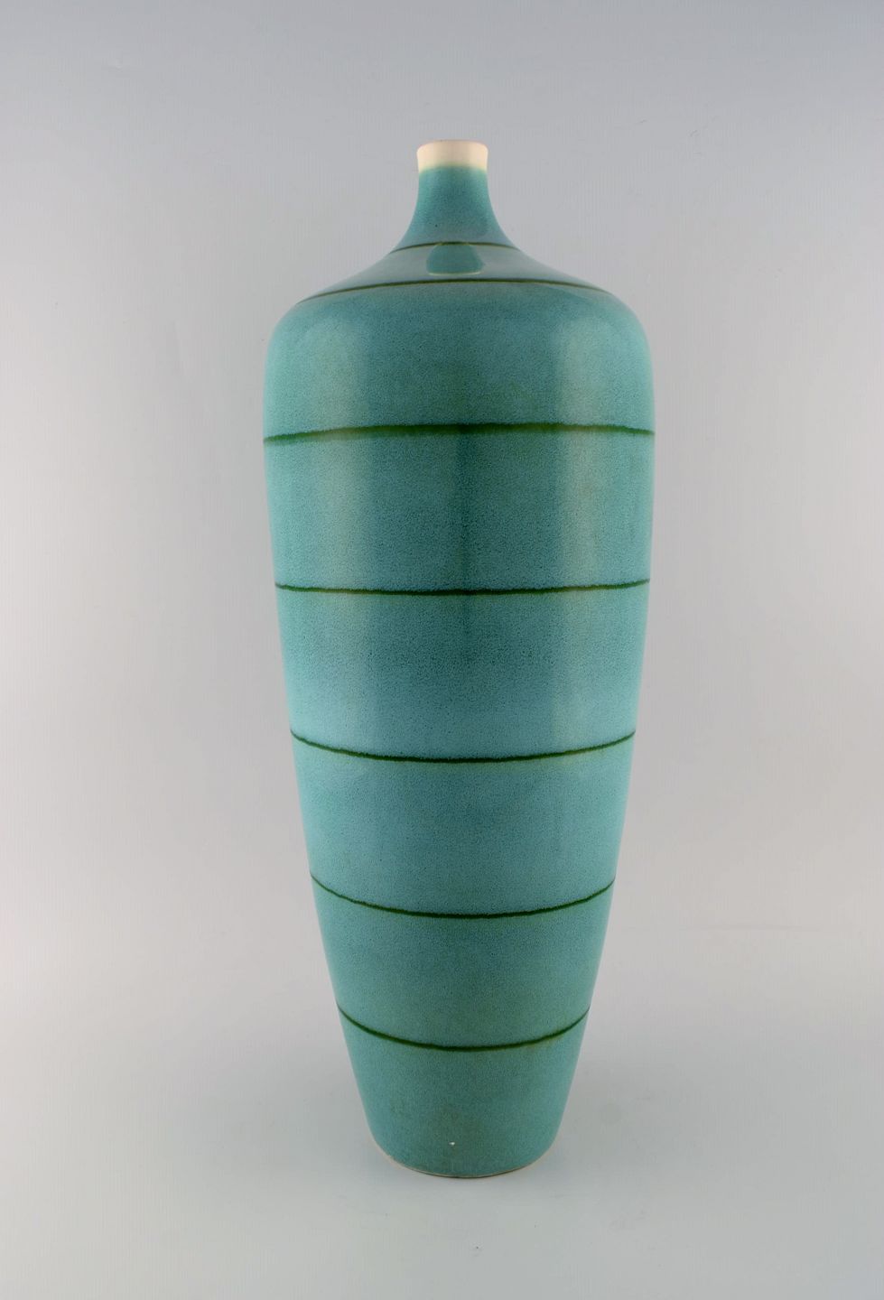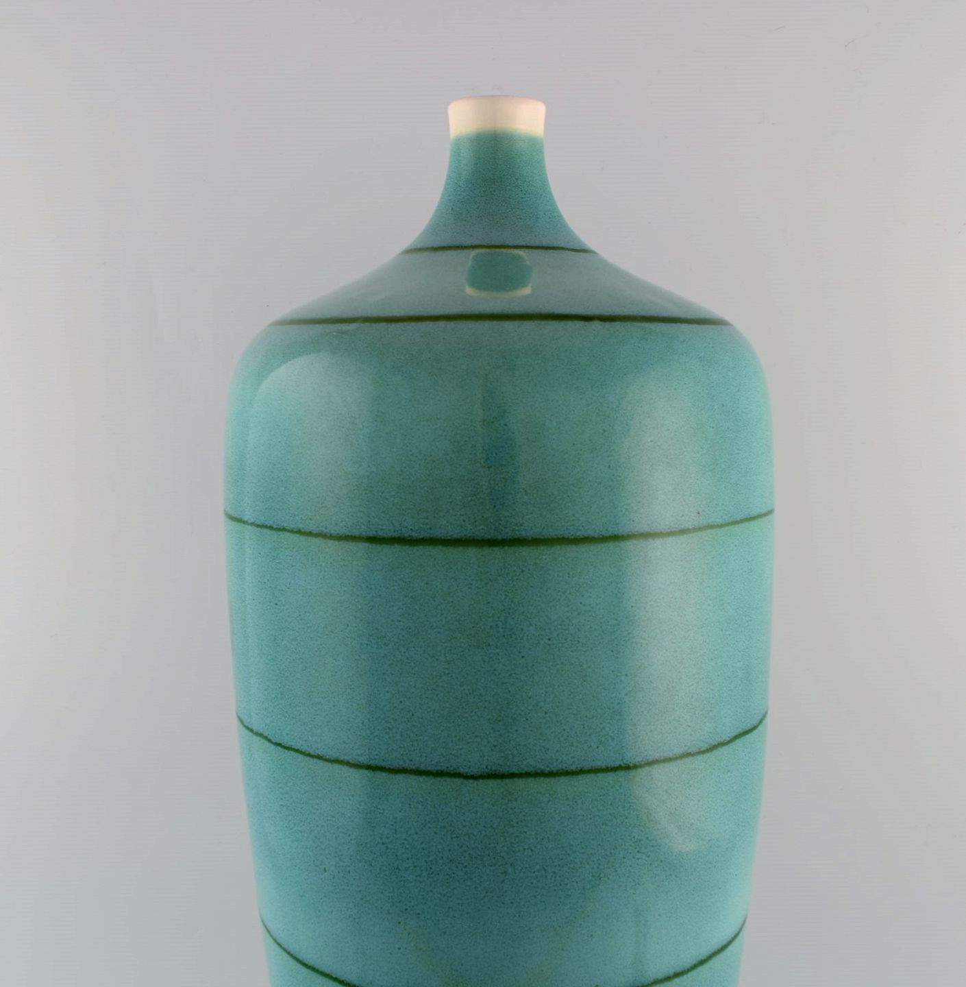 European studio ceramicist. Large floor vase in glazed ceramics. Beautiful glaze in turquoise shades. Late 20th century.