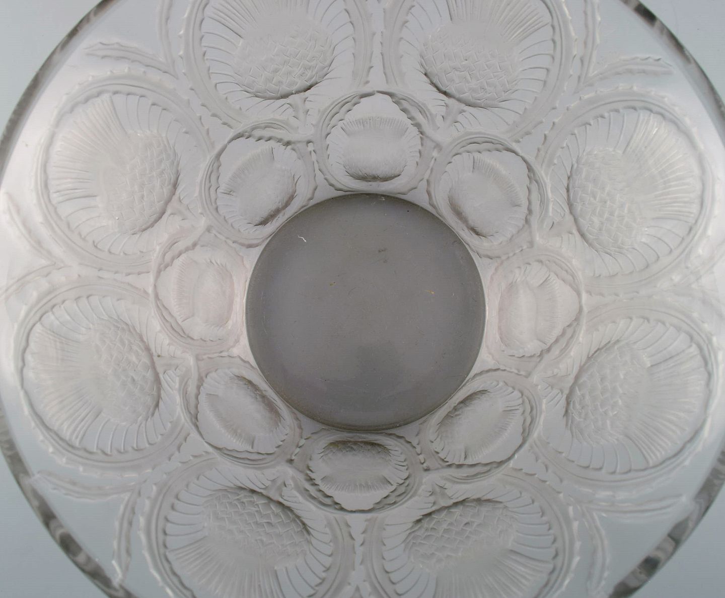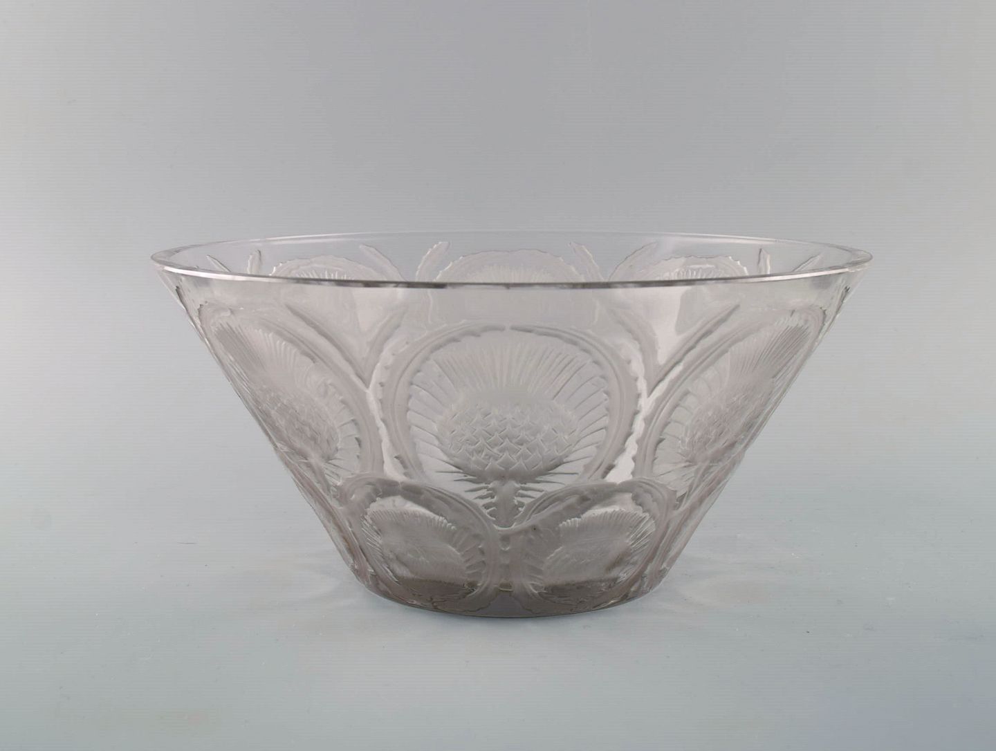 René Lalique art deco bowl in clear mouth blown art glass with incised flowers. Mid-20th century.