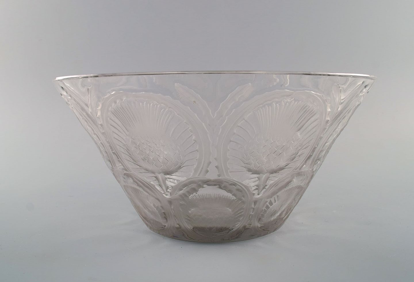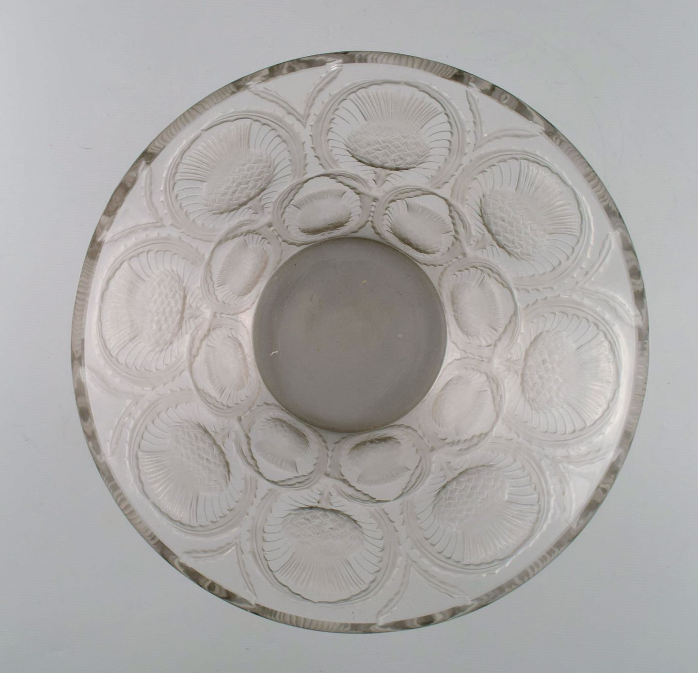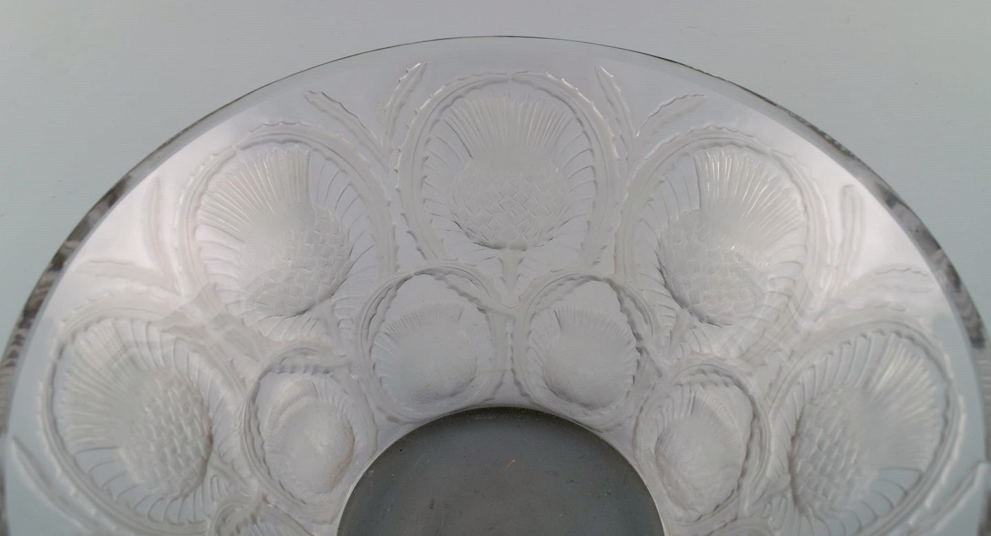 René Lalique art deco bowl in clear mouth blown art glass with incised flowers. Mid-20th century. Measures: 25.5 x 12 cm. In excellent condition. Stamped.