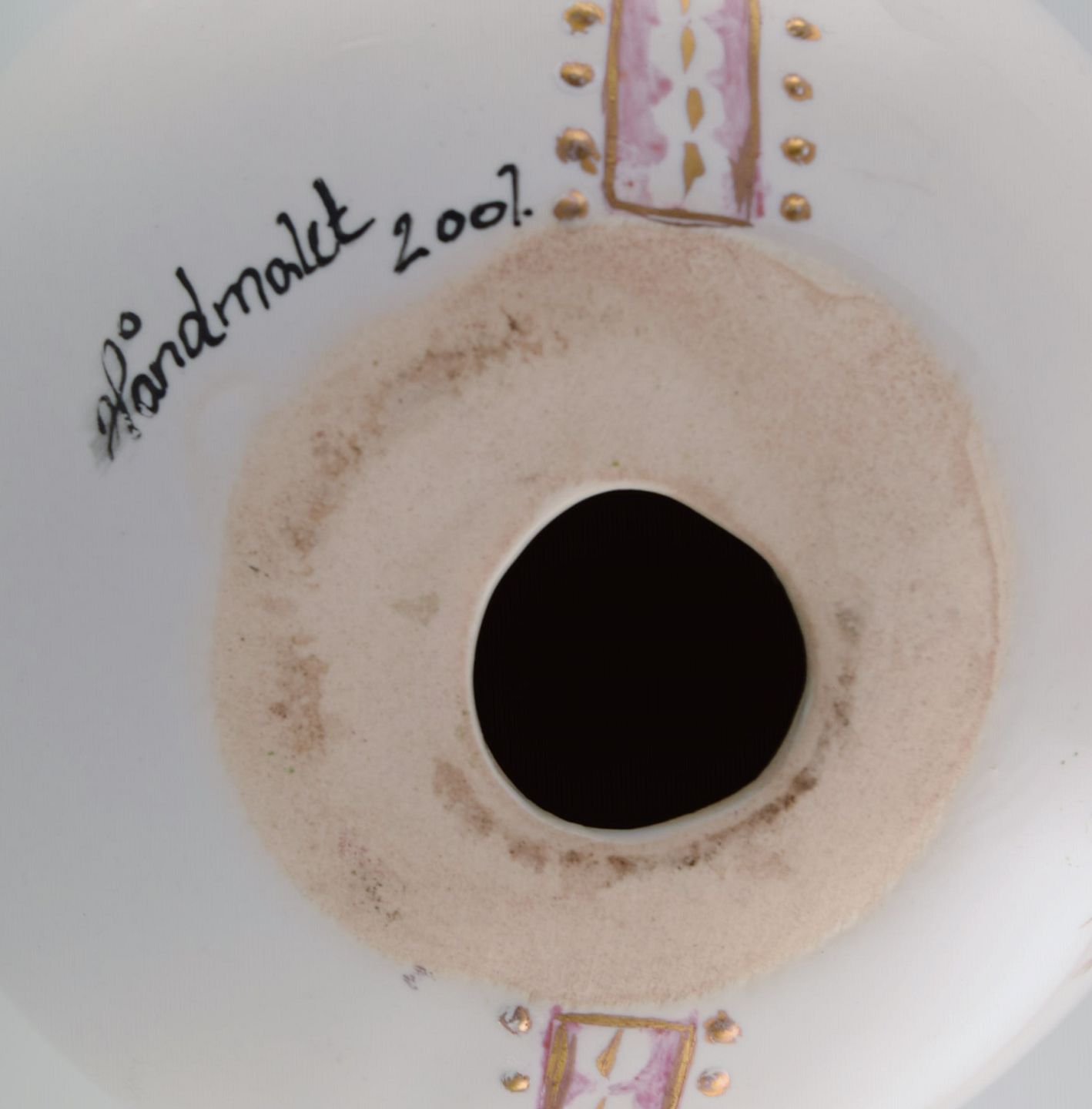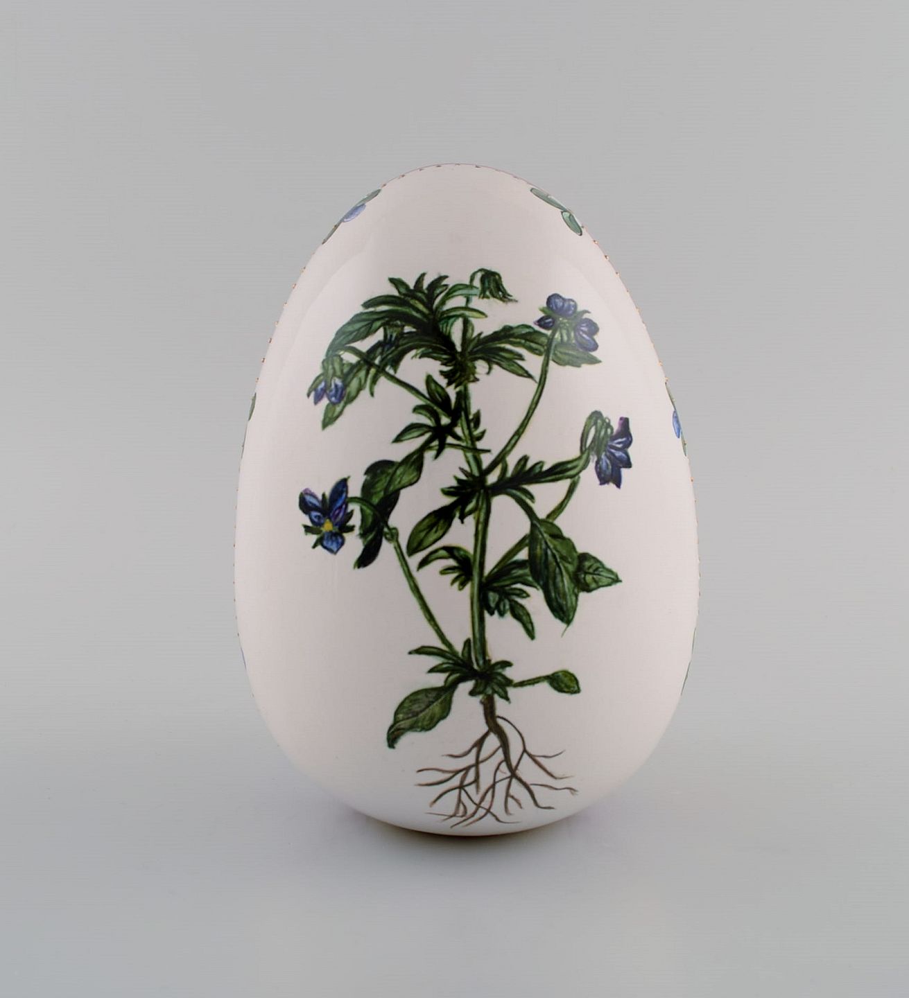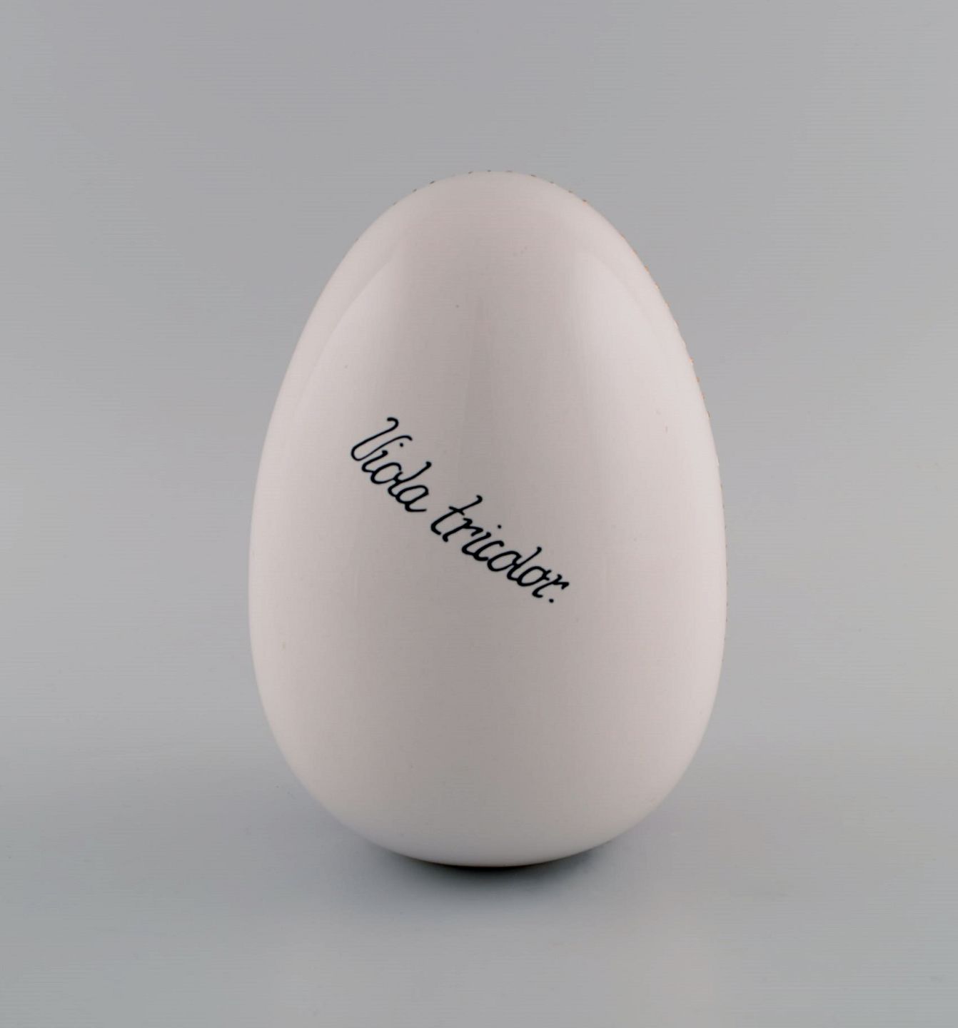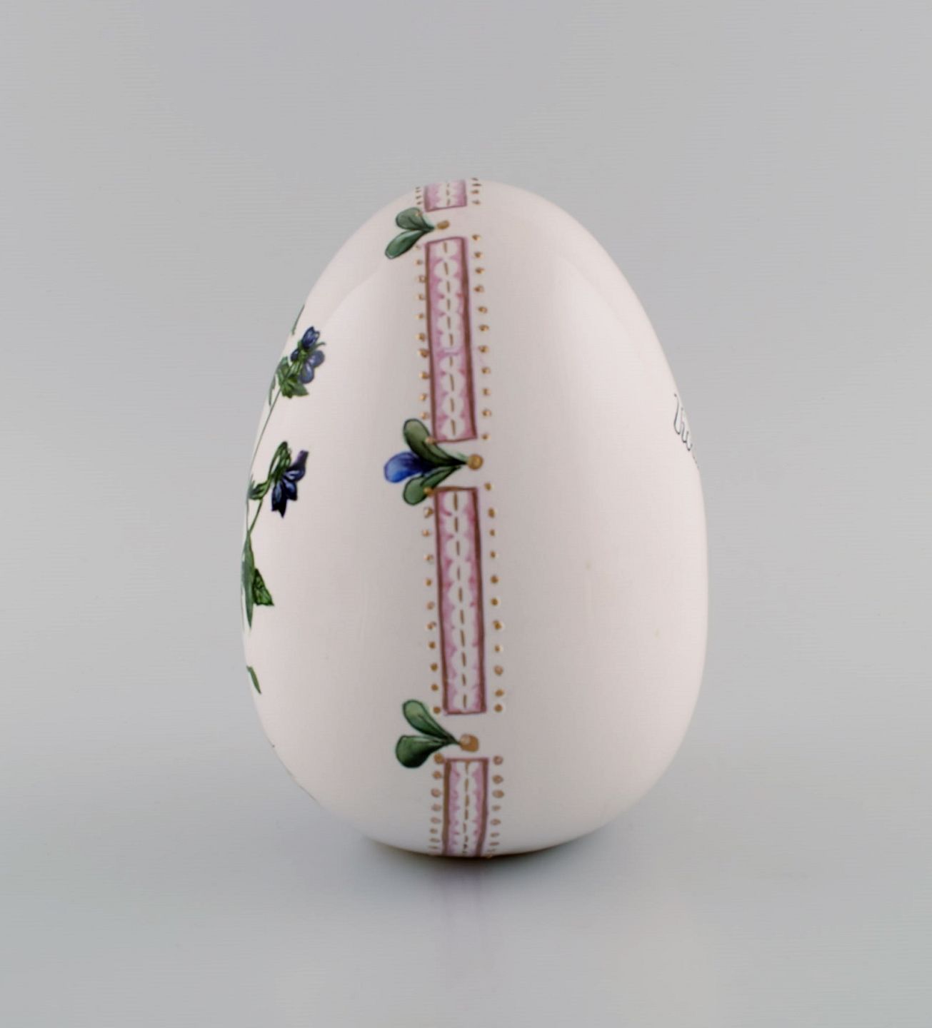 Æg i porcelæn. Håndmalede blomster, guld- og lyserød dekoration. Flora Danica stil. Dateret 2001.