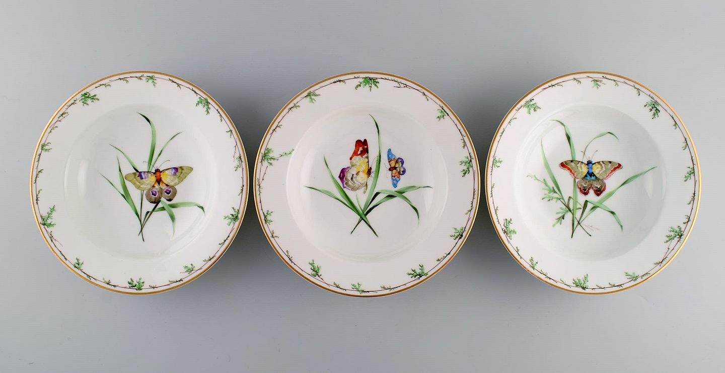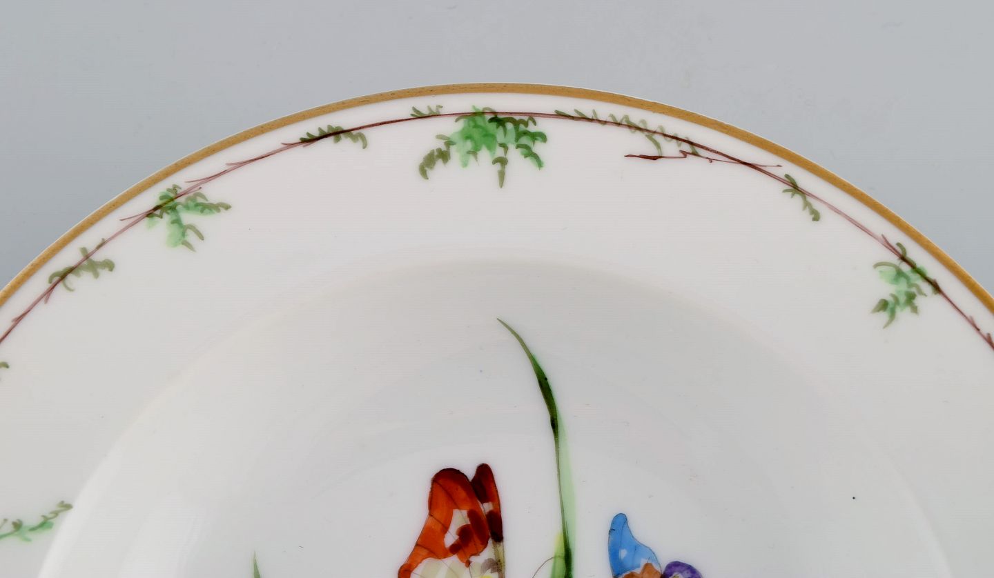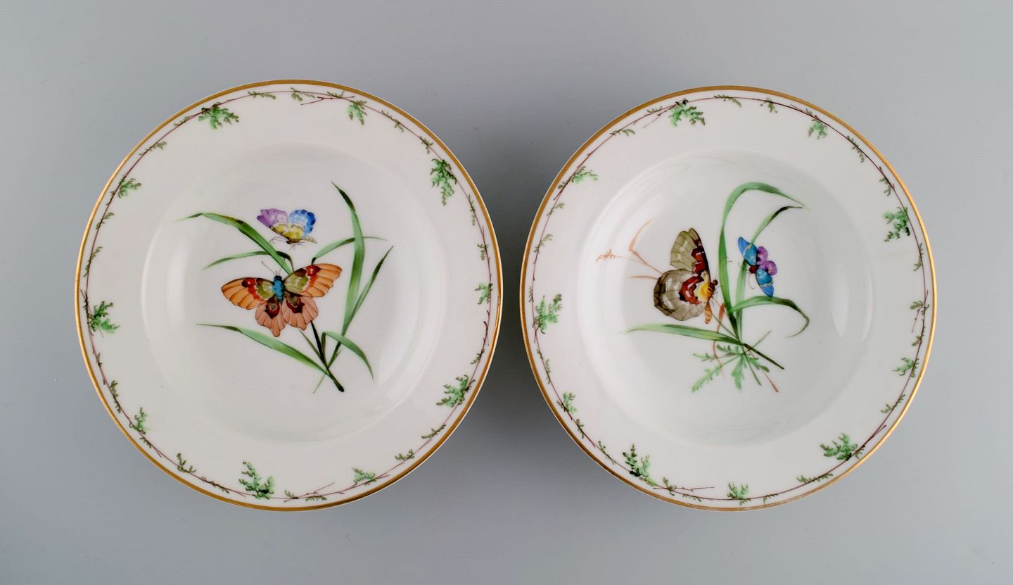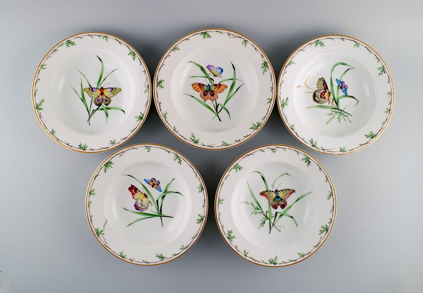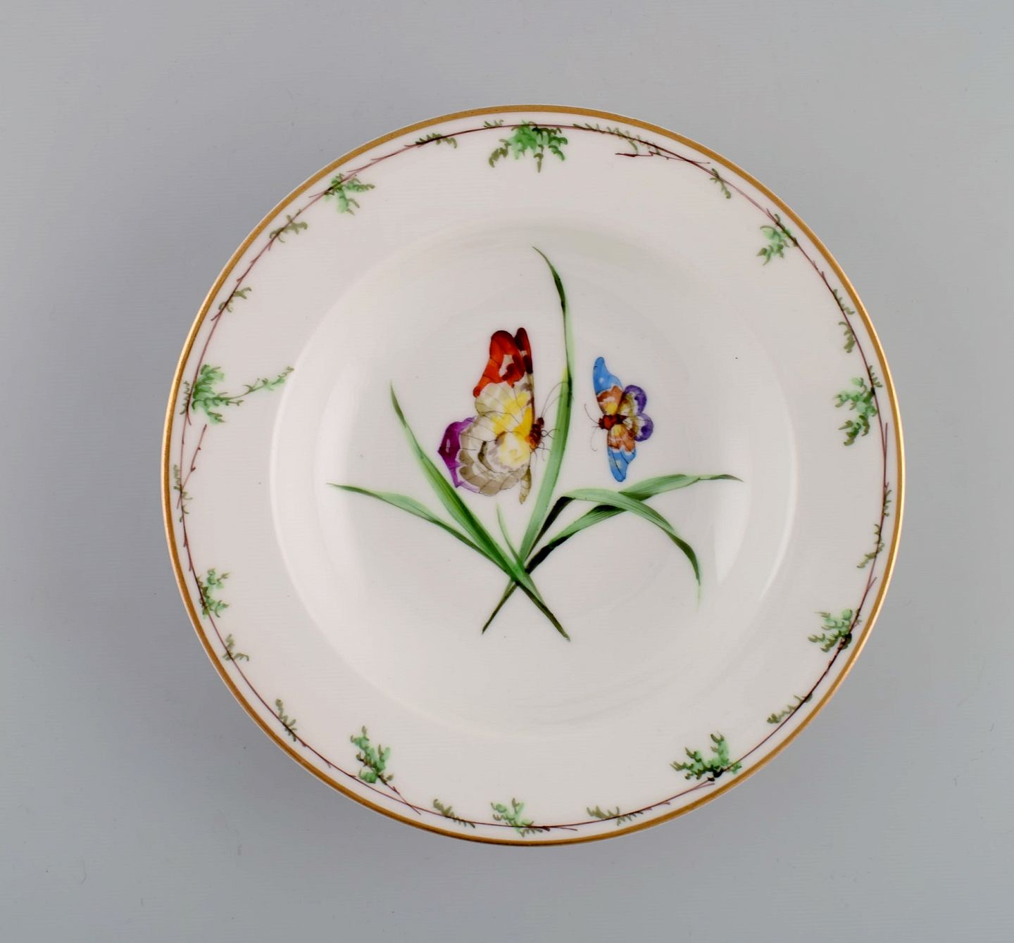 Five antique Royal Copenhagen deep plates in porcelain with hand-painted flowers, butterflies and gold edge. Mid-19th century. Measures: 23.3 x 5 cm. In excellent condition. Stamped.