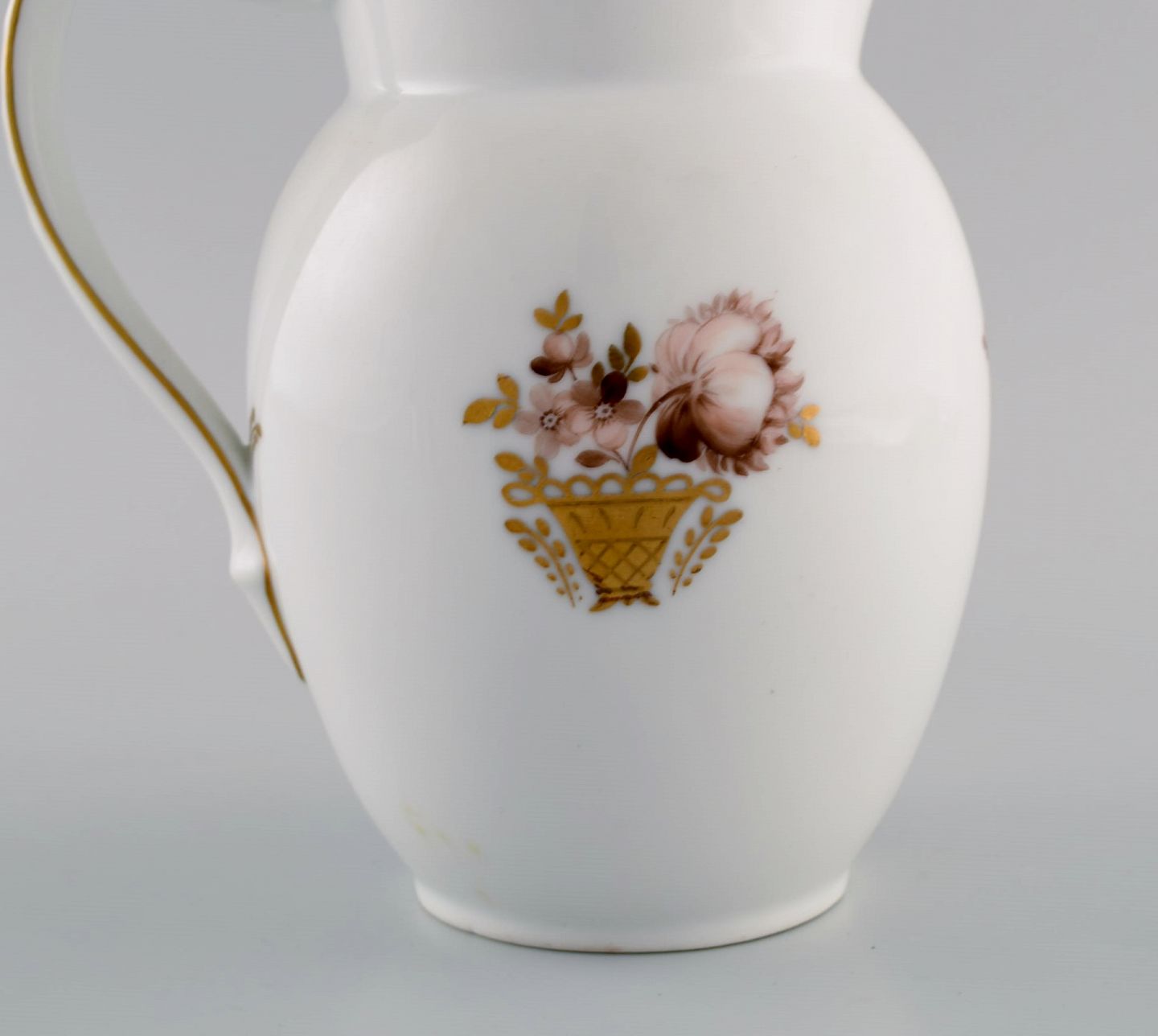 Royal Copenhagen Guldkurv kande i porcelæn med blomster og gulddekoration. Modelnummer 595/9087. Tidligt 1900-tallet. Måler: 17,5 x 16 cm. I flot stand. Stemplet. 1. Sortering.
