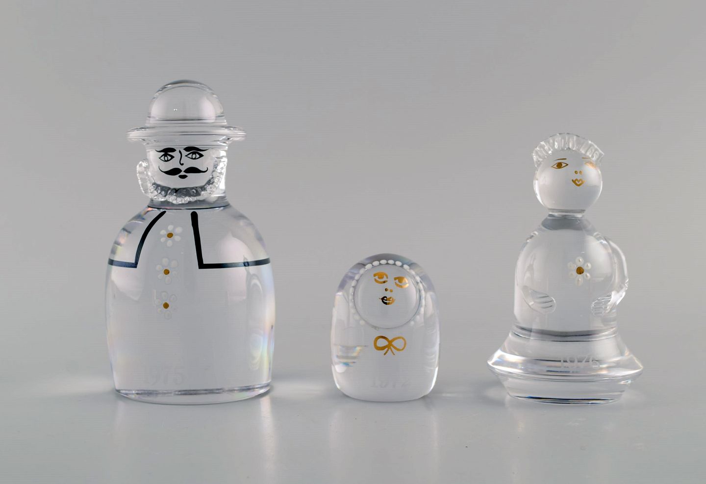 Kosta Boda, Sverige. Tre kunstglas figurer med graveret og håndmalet dekoration. "Familien". 1970'erne. Største måler: 12 x 6,5 cm. Mærket med årstal. I perfekt stand.