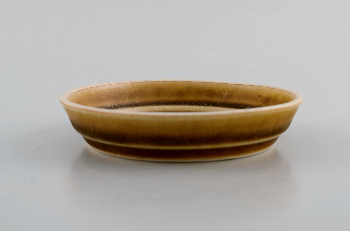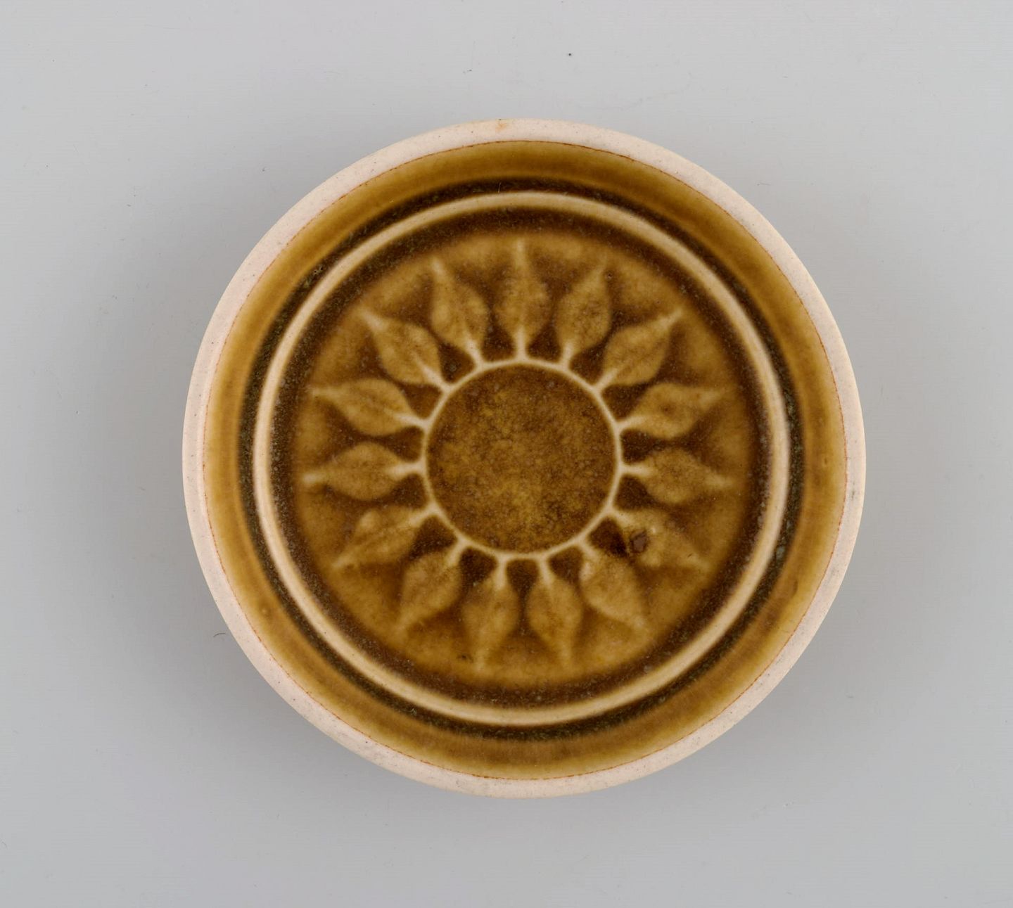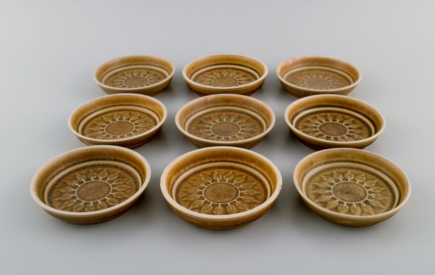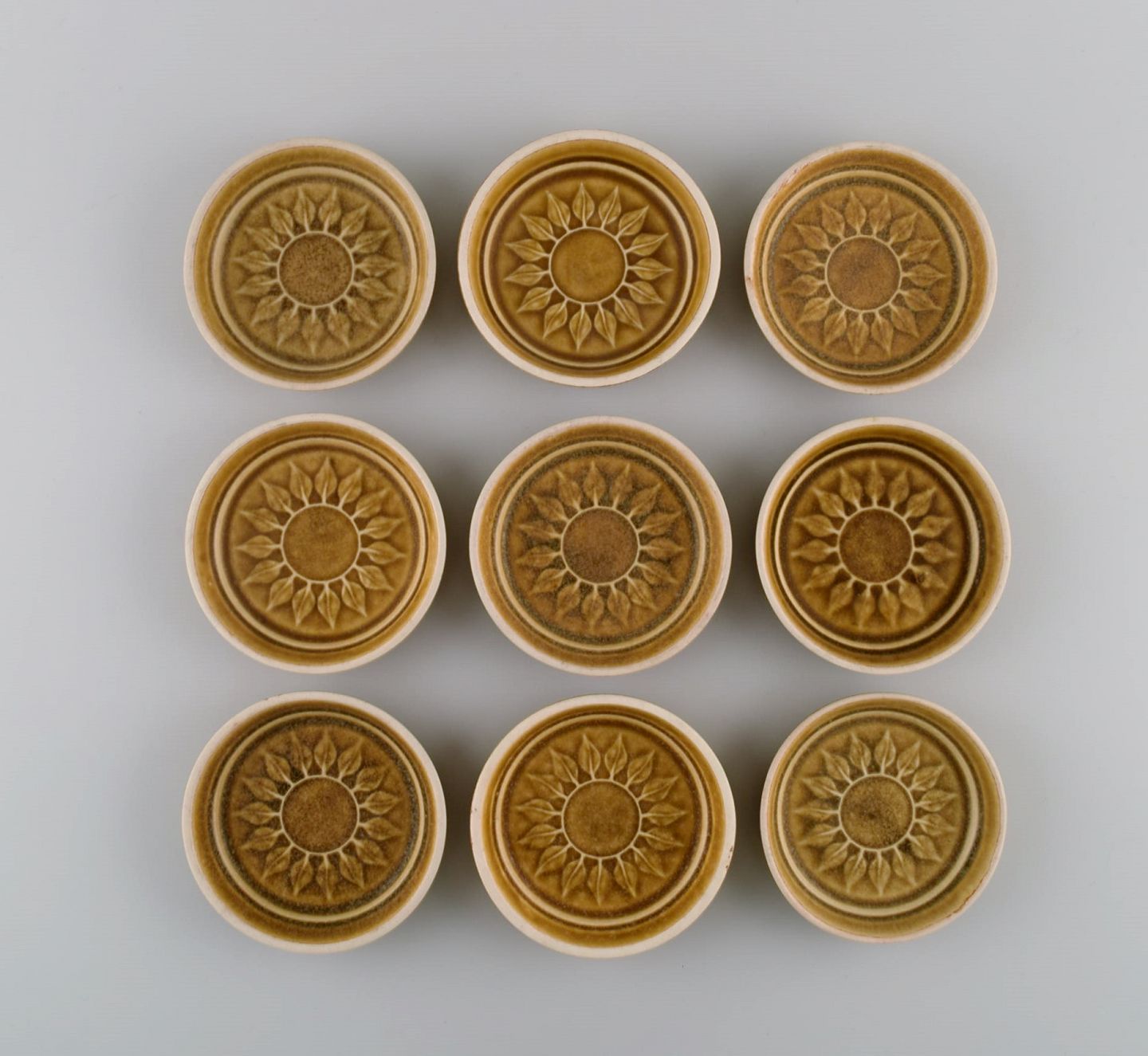 Jens H. Quistgaard (1919-2008) for Bing & Grøndahl / Nissen Kronjyden. 9 Relief skåle / flaskebakker i glaseret stentøj. Smuk glasur i sennepsgule nuancer. 1960'erne.
