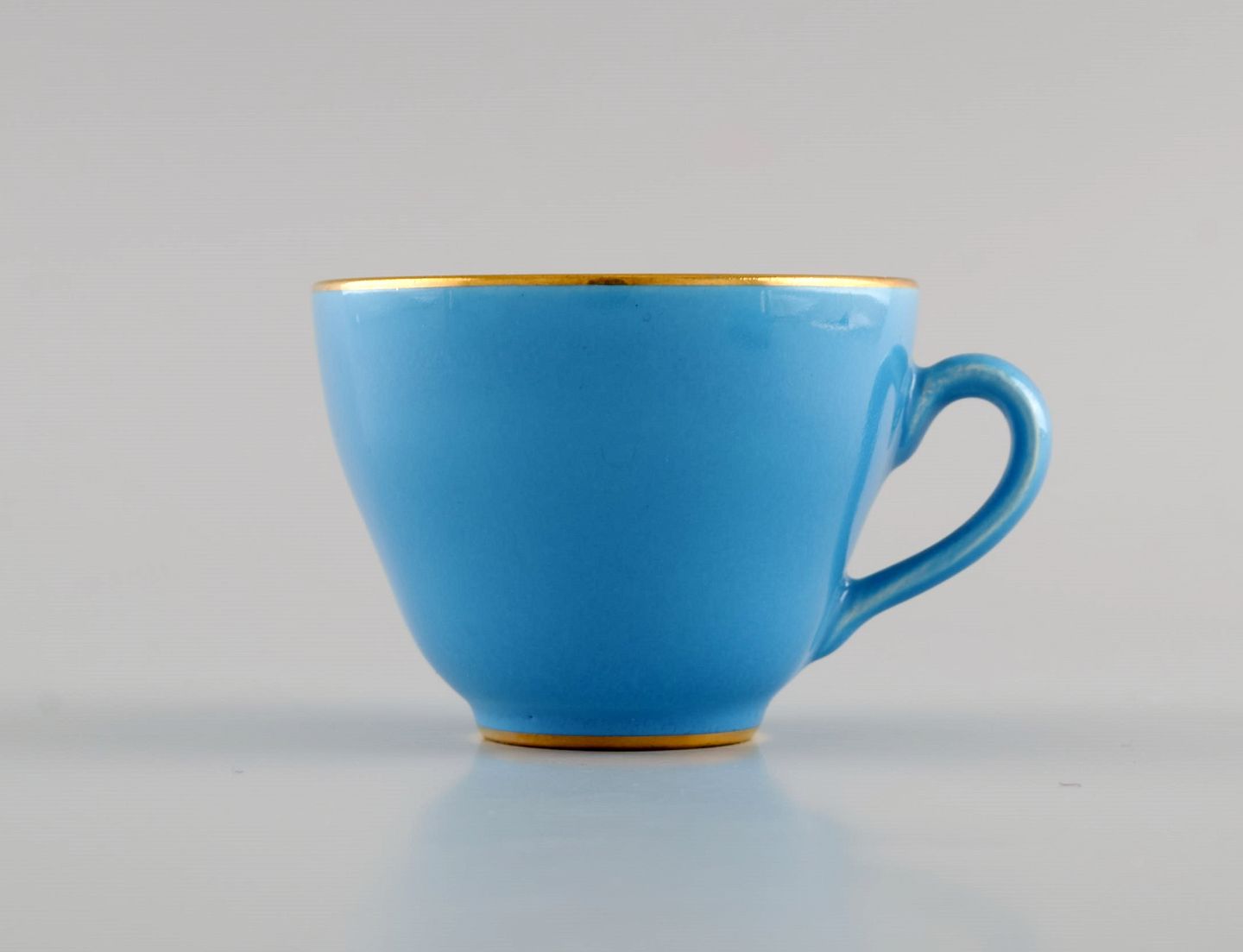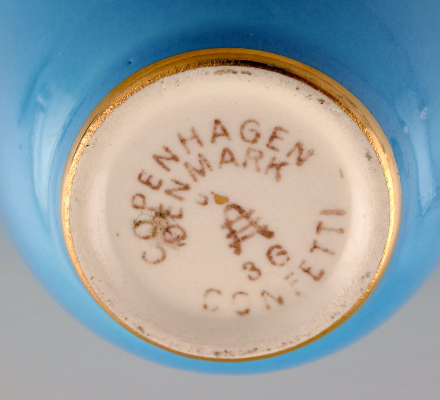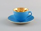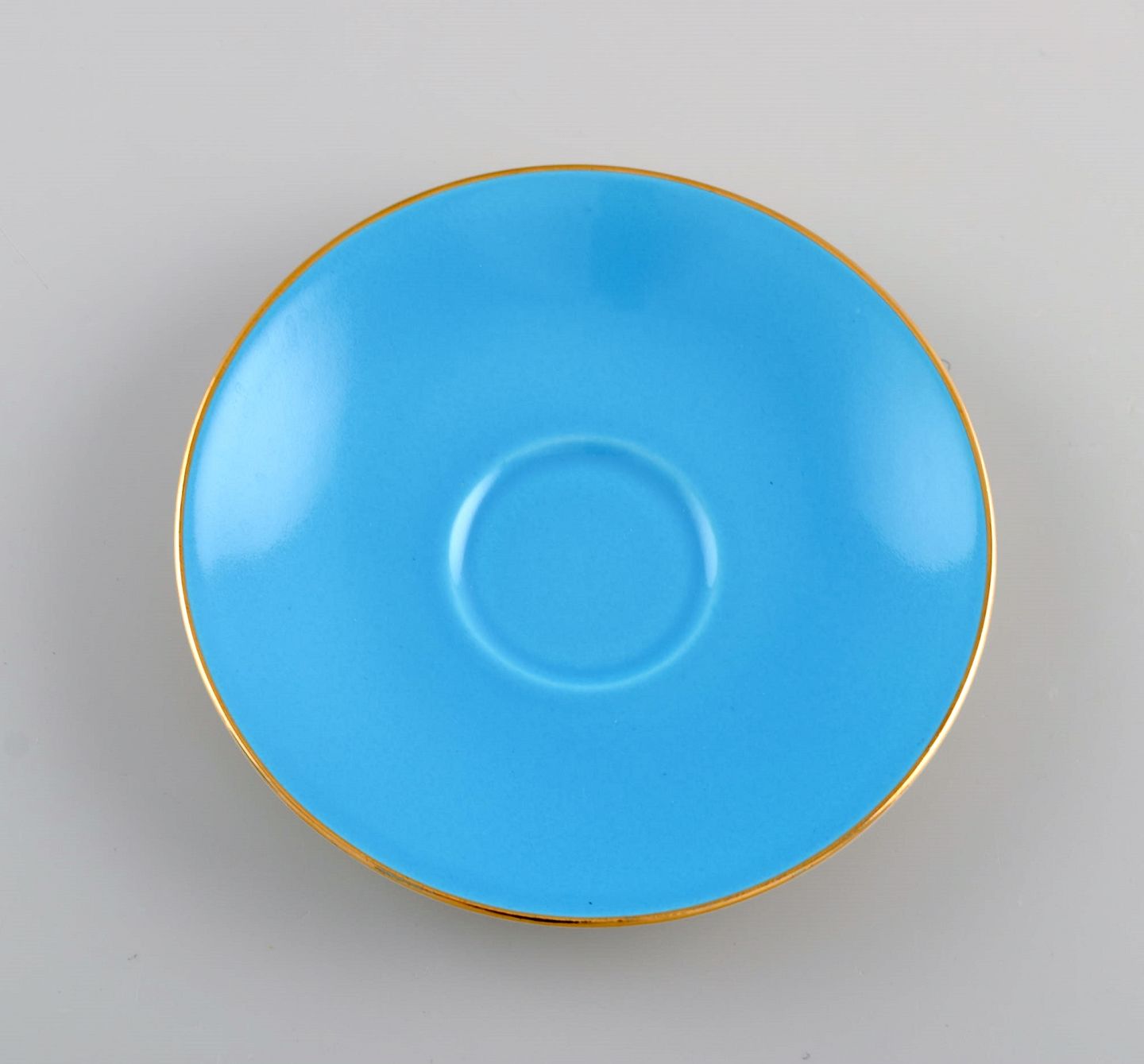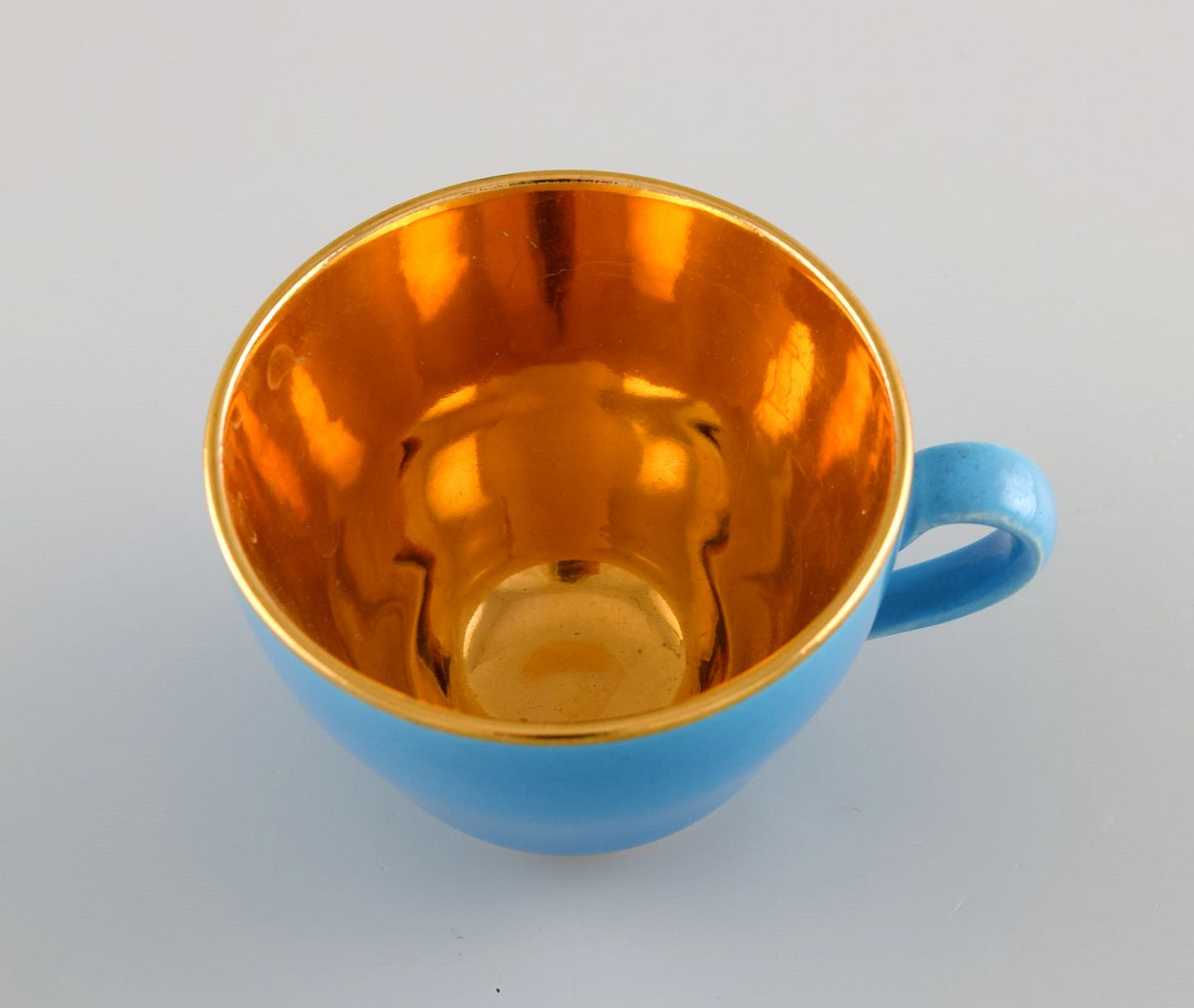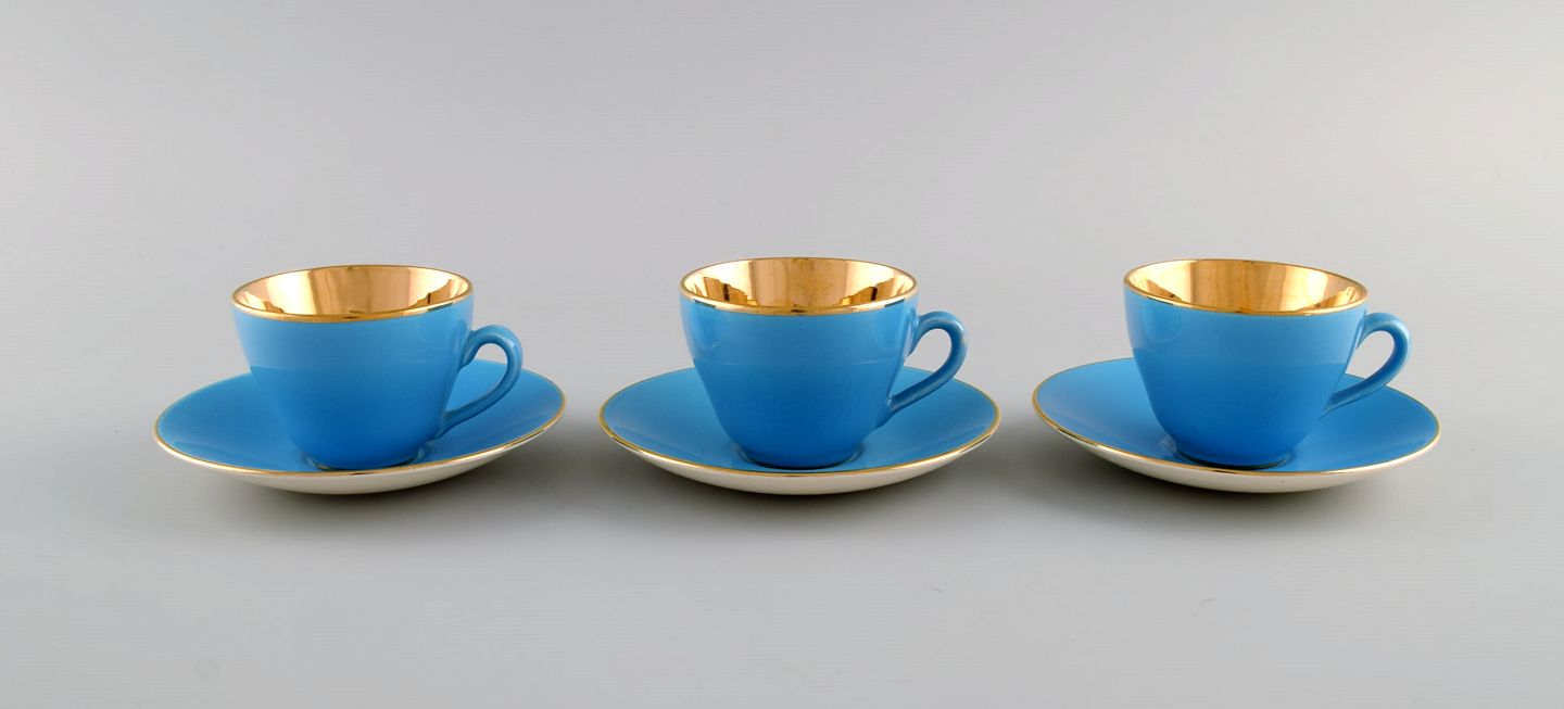 Tre Royal Copenhagen / Aluminia Confetti mokkakopper med underkopper i blåglaseret fajance med indvendig guld. Midt 1900-tallet.