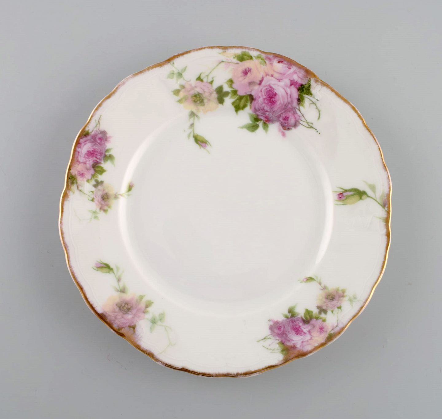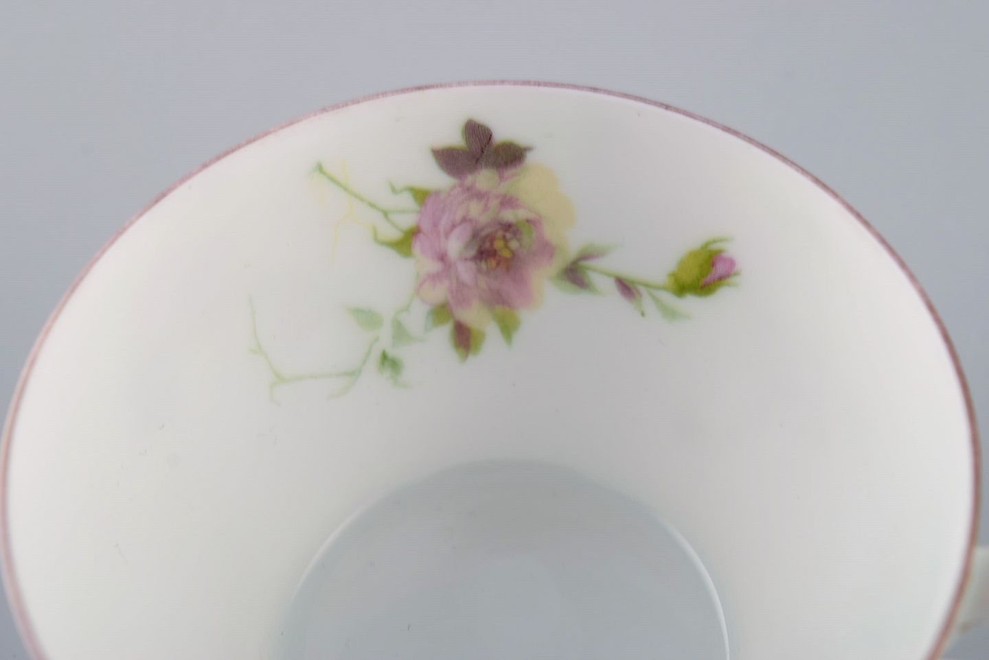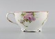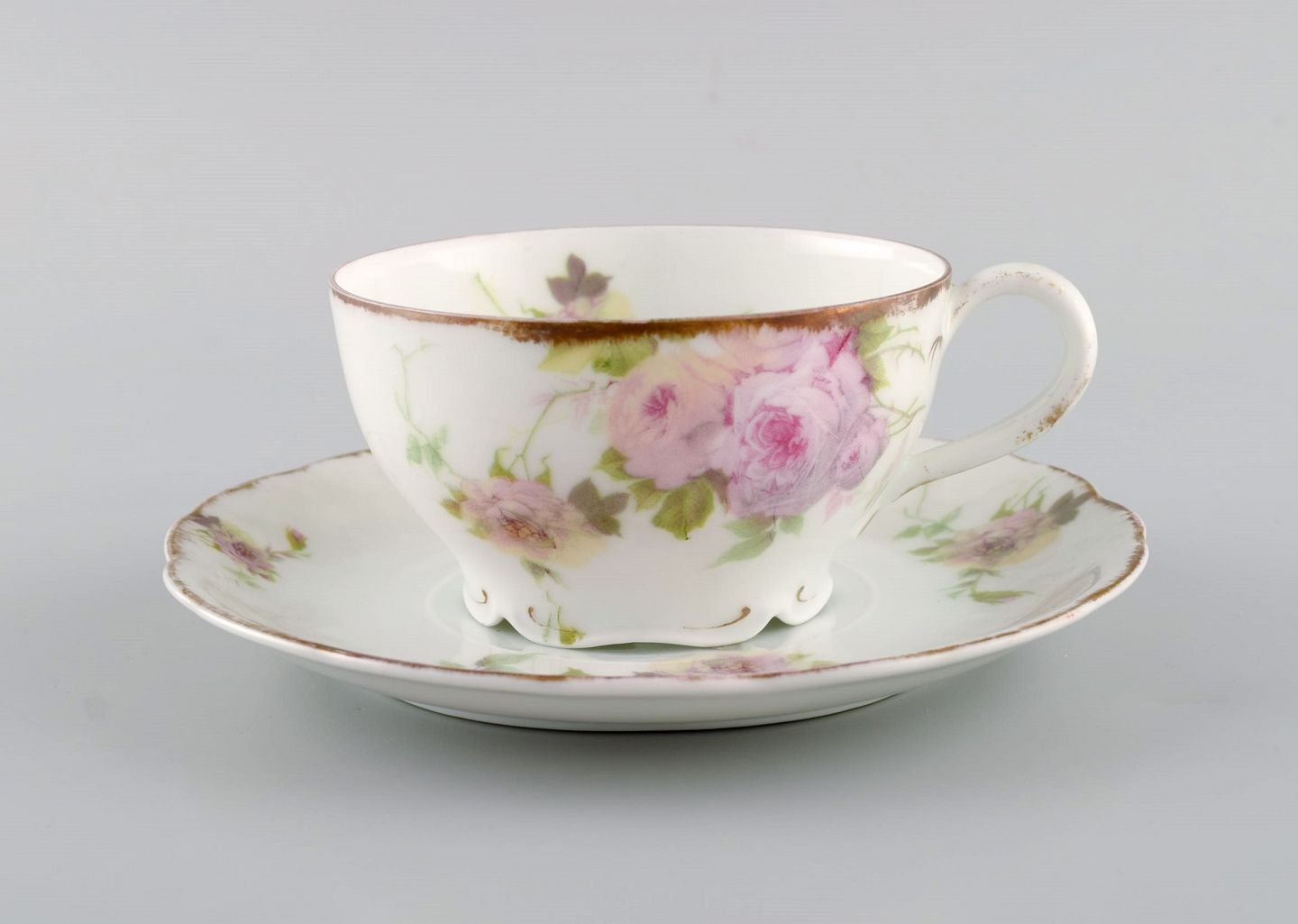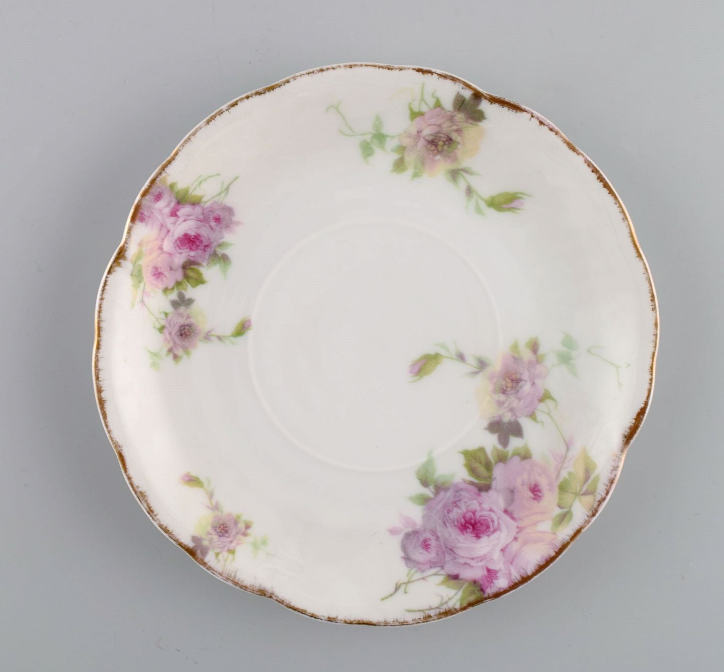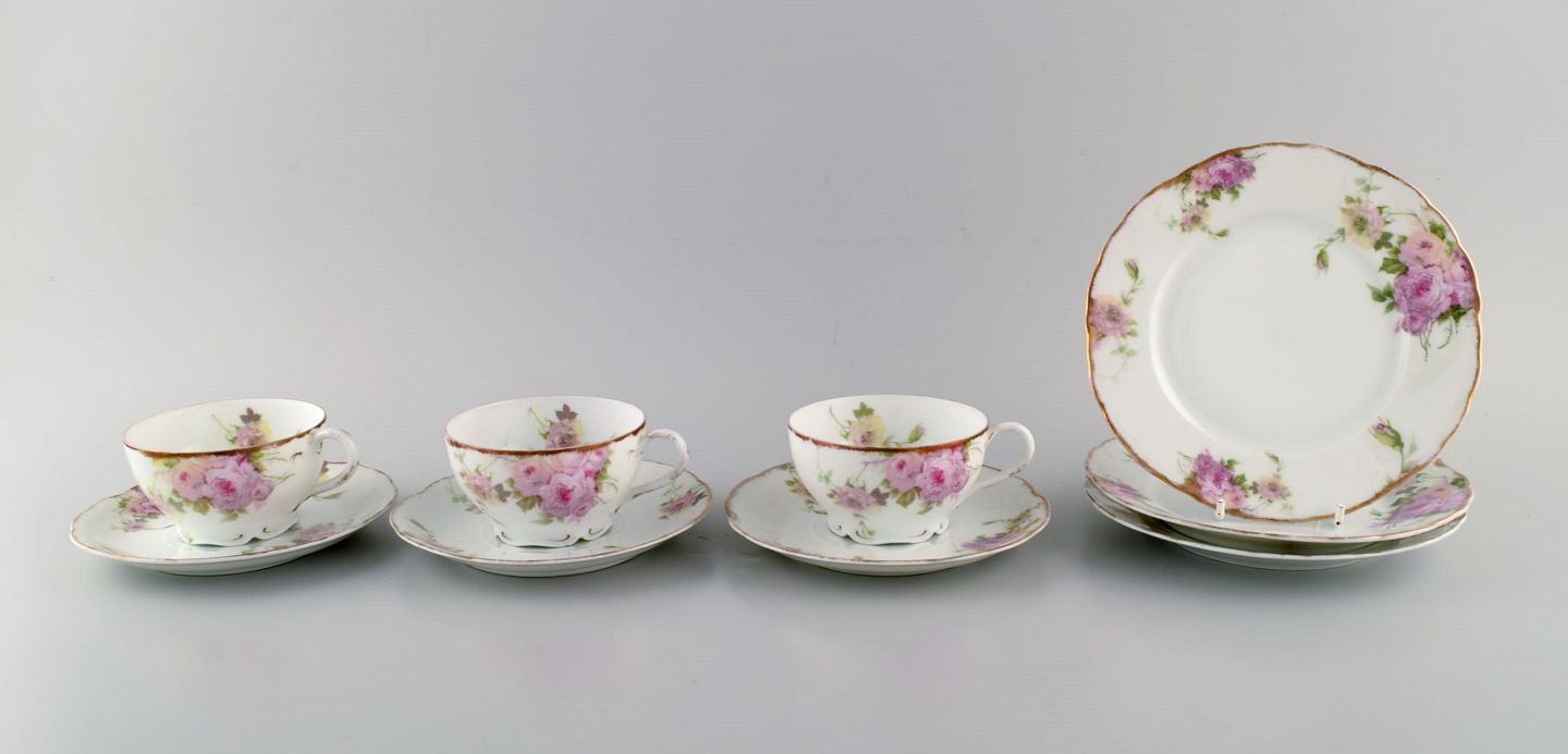 Bestående af tre tekopper med underkopper og tre tallerkener i håndmalet porcelæn med blomster og guldkant.