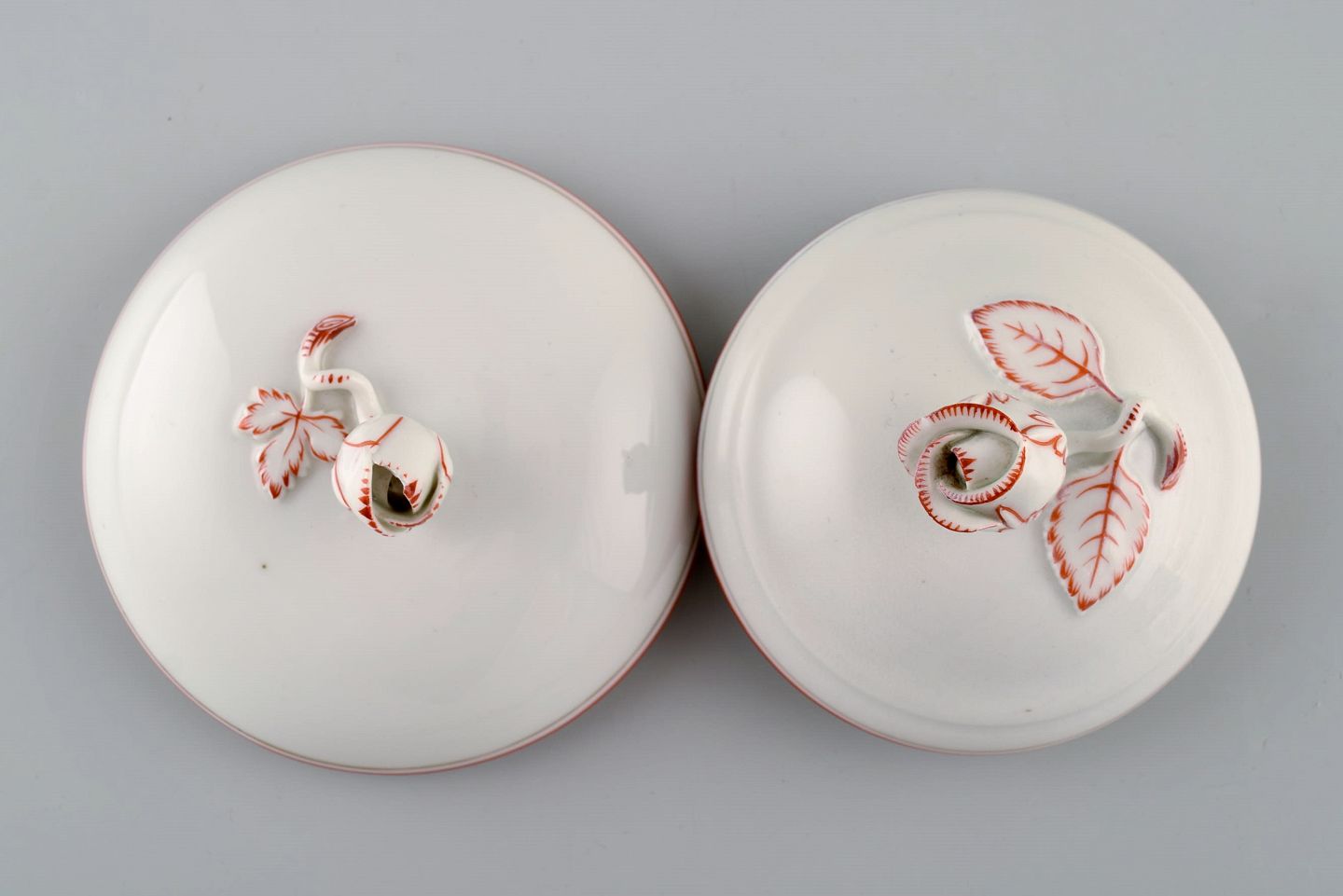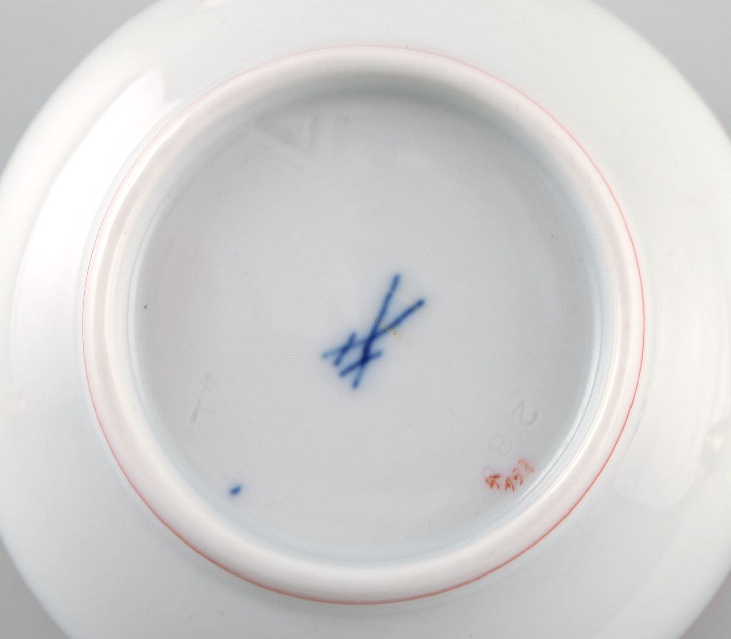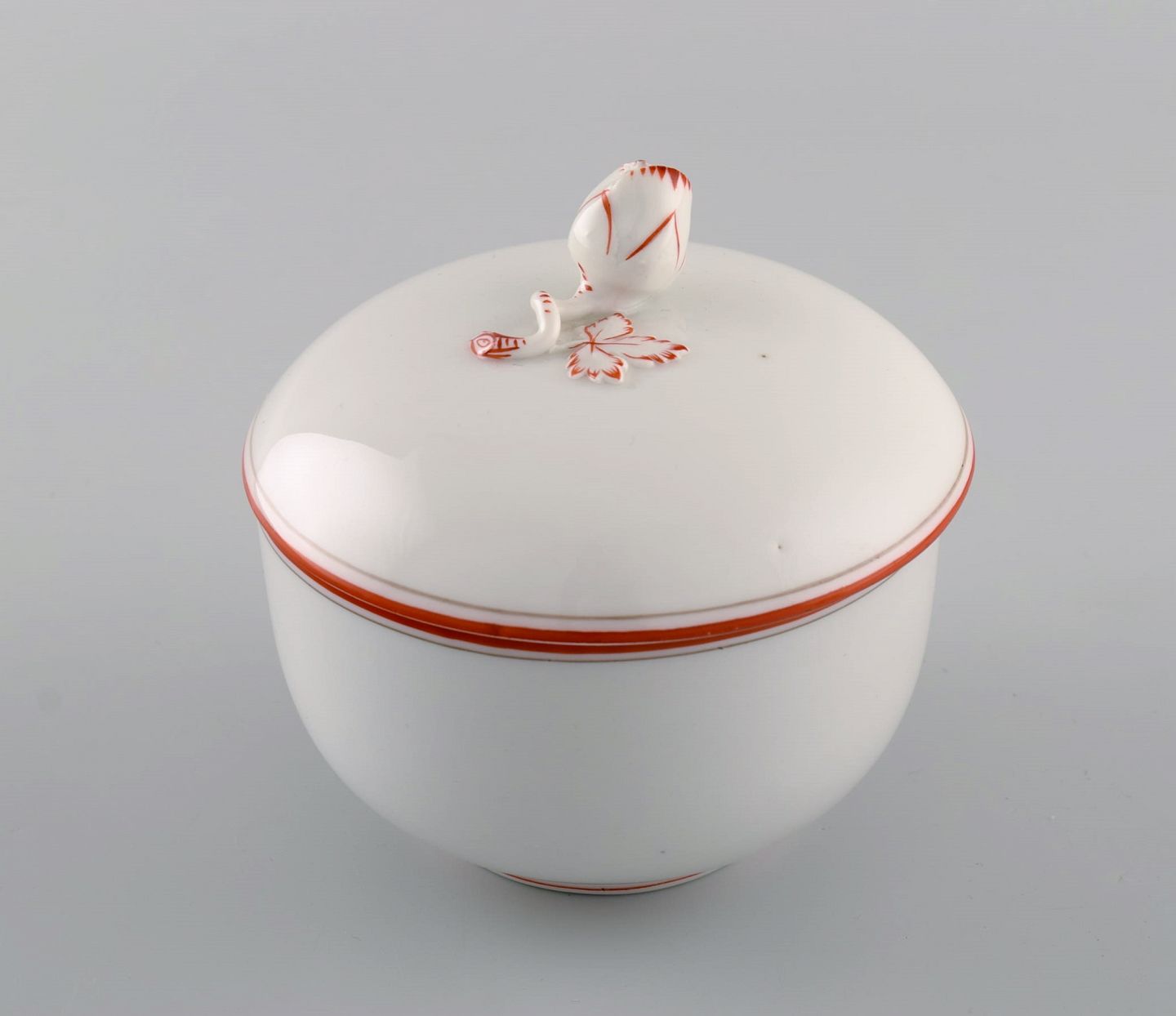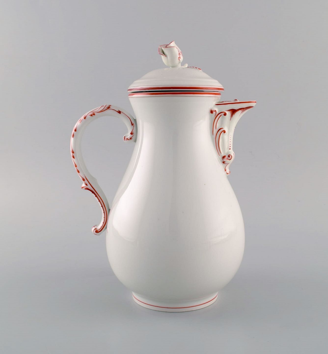 Meissen kaffekande og sukkerskål i håndmalet porcelæn. Låg modeleret med rosenknop. Ca. 1900.